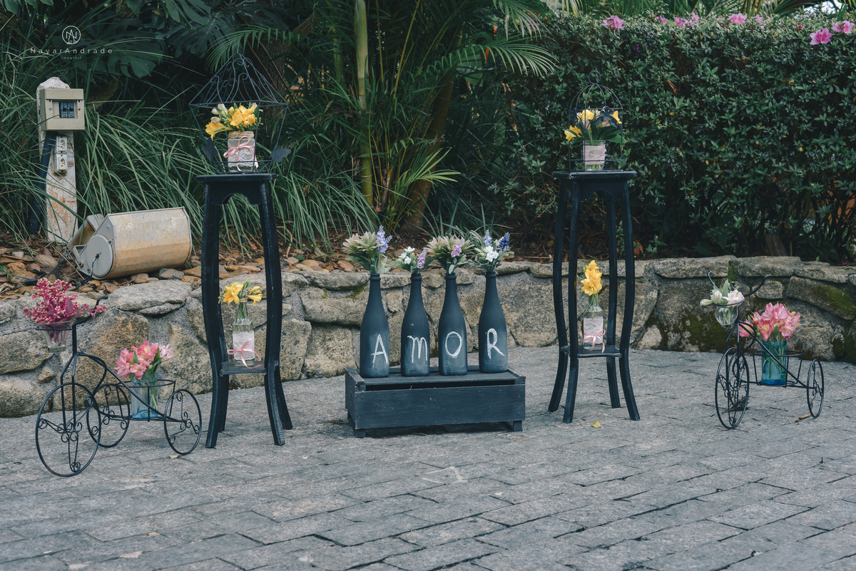 Certamente não! Pois Deus estava no controle de todas as coisas. Pertinho do horário de começar a chuva parou e conseguimos montar a cerimônia em um local melhor ainda, cercado por árvores e um lindo altar que serviu de cenário para os divertidos e apaixonados votos do casal.
