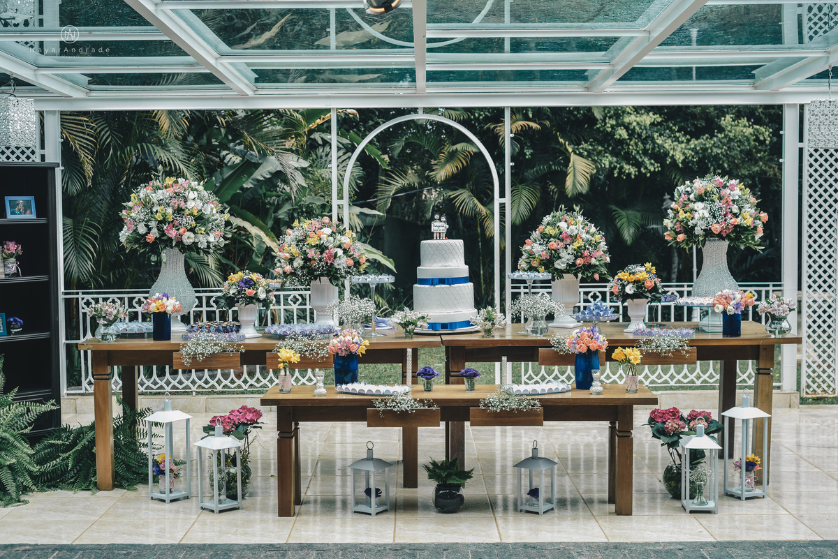Casamento ao ar livre no jardim do mombaça park em Itapecirica da Serra, buffet Monthez. Noiva com buque florido e noivo de terno azul e gravata lilas, casamento de dia e fotografia nayarandrade imagiart fotografa Nayara Andrade
