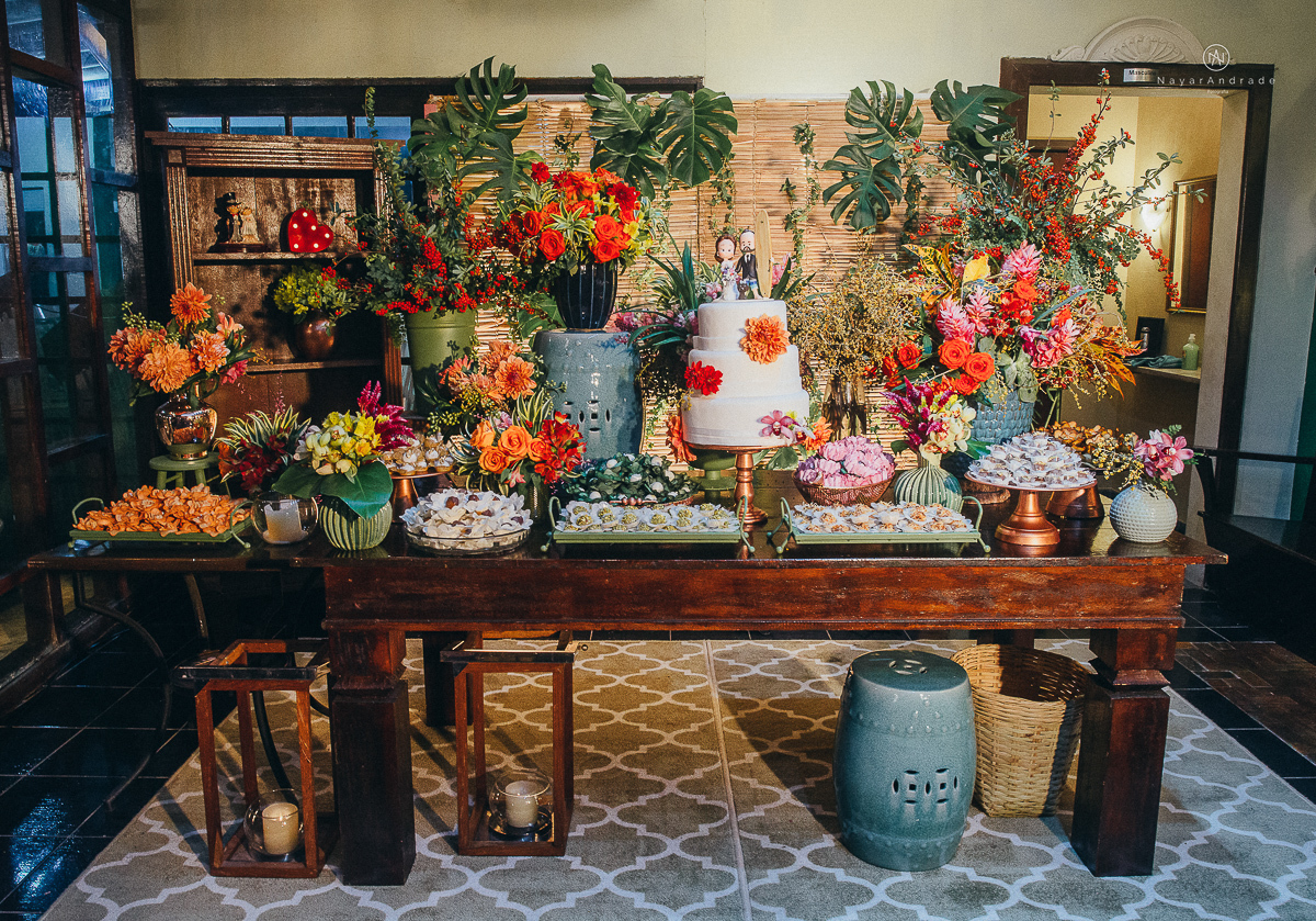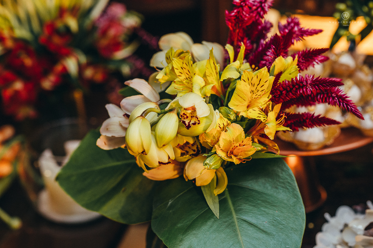 foto de decoracao no salao mansao da ilha em sao vicente flores tropicais coloridas e rustico