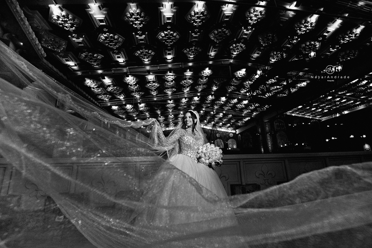 foto de noiva e seu veu em casaemtno no castelo