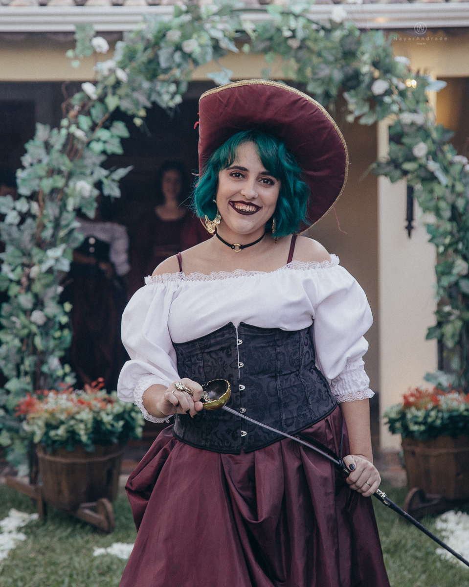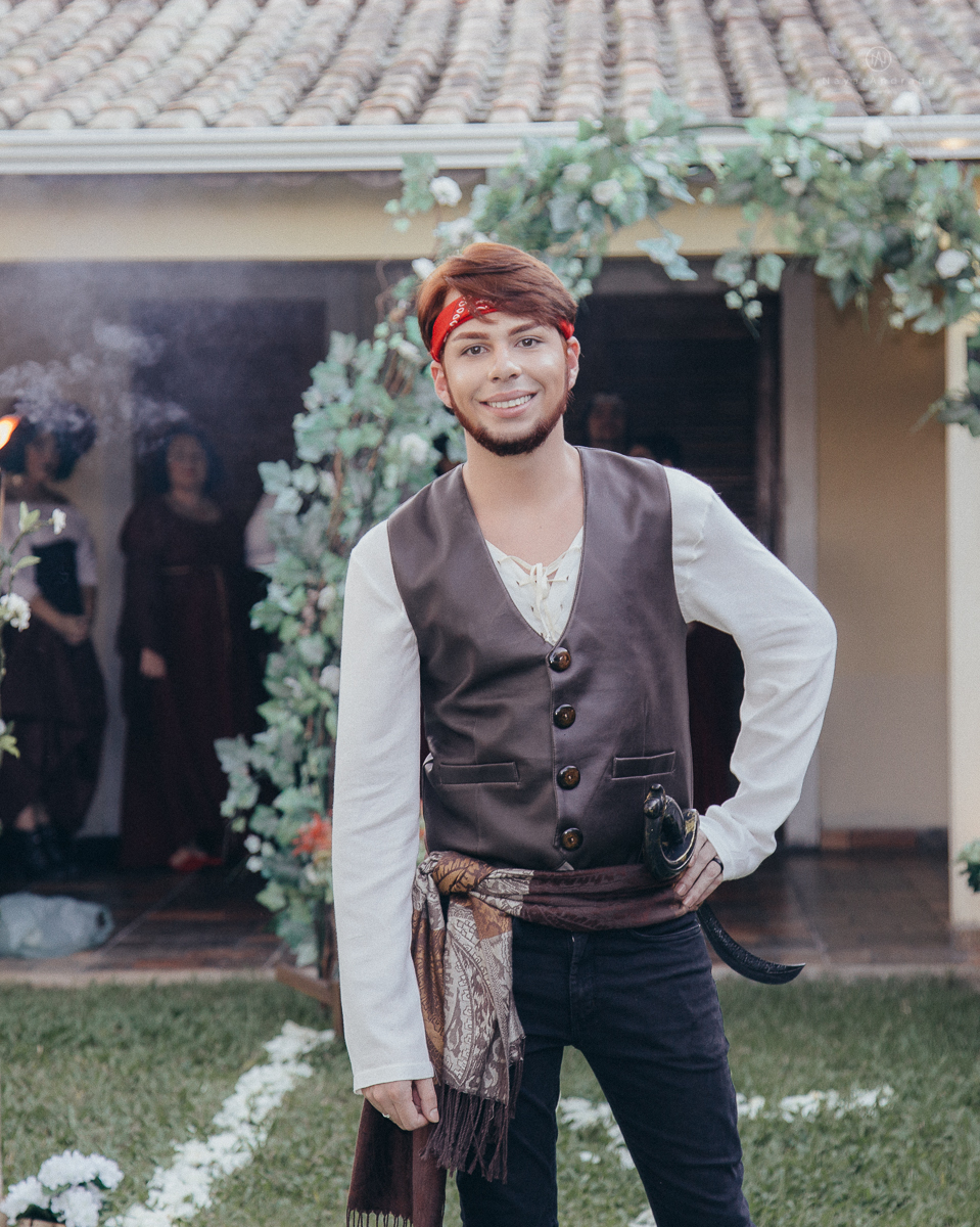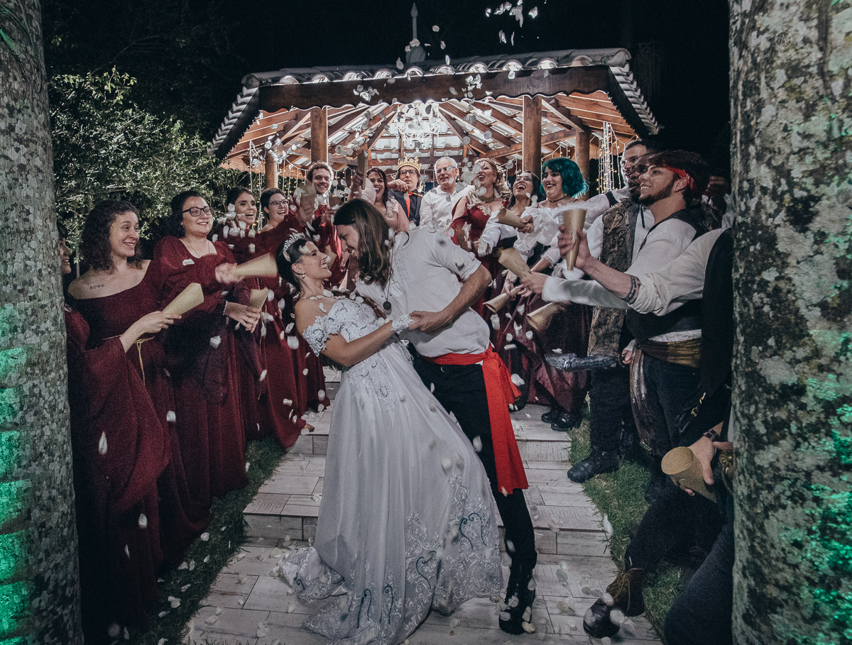 Casamento tematico com noivos e convidados de pirata e princesa