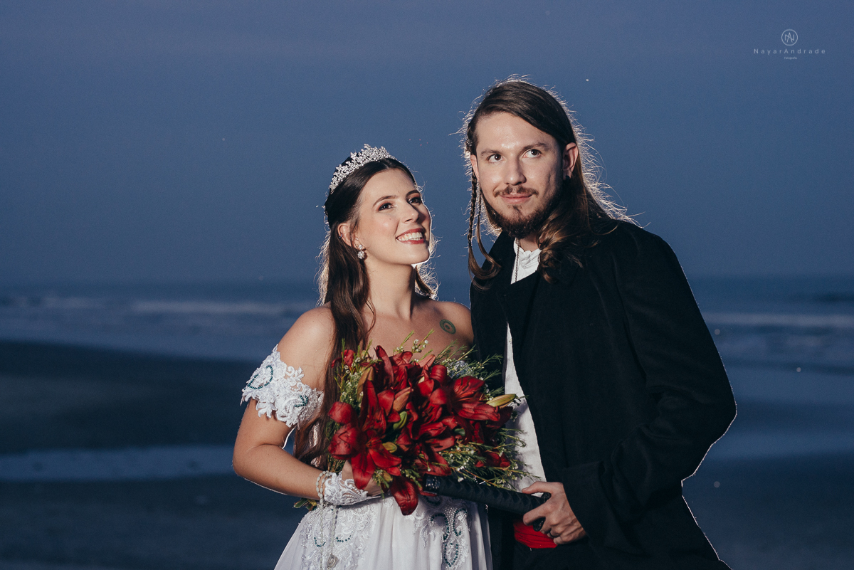 Fotos externas de casal na praia em casamento tematico de pirata e princesa. Fotos espontâneas artisticas e originais como ideia de fotos de casamento