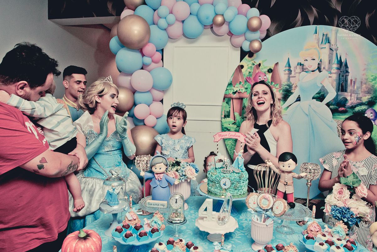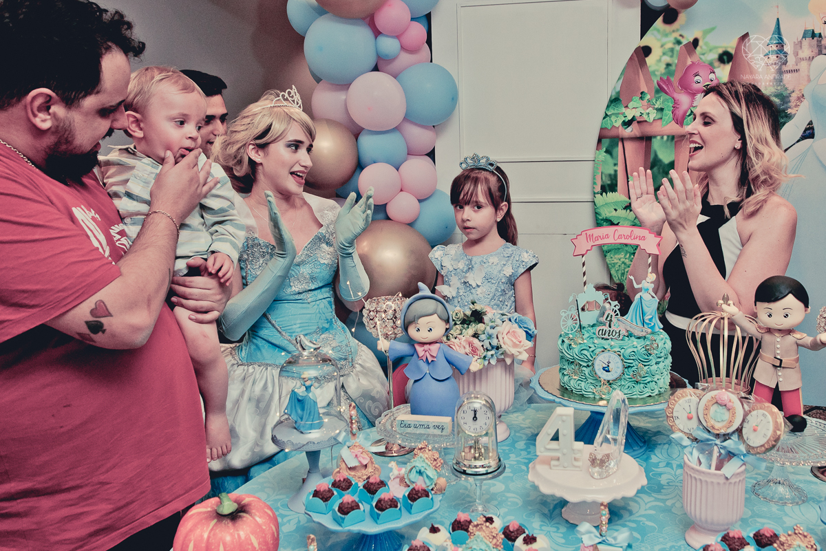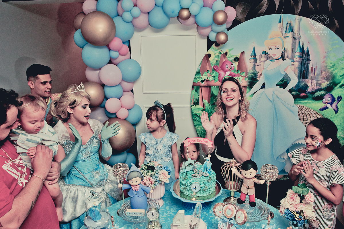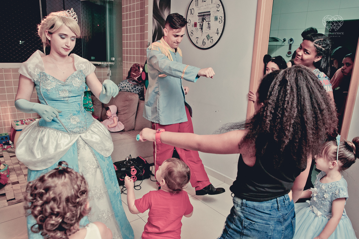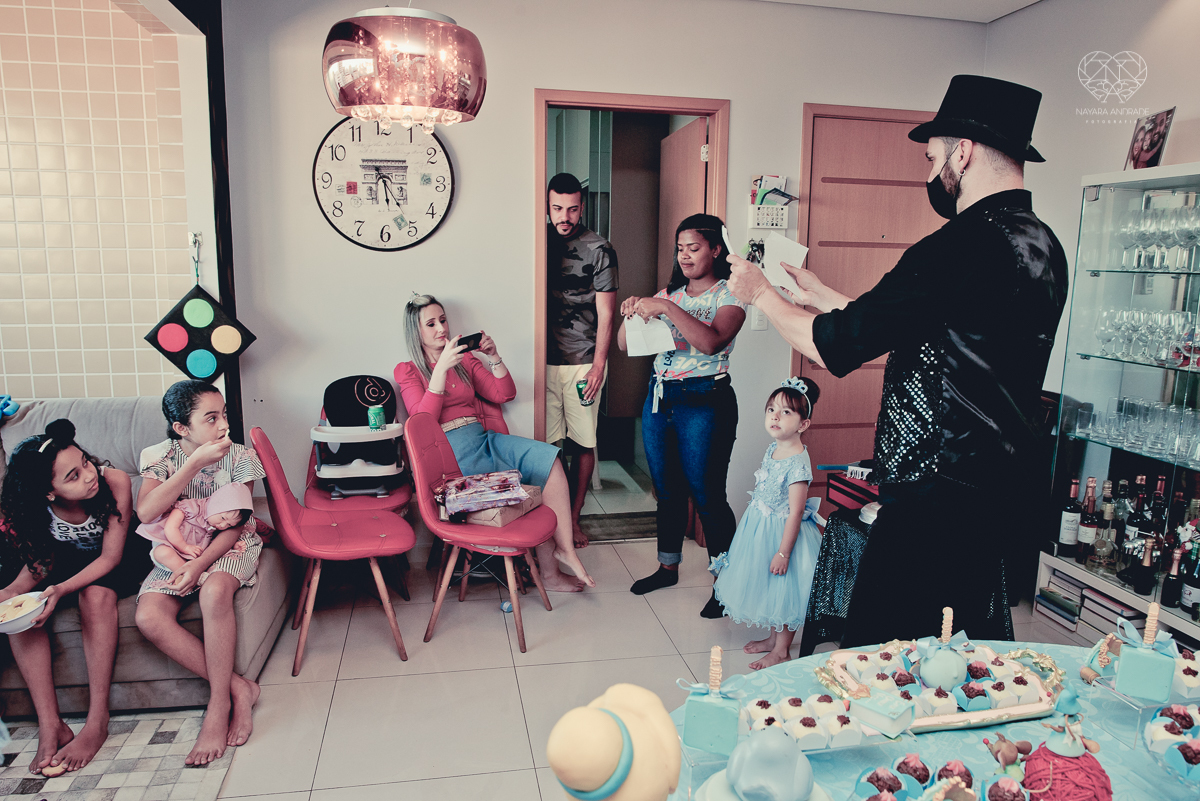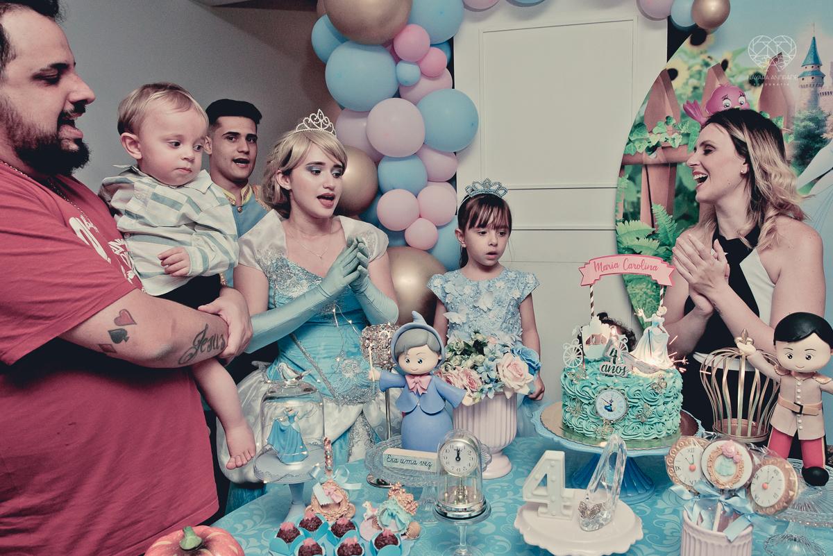 Festa infantil em casa com tema da cinderela fotografado pela fotografa premiada nayara andrade em santos litoral de sao paulo aniversario de menina com quatro anos e familiares na sala de casa fotos com emoção e arte e edição infantil