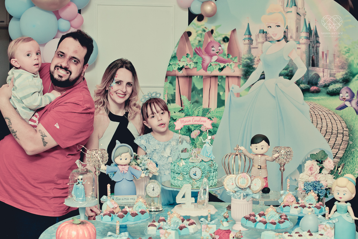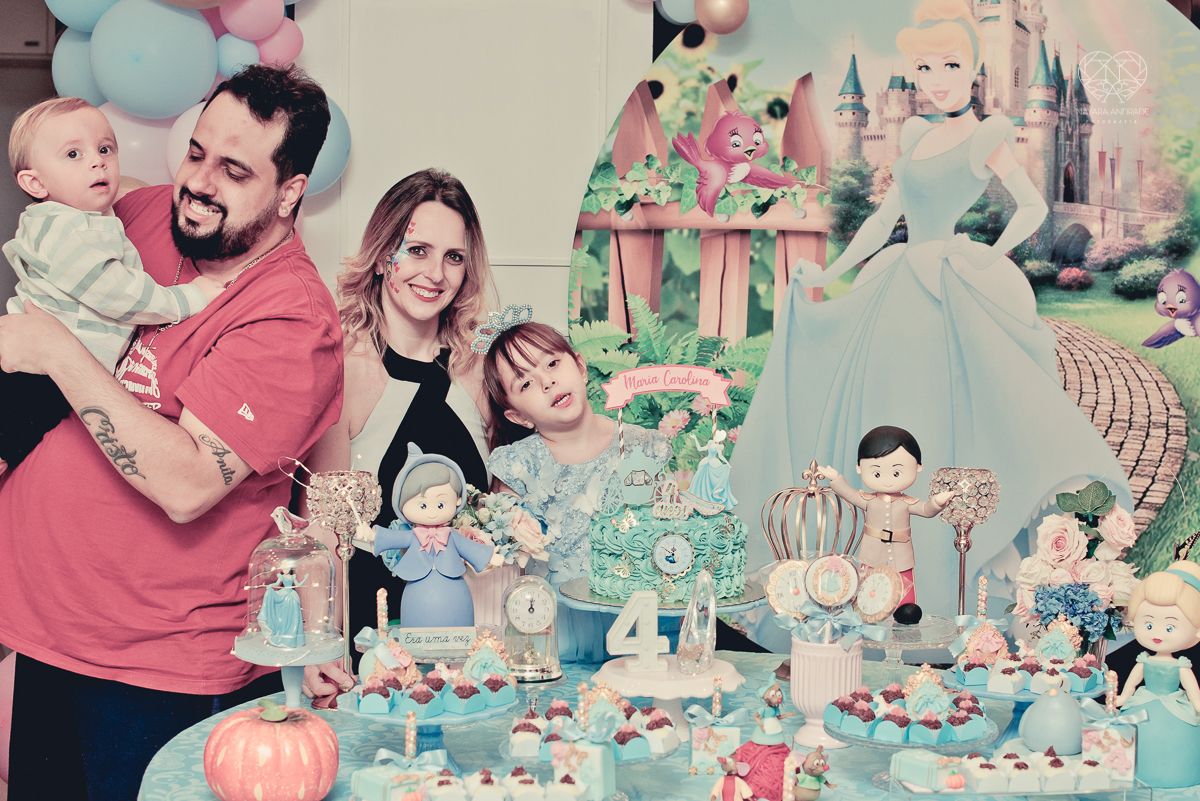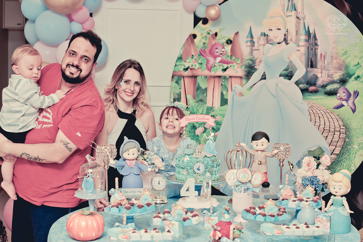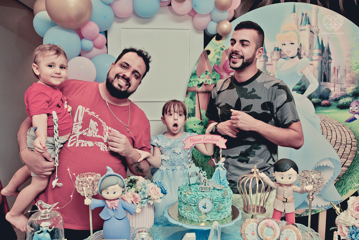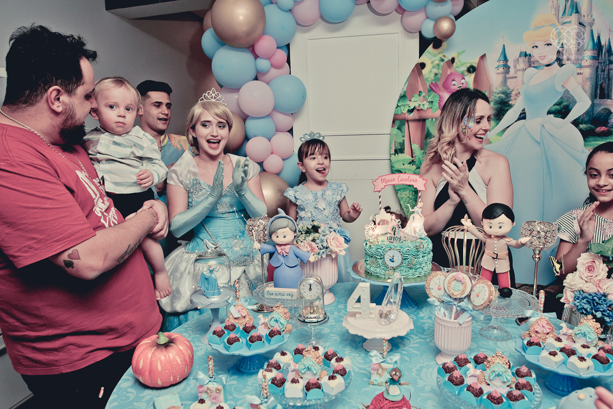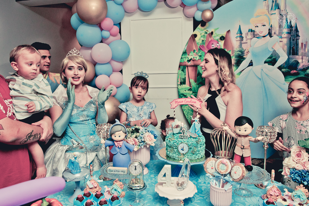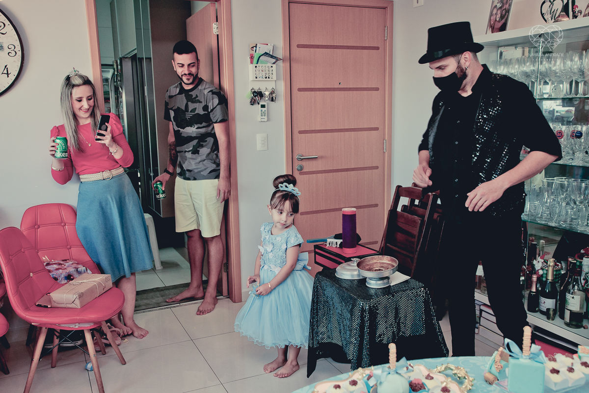 Festa infantil em casa com tema da cinderela fotografado pela fotografa premiada nayara andrade em santos litoral de sao paulo aniversario de menina com quatro anos e familiares na sala de casa fotos com emoção e arte e edição infantil
