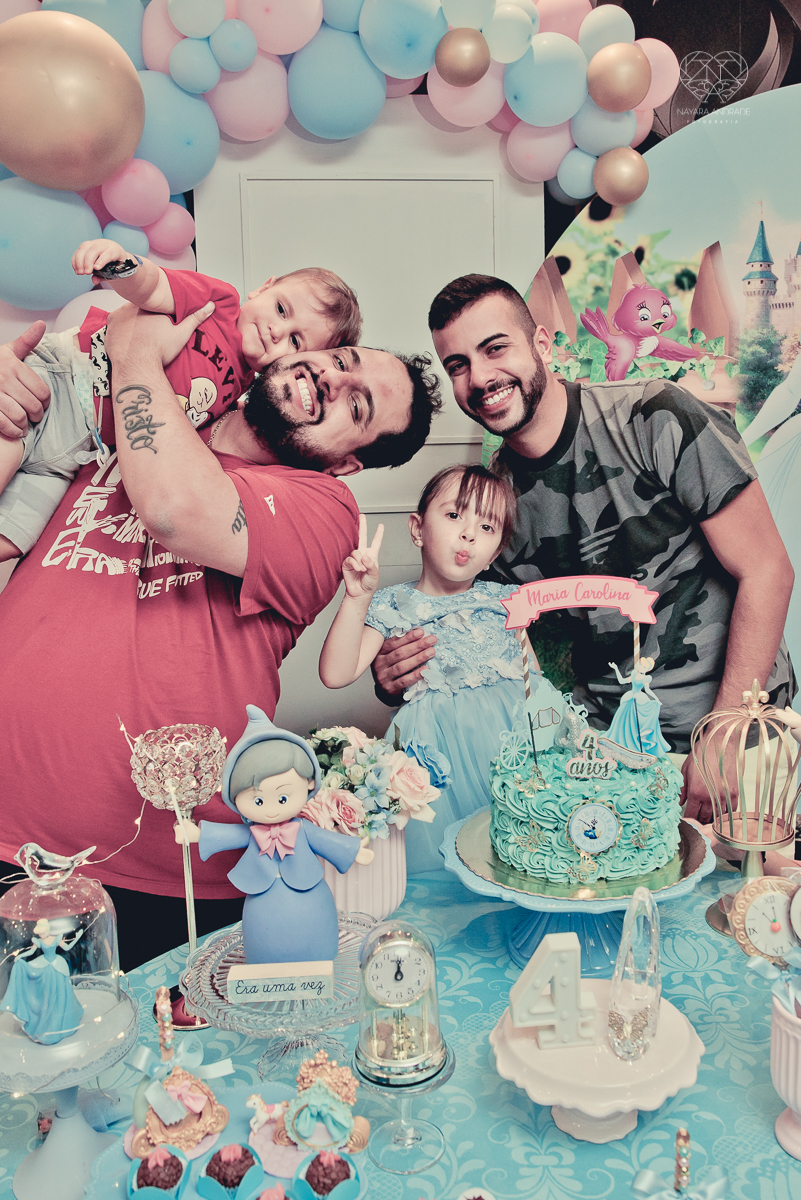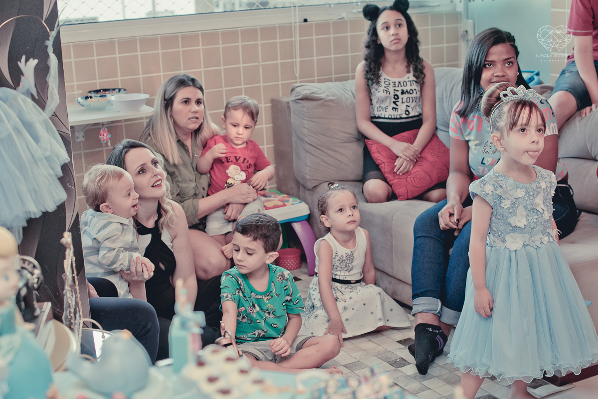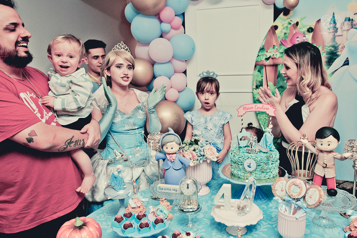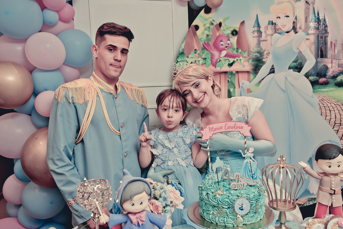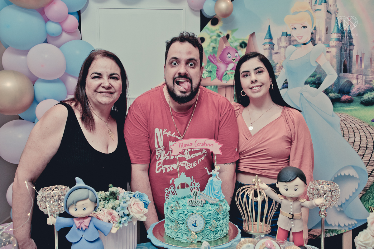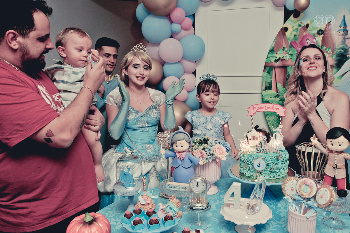 Festa infantil em casa com tema da cinderela fotografado pela fotografa premiada nayara andrade em santos litoral de sao paulo aniversario de menina com quatro anos e familiares na sala de casa fotos com emoção e arte e edição infantil