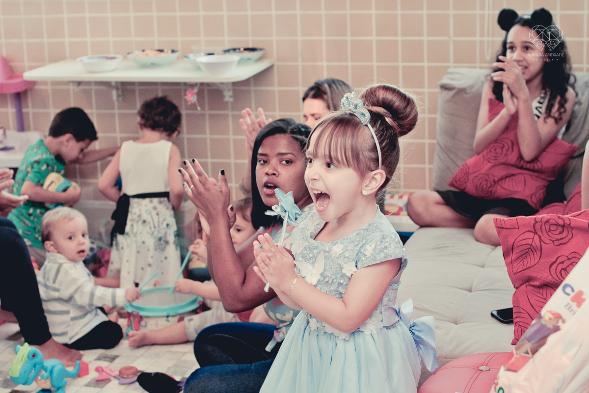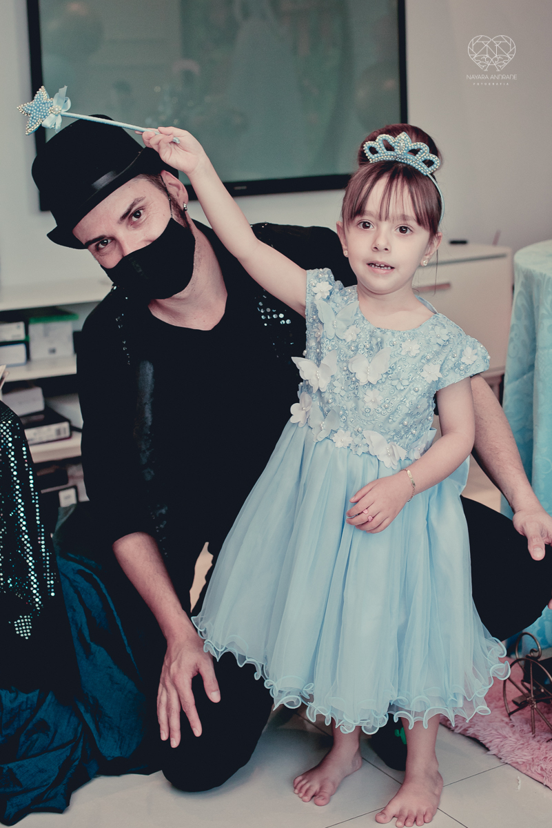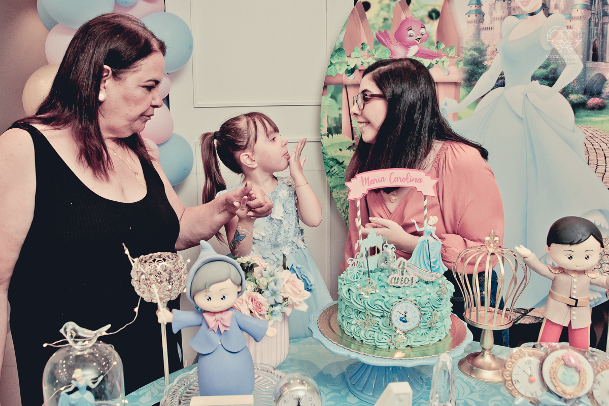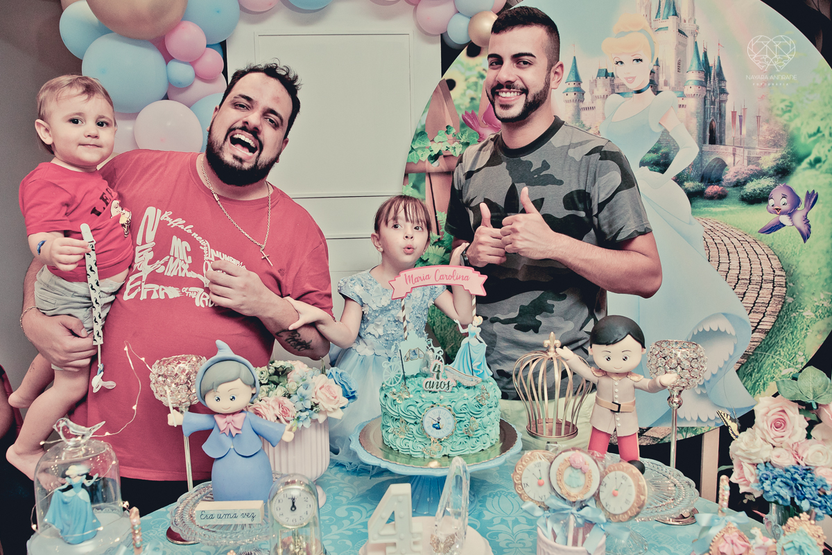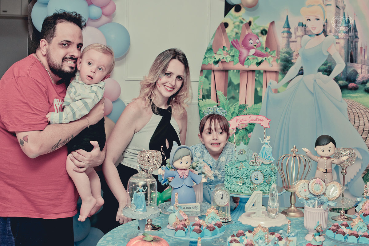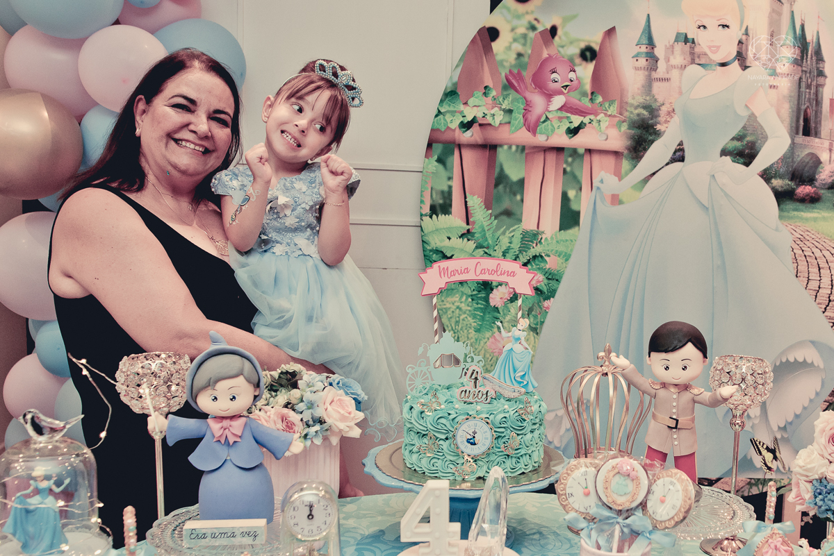 Festa infantil em casa com tema da cinderela fotografado pela fotografa premiada nayara andrade em santos litoral de sao paulo aniversario de menina com quatro anos e familiares na sala de casa fotos com emoção e arte e edição infantil