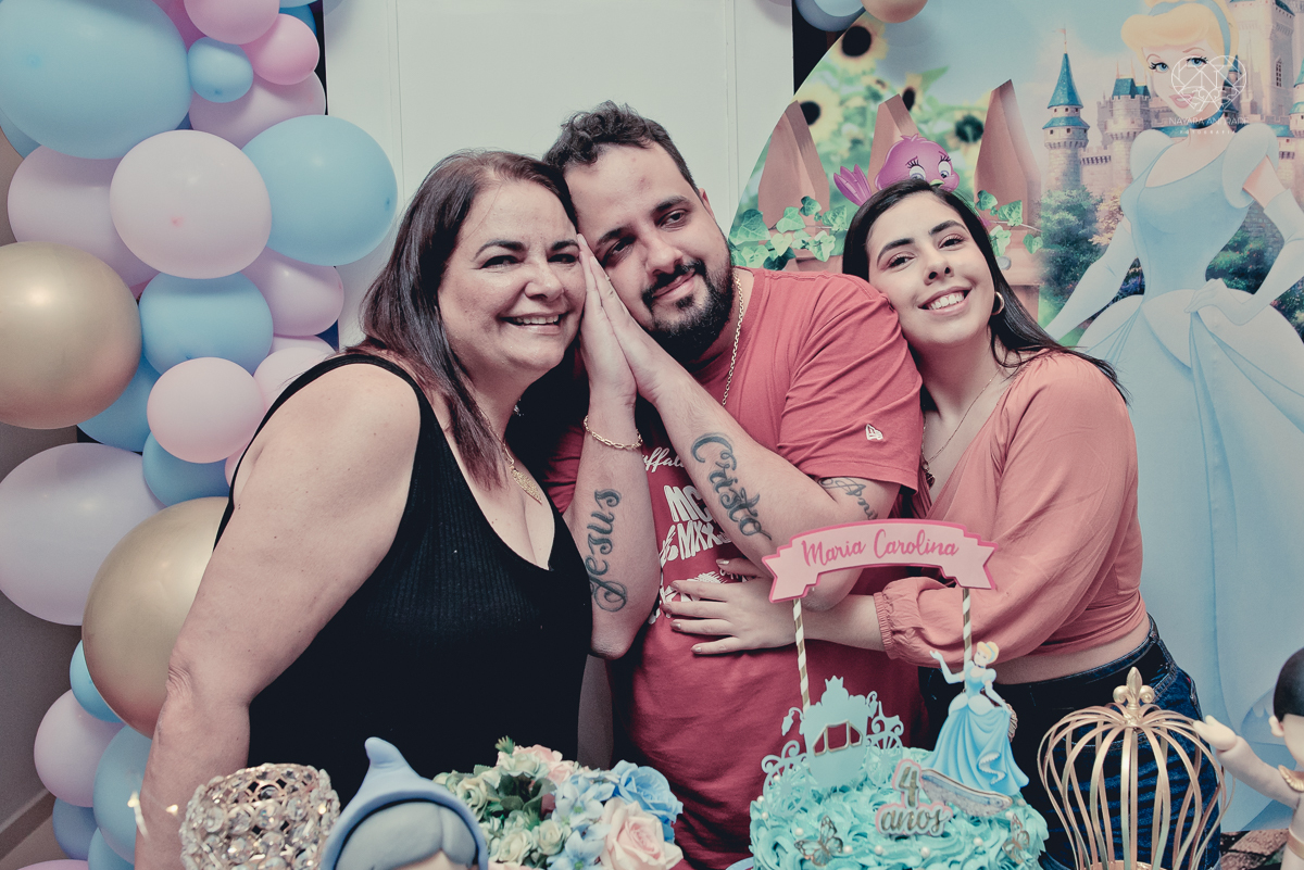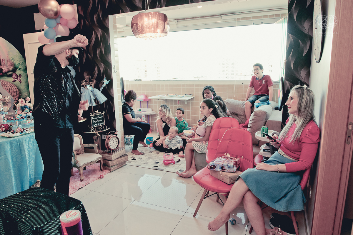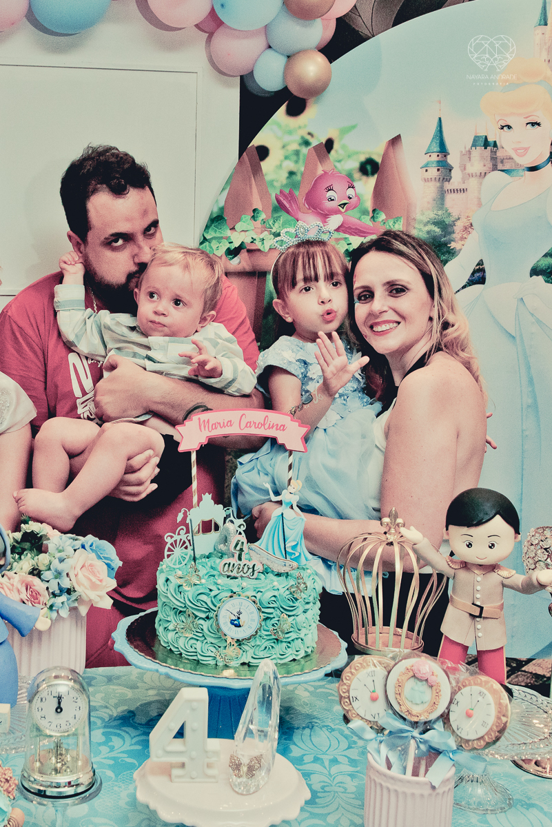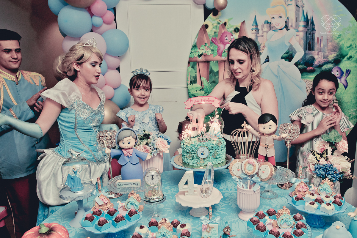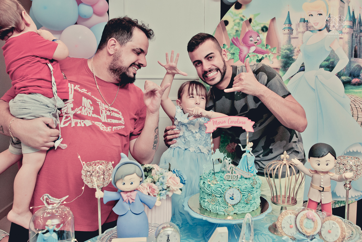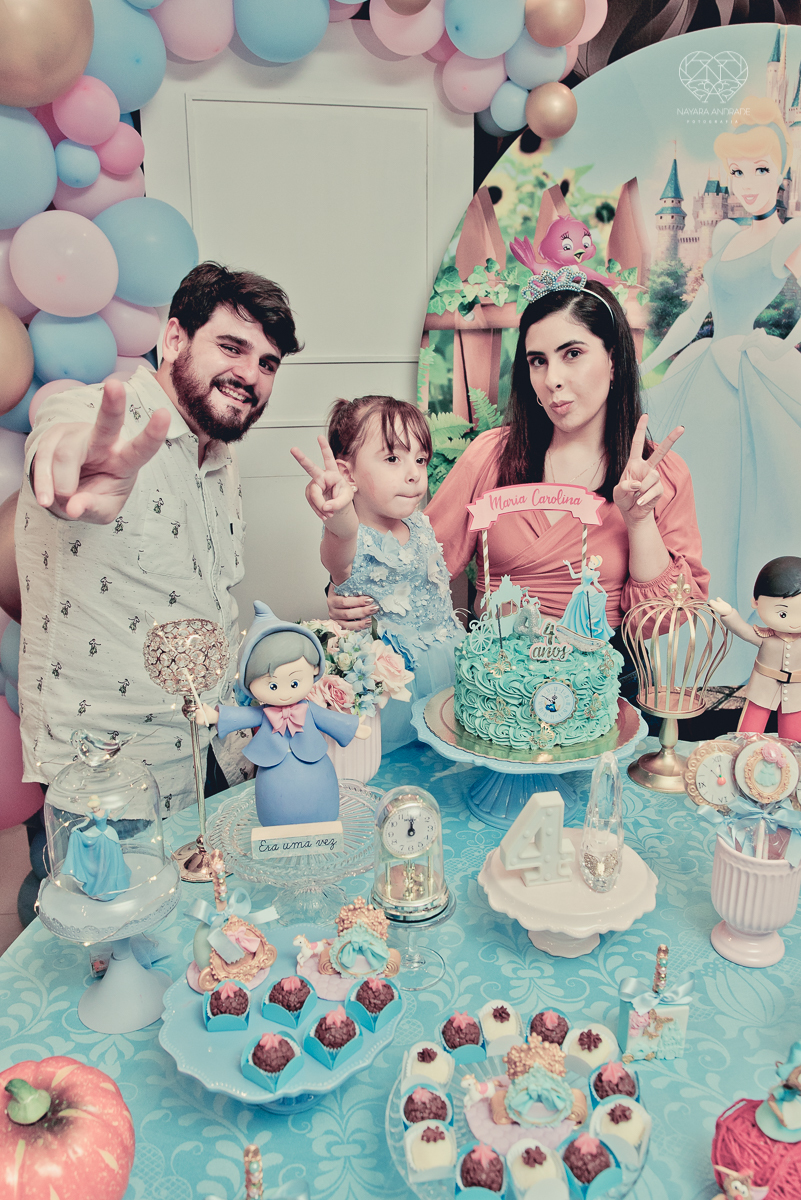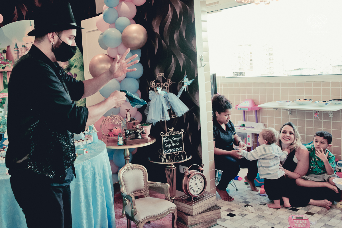 Festa infantil em casa com tema da cinderela fotografado pela fotografa premiada nayara andrade em santos litoral de sao paulo aniversario de menina com quatro anos e familiares na sala de casa fotos com emoção e arte e edição infantil