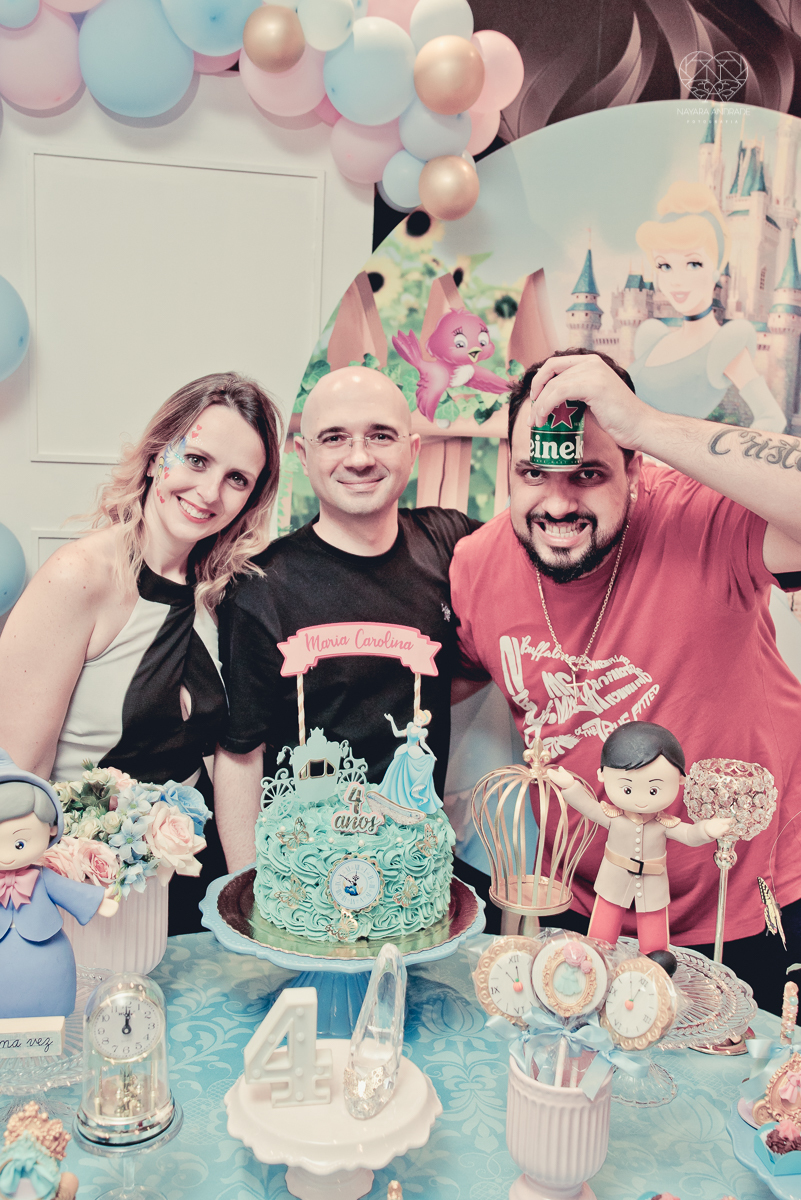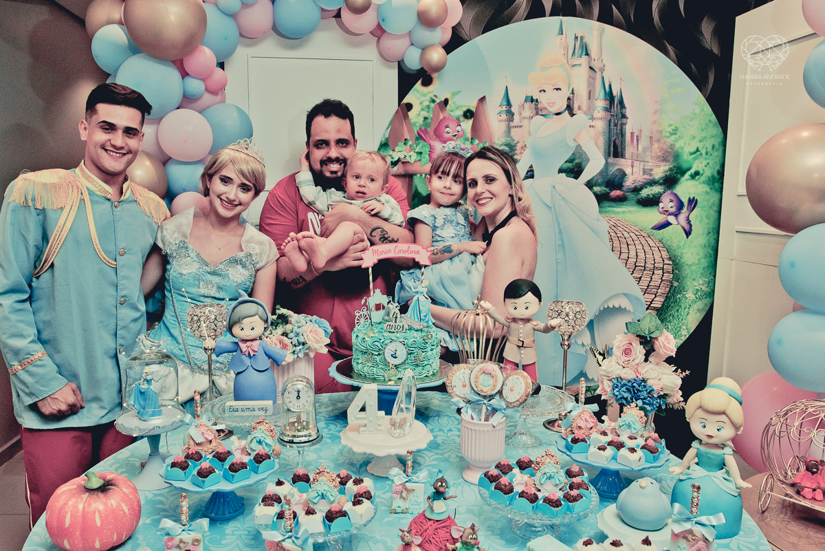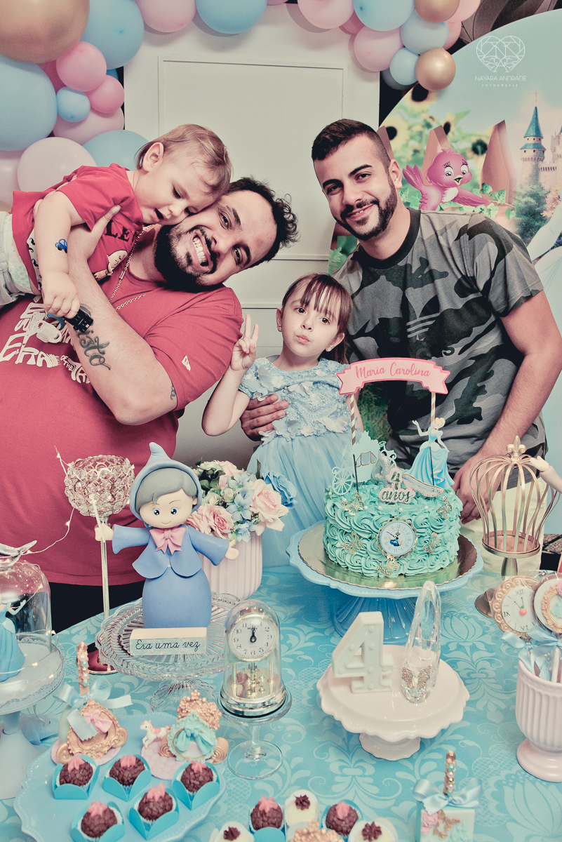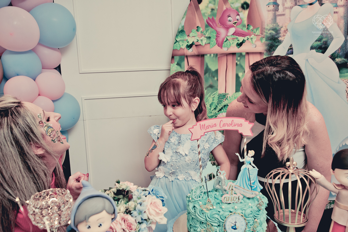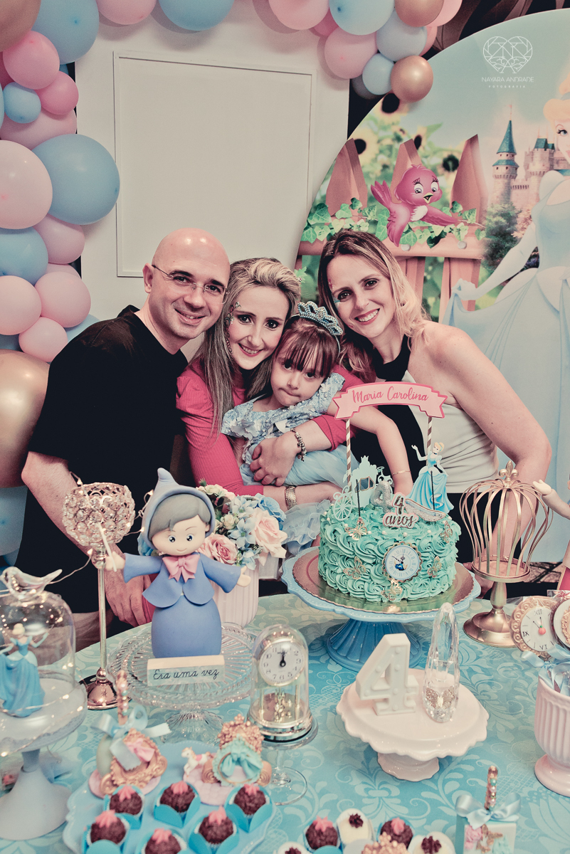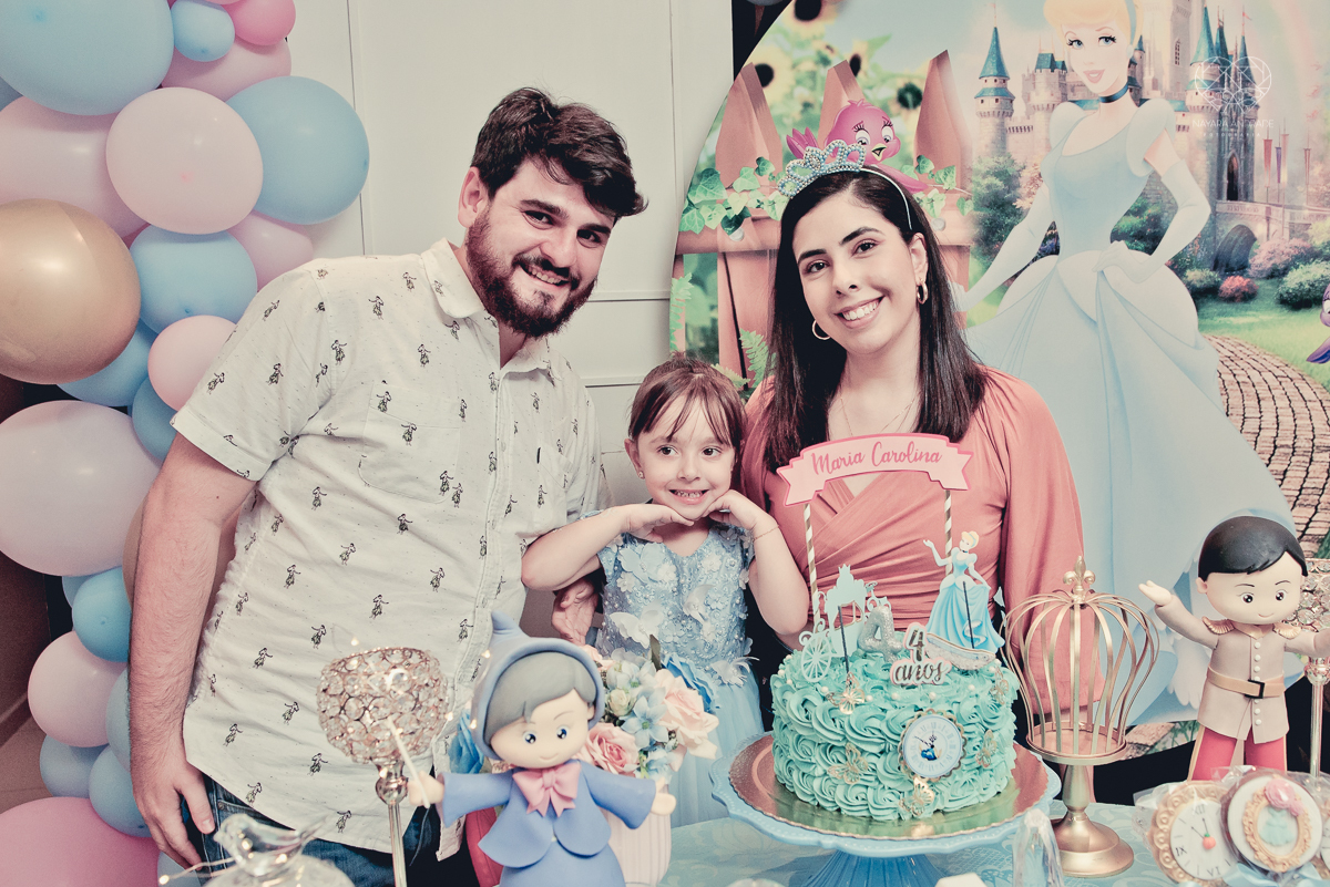 Festa infantil em casa com tema da cinderela fotografado pela fotografa premiada nayara andrade em santos litoral de sao paulo aniversario de menina com quatro anos e familiares na sala de casa fotos com emoção e arte e edição infantil
