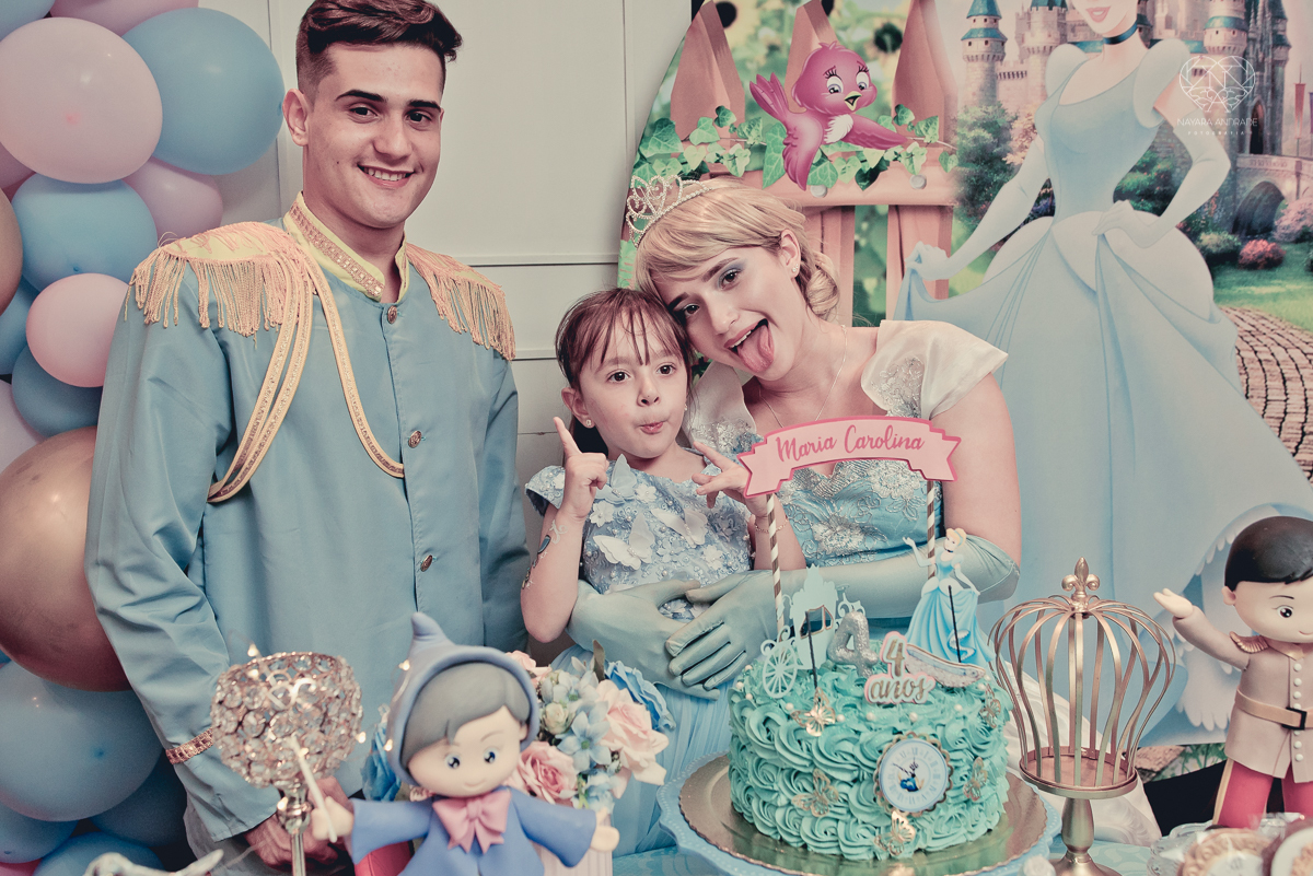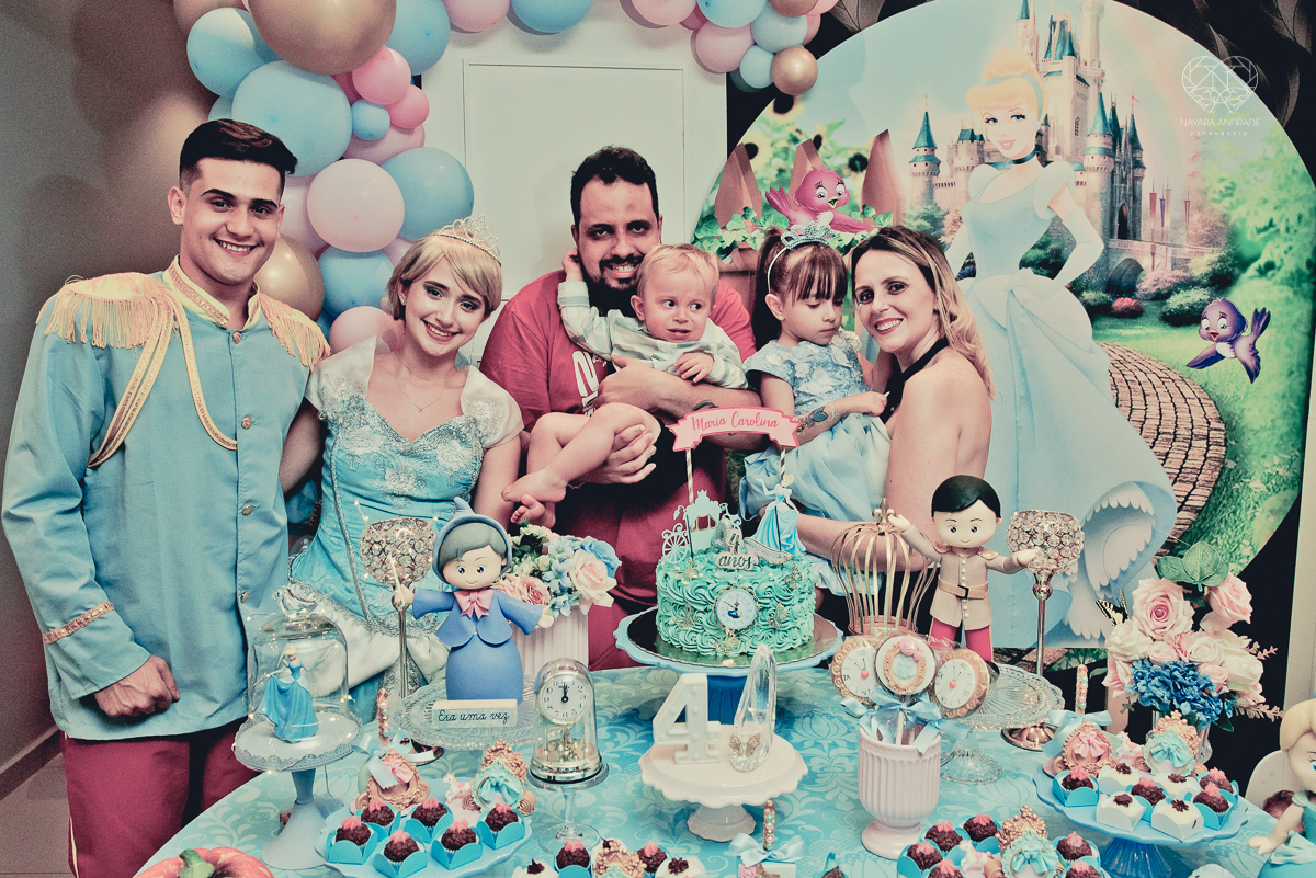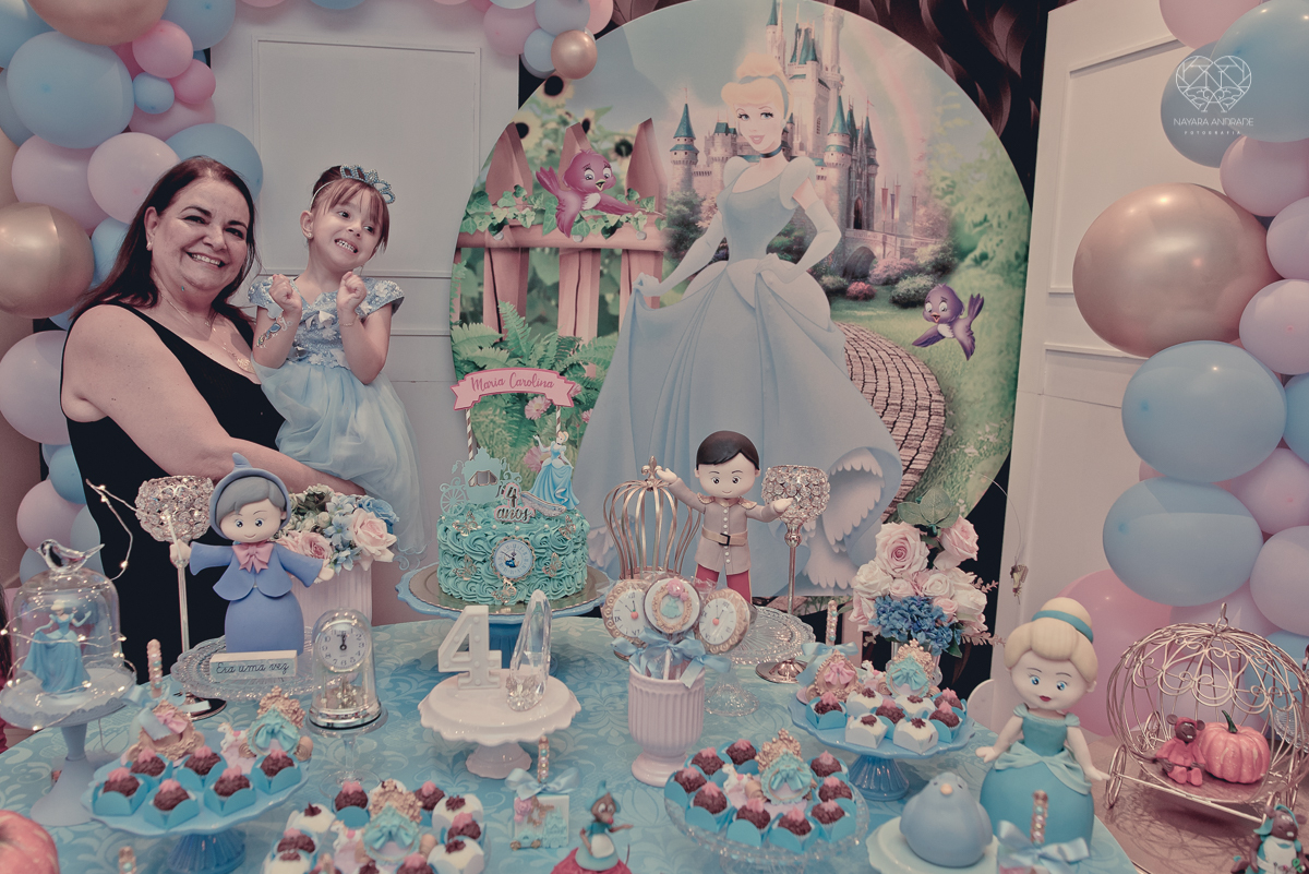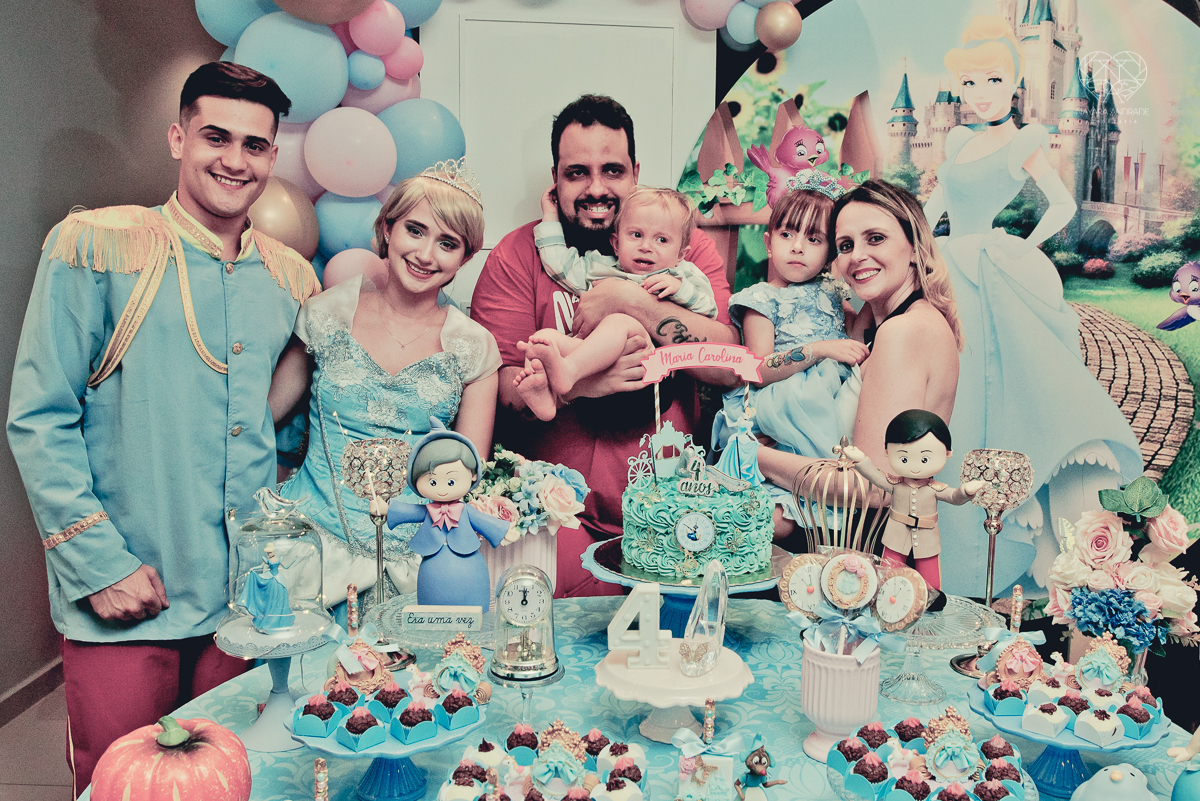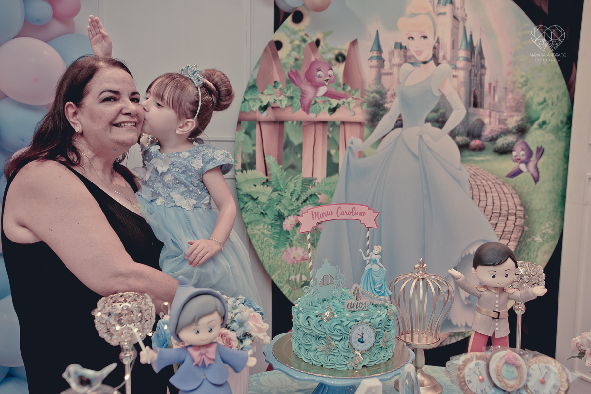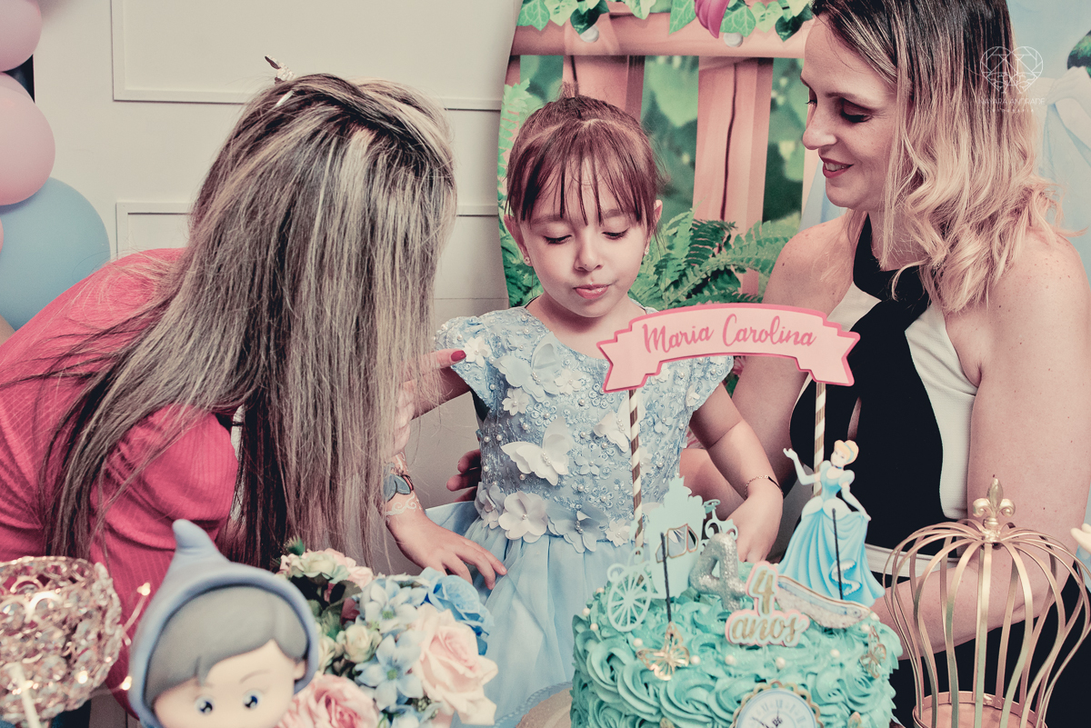 Festa infantil em casa com tema da cinderela fotografado pela fotografa premiada nayara andrade em santos litoral de sao paulo aniversario de menina com quatro anos e familiares na sala de casa fotos com emoção e arte e edição infantil