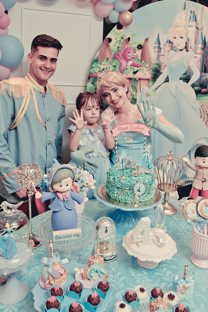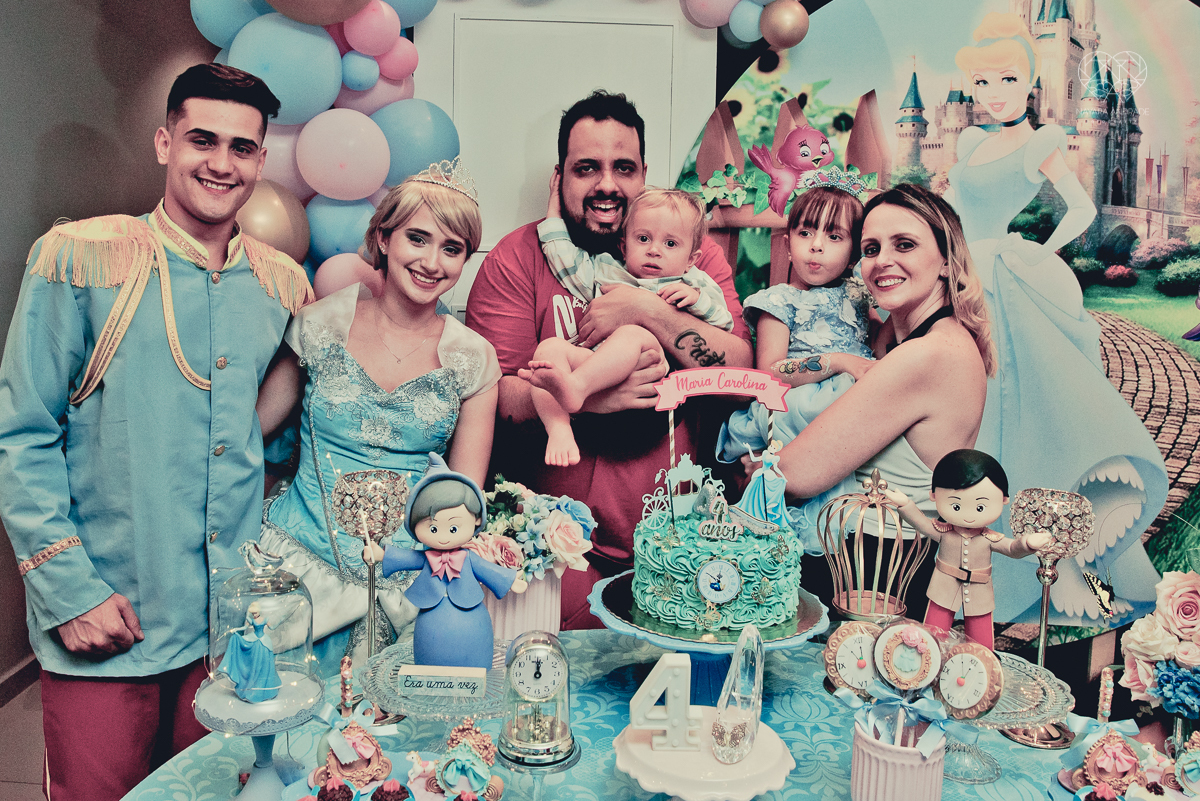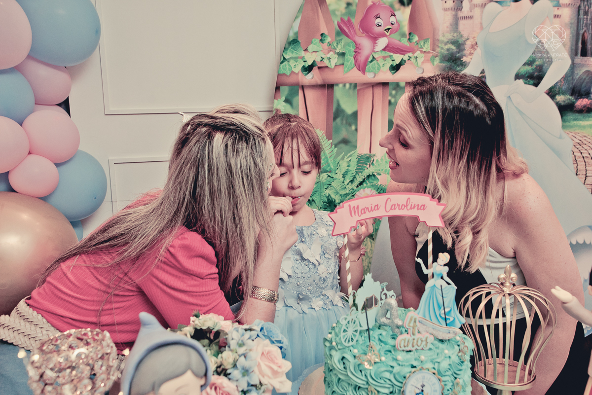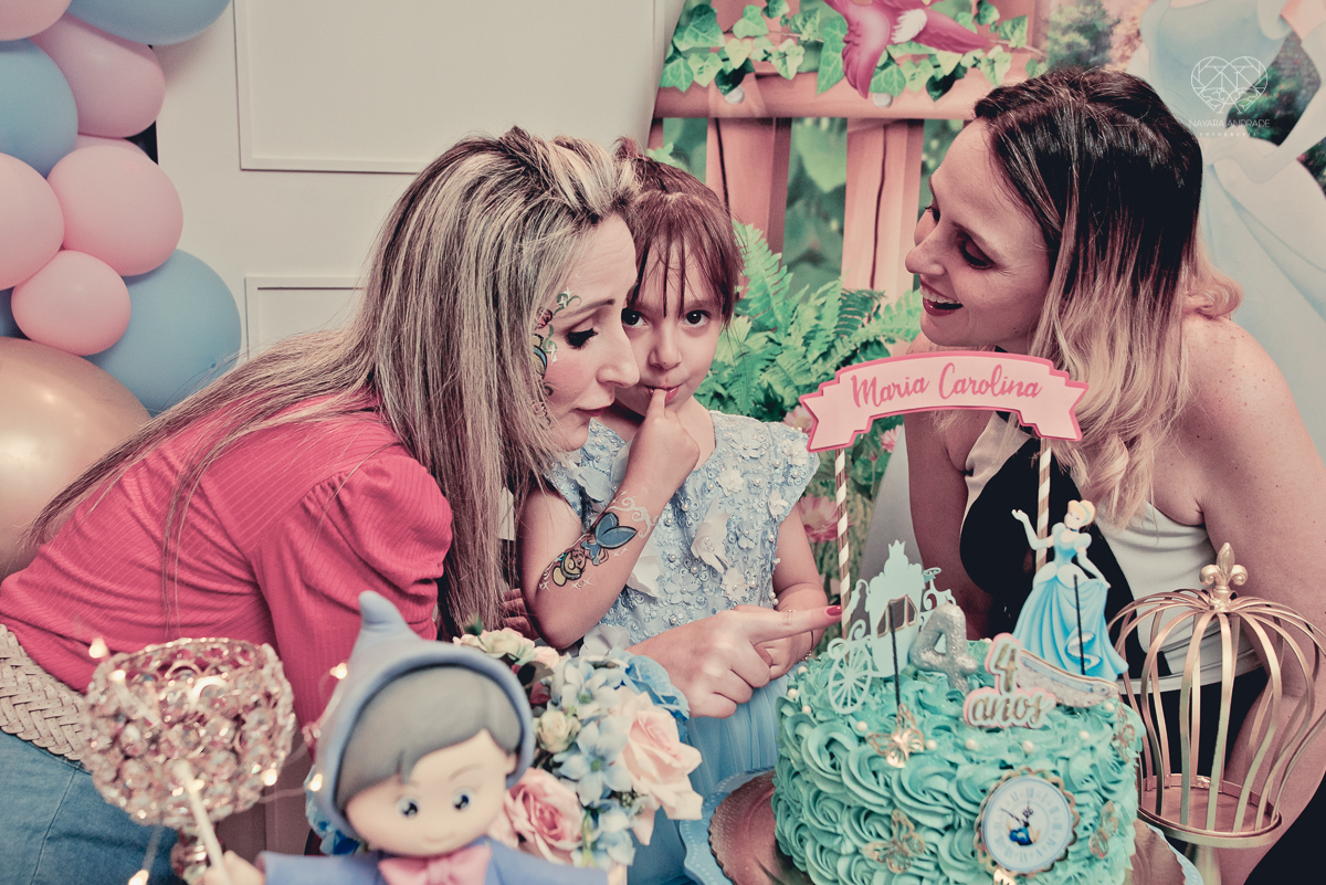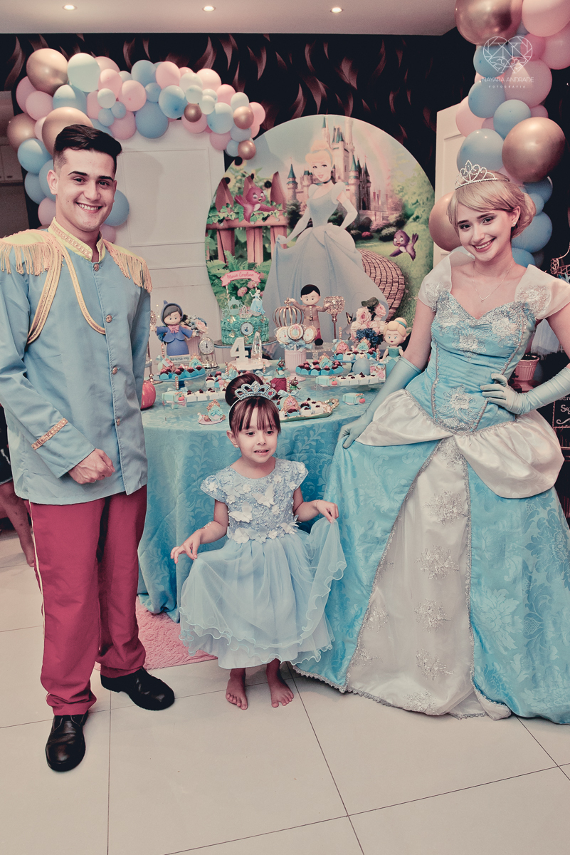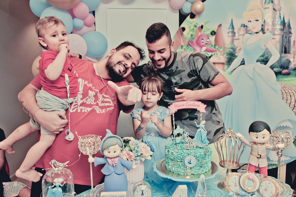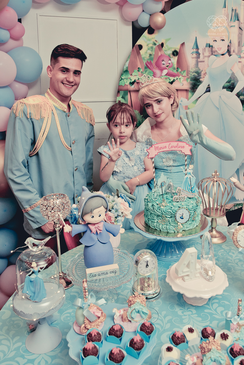 Festa infantil em casa com tema da cinderela fotografado pela fotografa premiada nayara andrade em santos litoral de sao paulo aniversario de menina com quatro anos e familiares na sala de casa fotos com emoção e arte e edição infantil