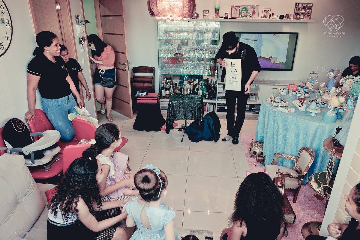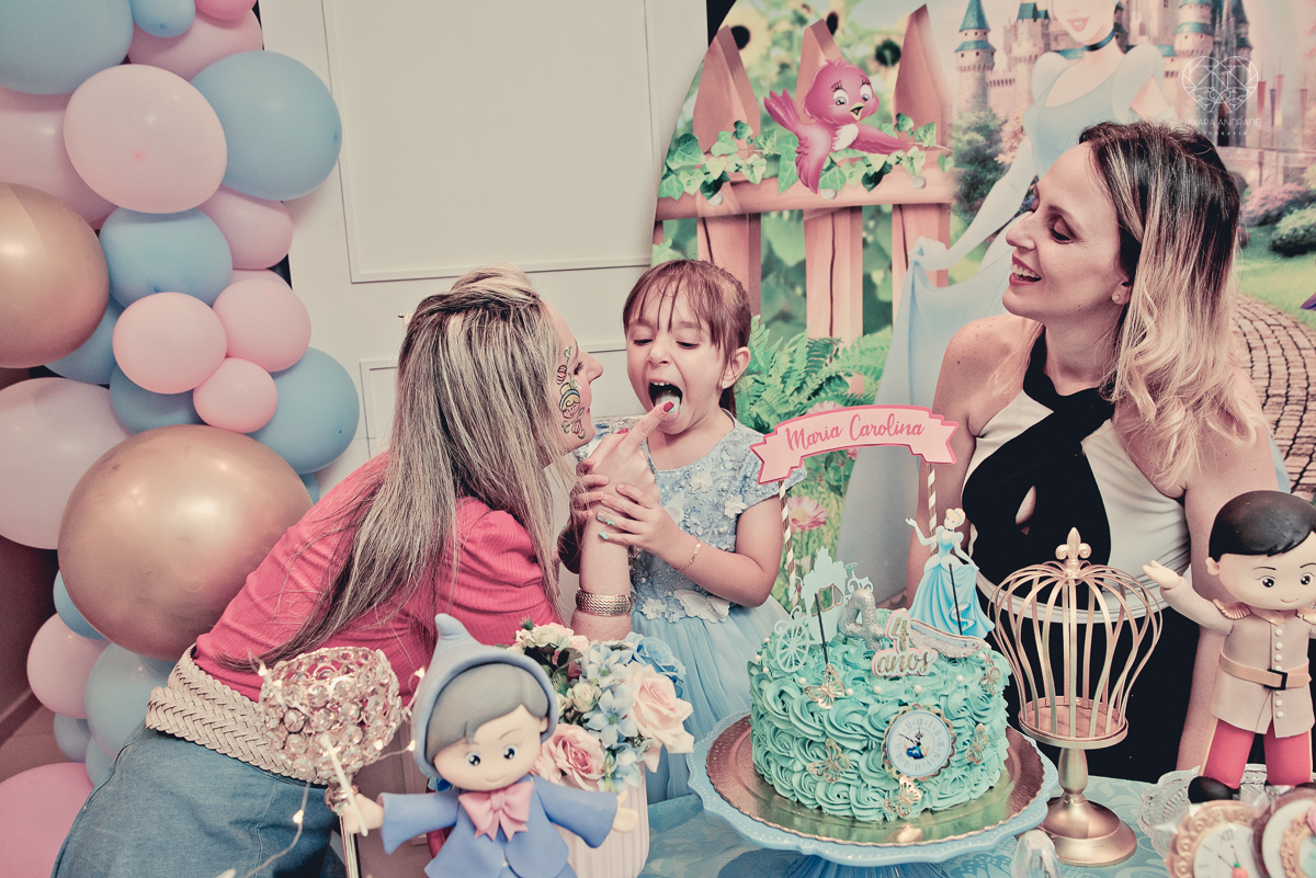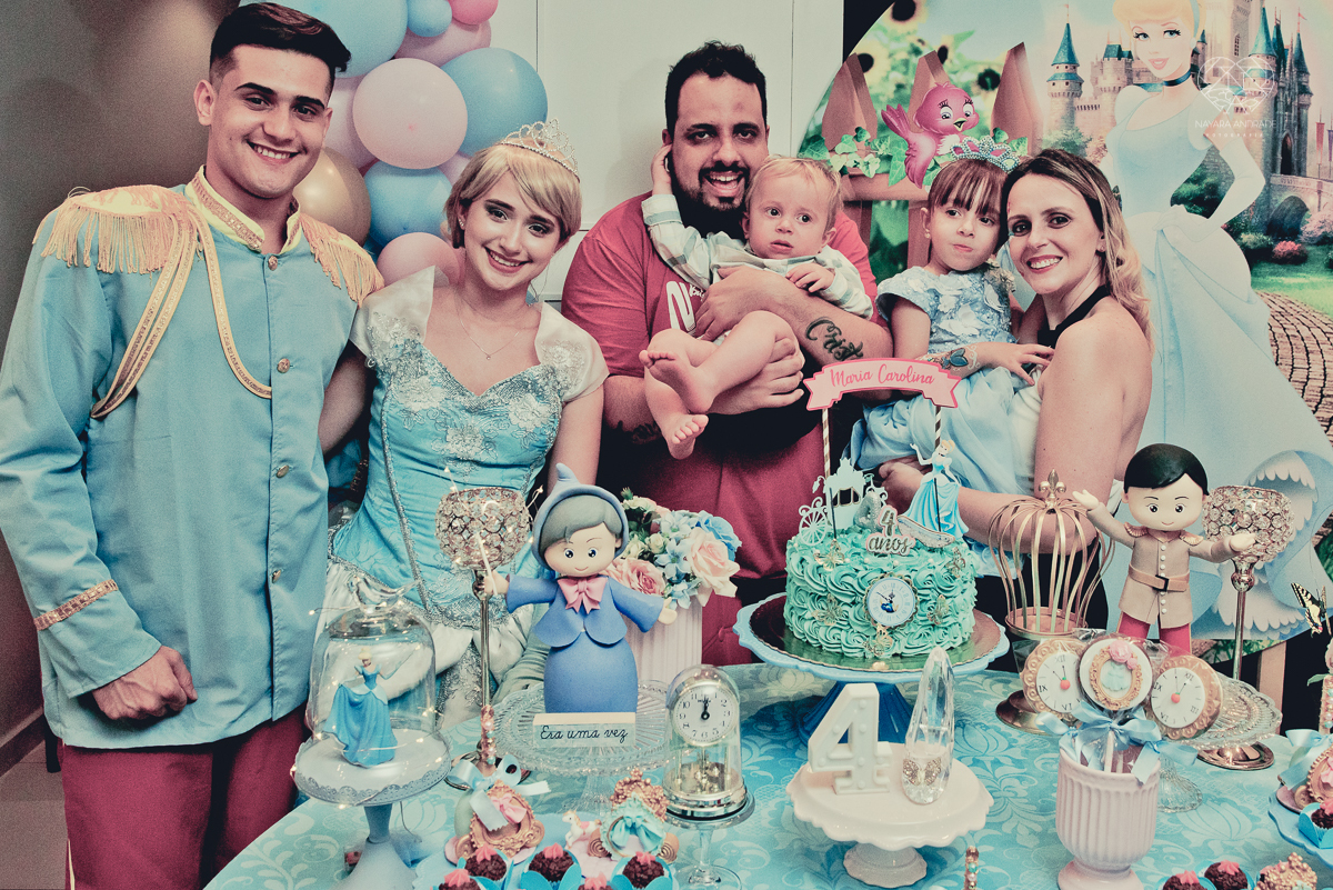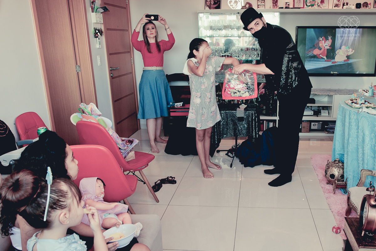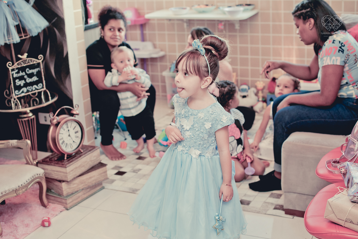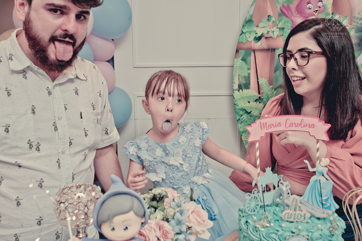 Festa infantil em casa com tema da cinderela fotografado pela fotografa premiada nayara andrade em santos litoral de sao paulo aniversario de menina com quatro anos e familiares na sala de casa fotos com emoção e arte e edição infantil
