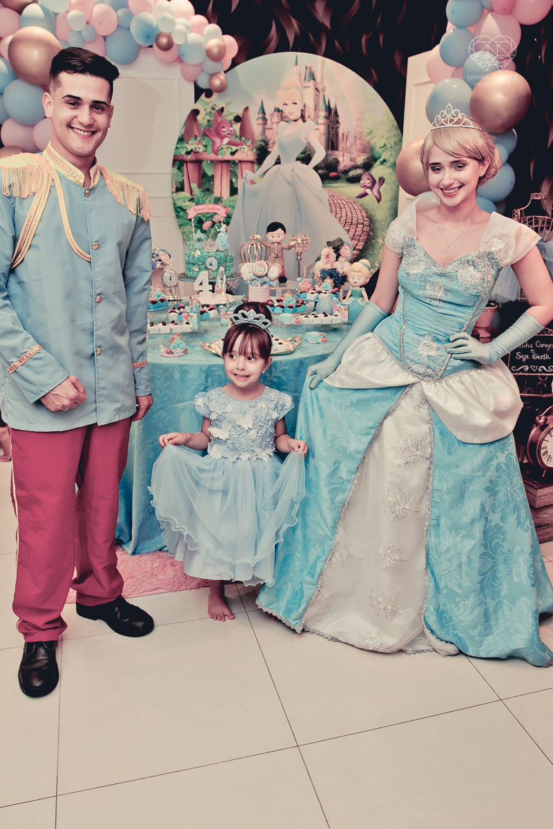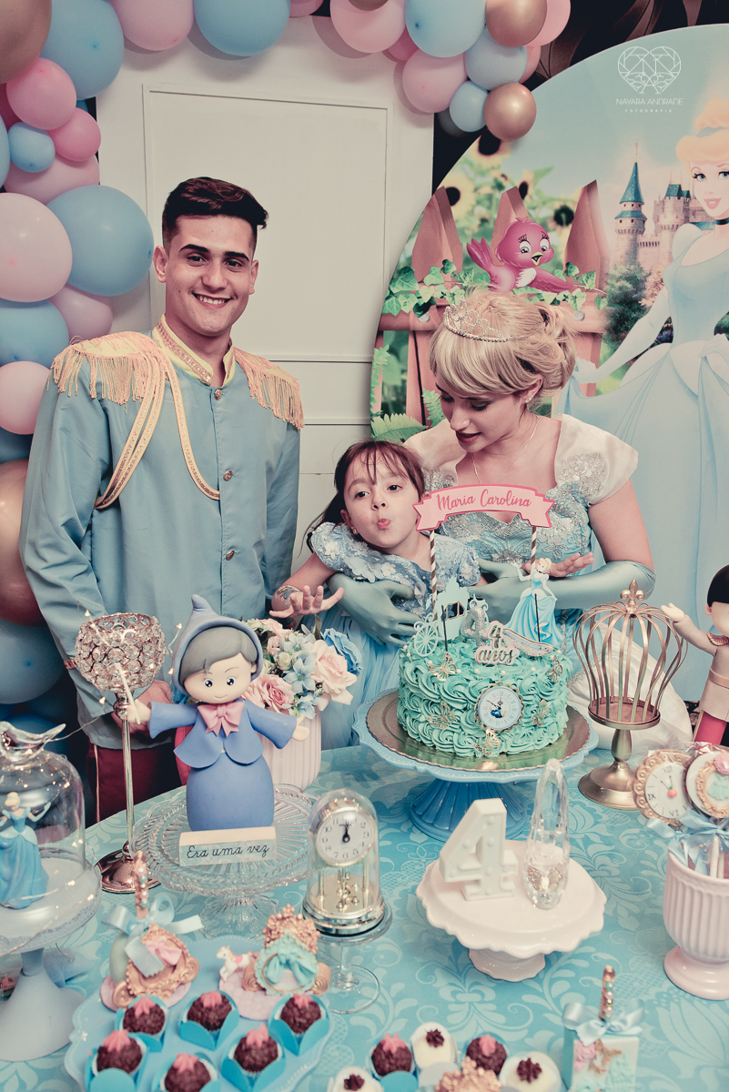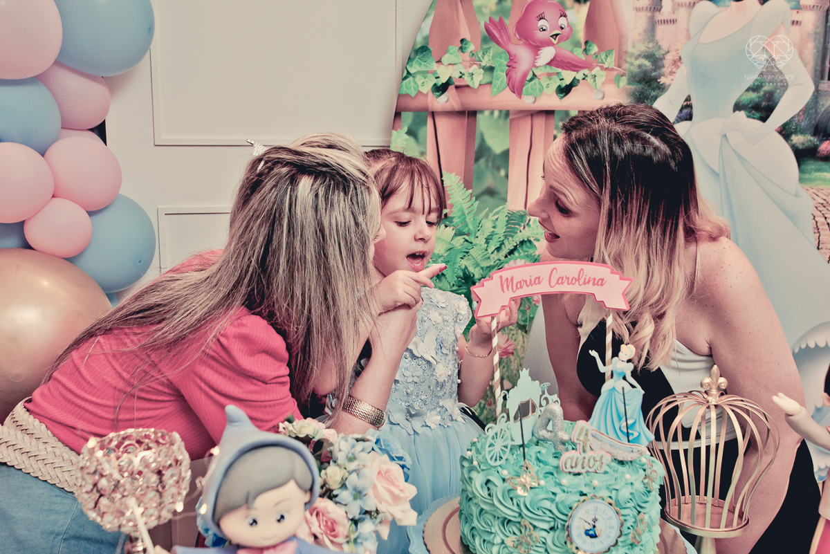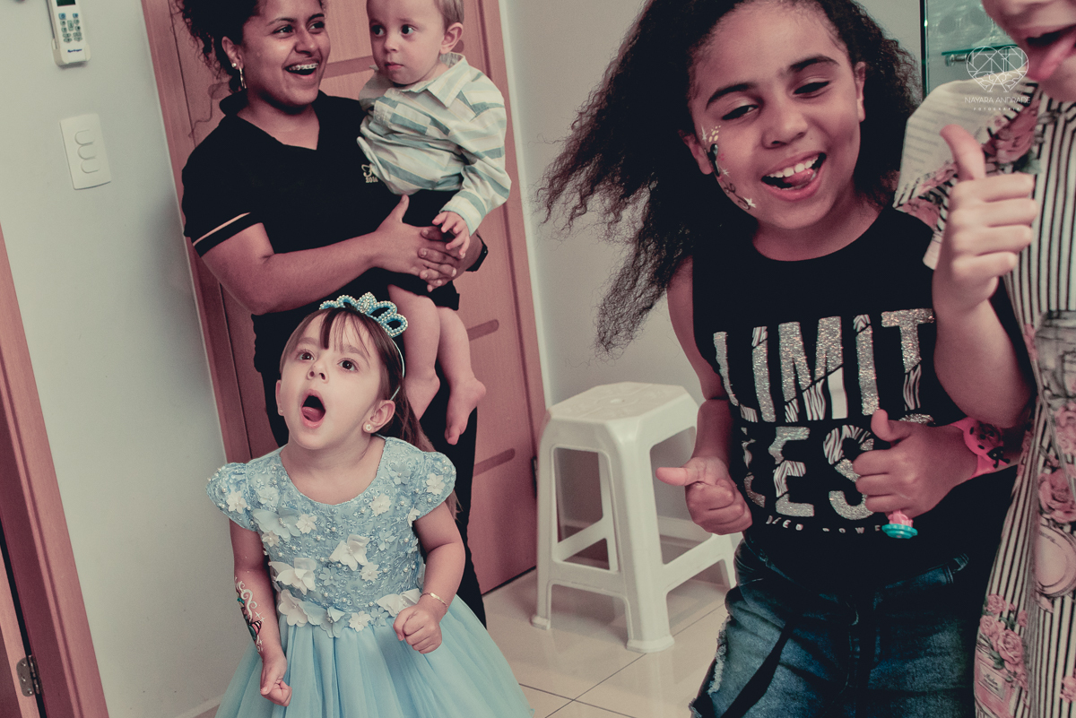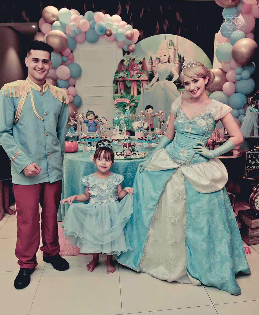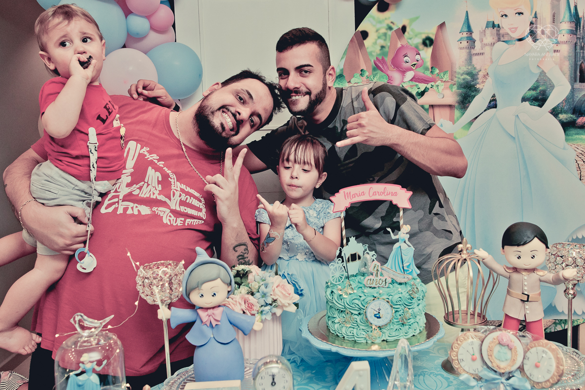 Festa infantil em casa com tema da cinderela fotografado pela fotografa premiada nayara andrade em santos litoral de sao paulo aniversario de menina com quatro anos e familiares na sala de casa fotos com emoção e arte e edição infantil