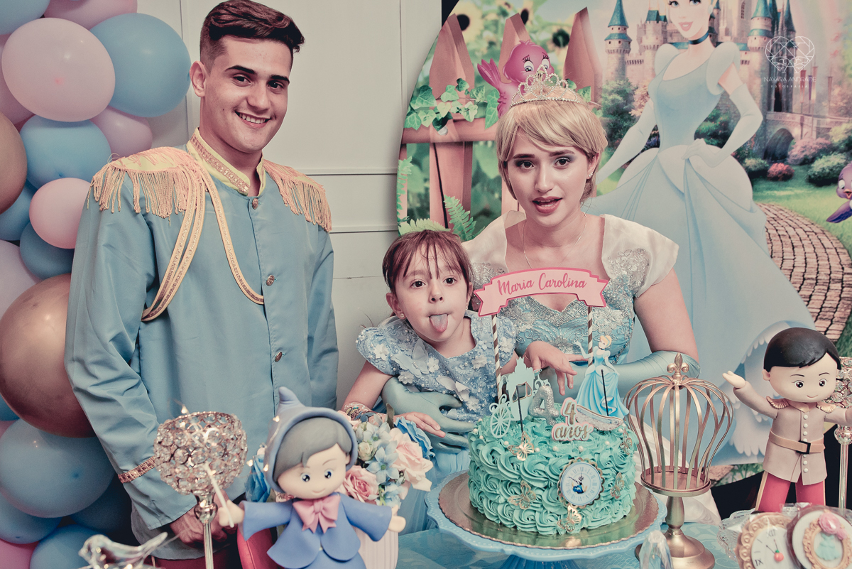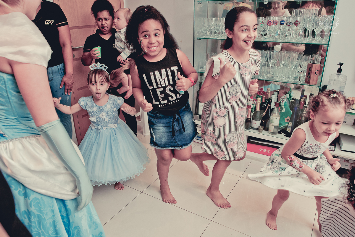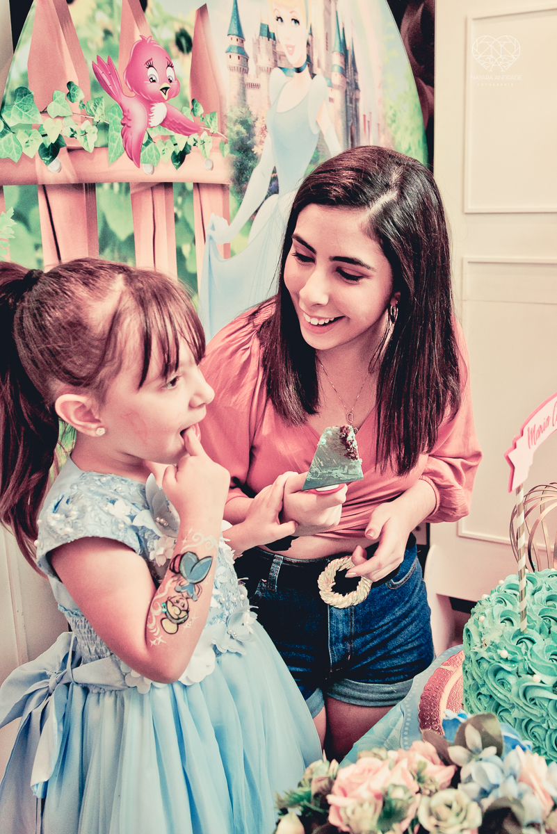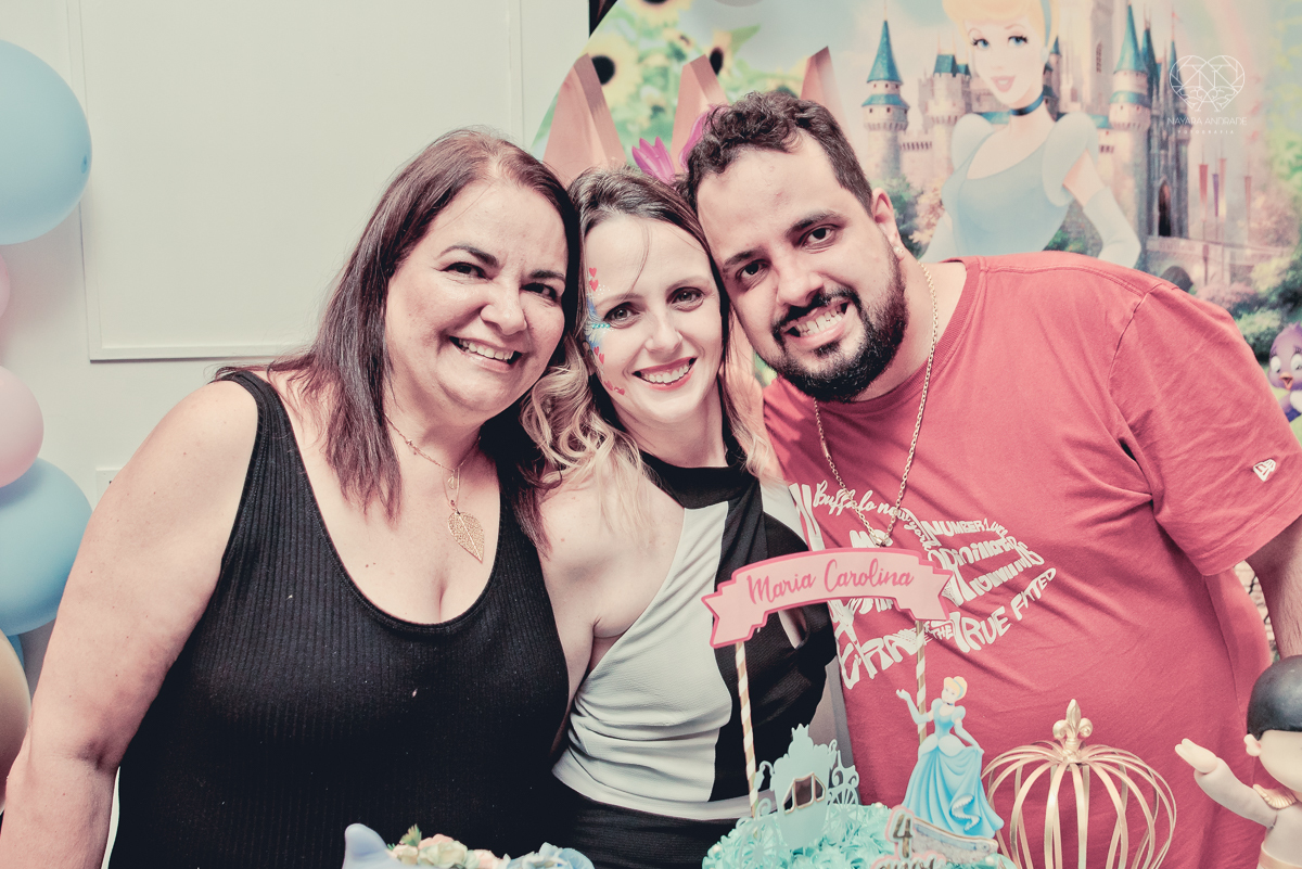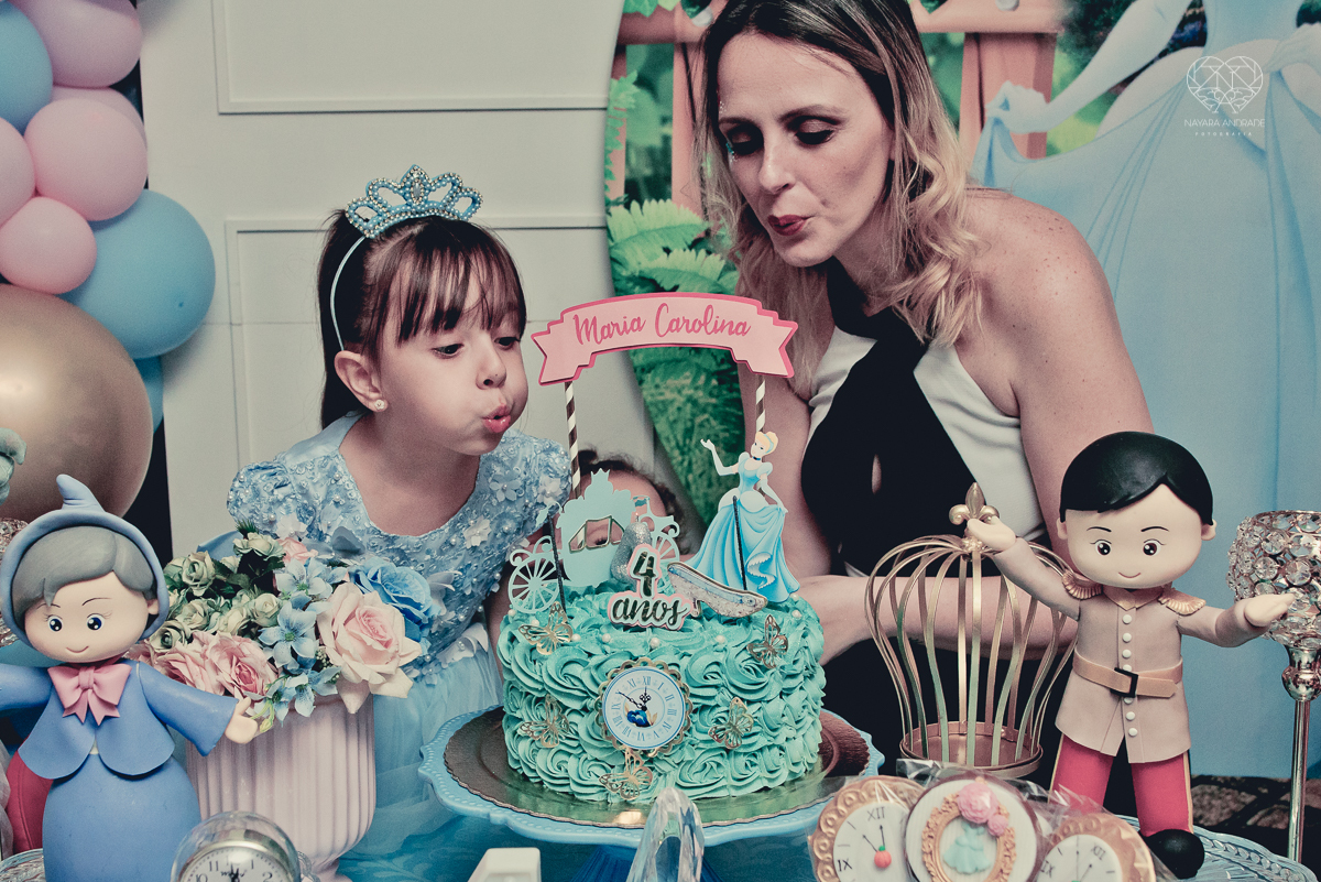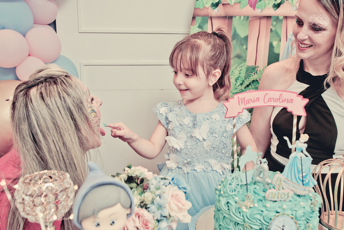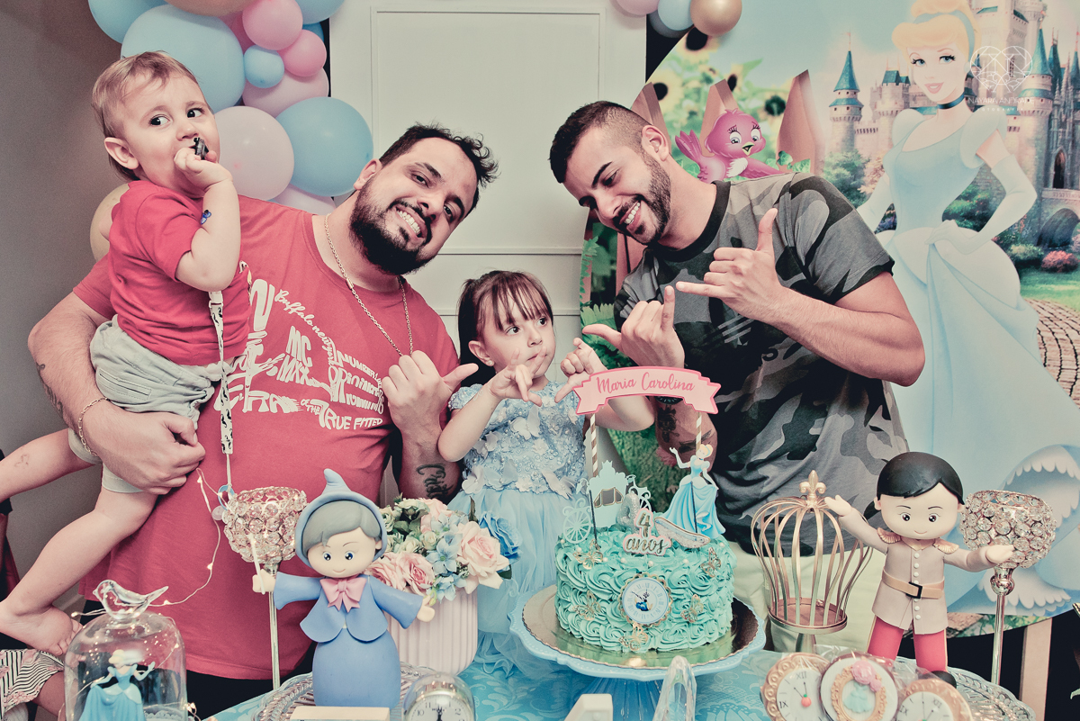 Festa infantil em casa com tema da cinderela fotografado pela fotografa premiada nayara andrade em santos litoral de sao paulo aniversario de menina com quatro anos e familiares na sala de casa fotos com emoção e arte e edição infantil