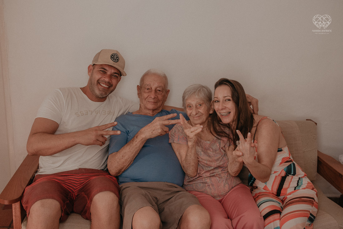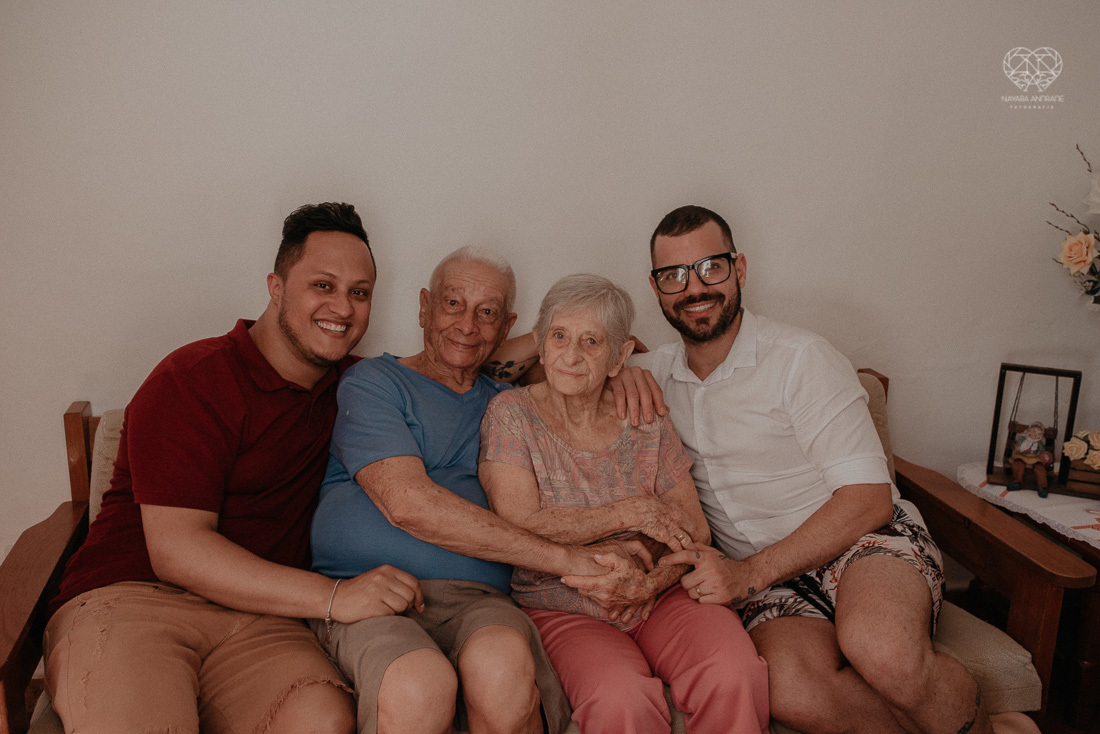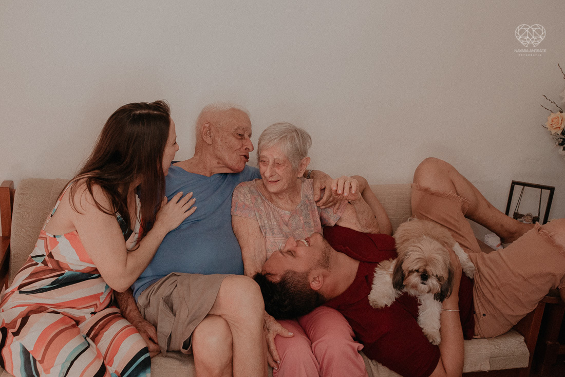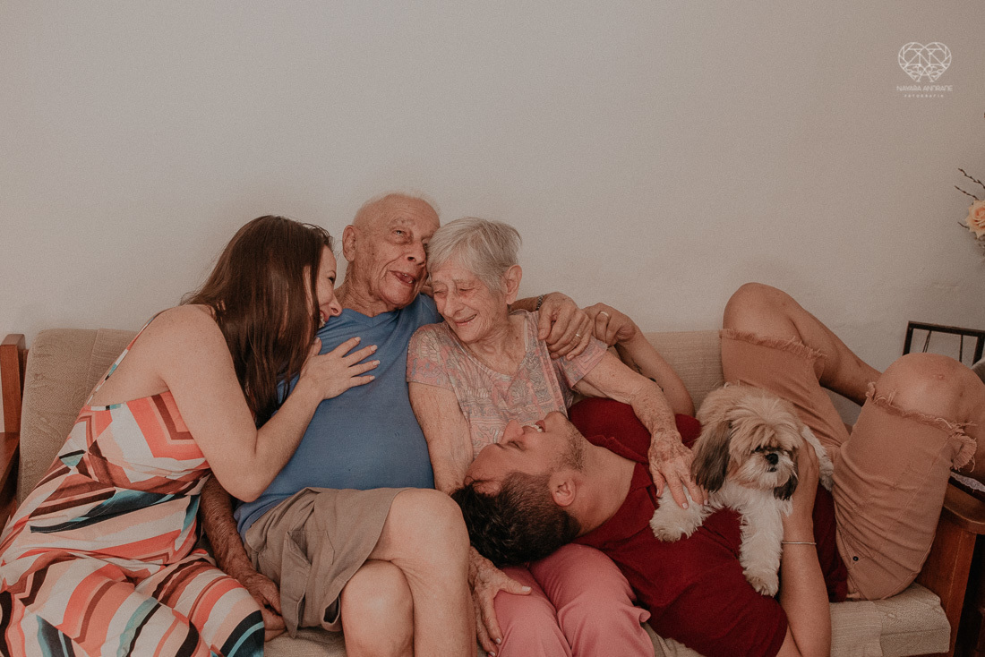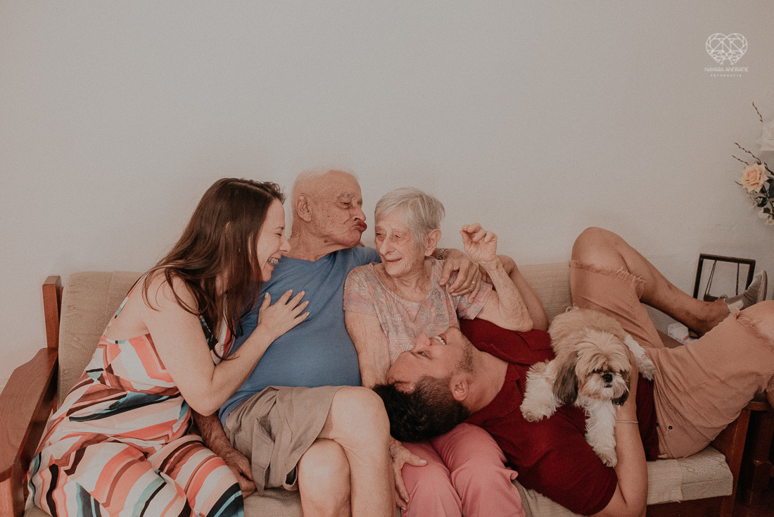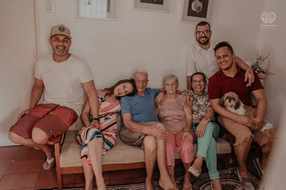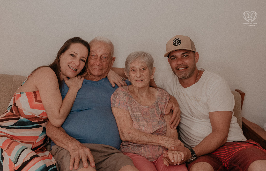 Ensaio de familia contando a historia de um casal com de 67 anos de casados. Senhor e senhora ja de cabelos brancos e rugas de felicidade e fotos com os netos e filha