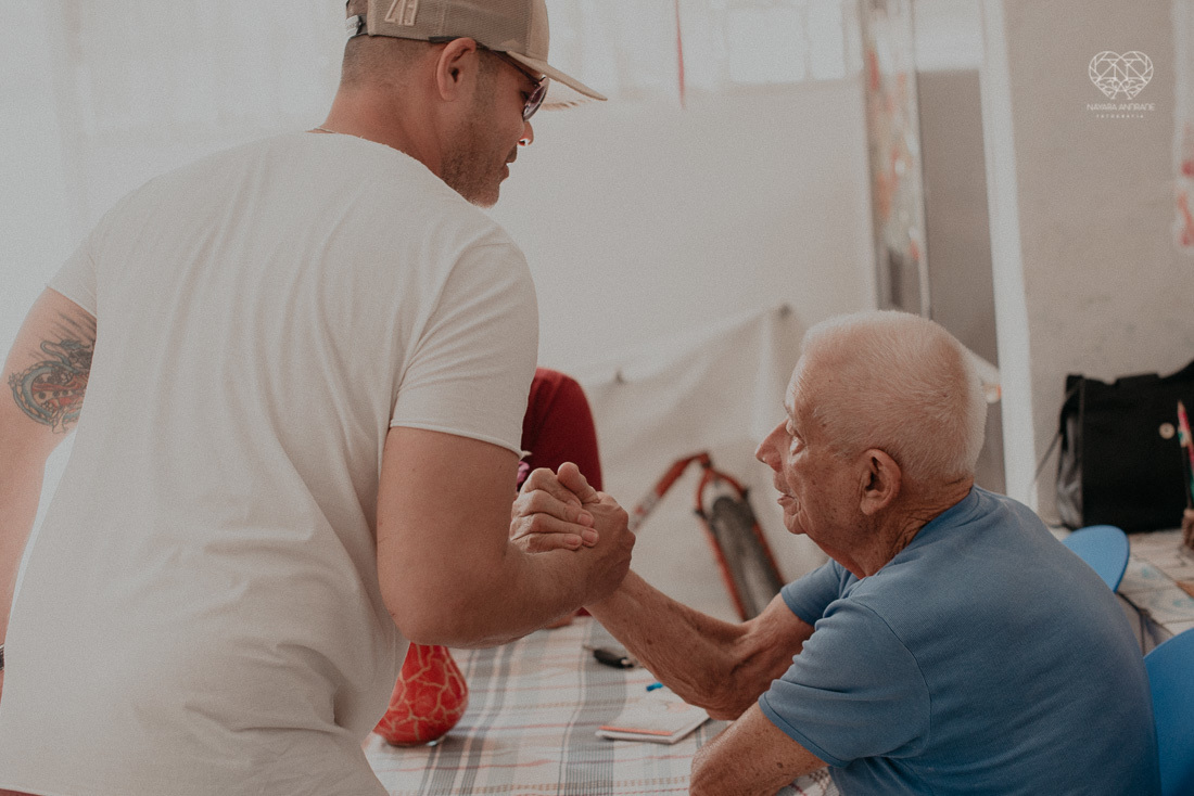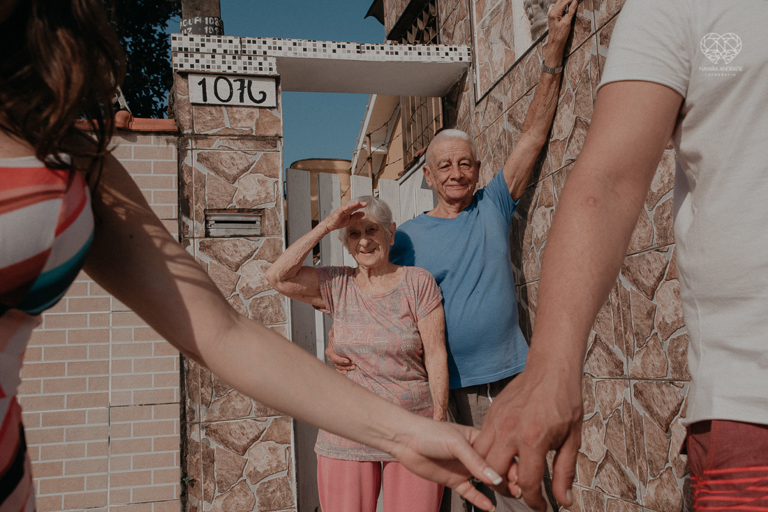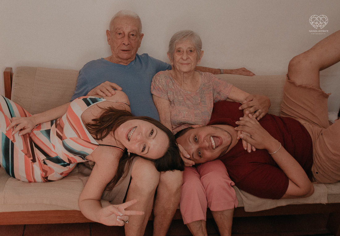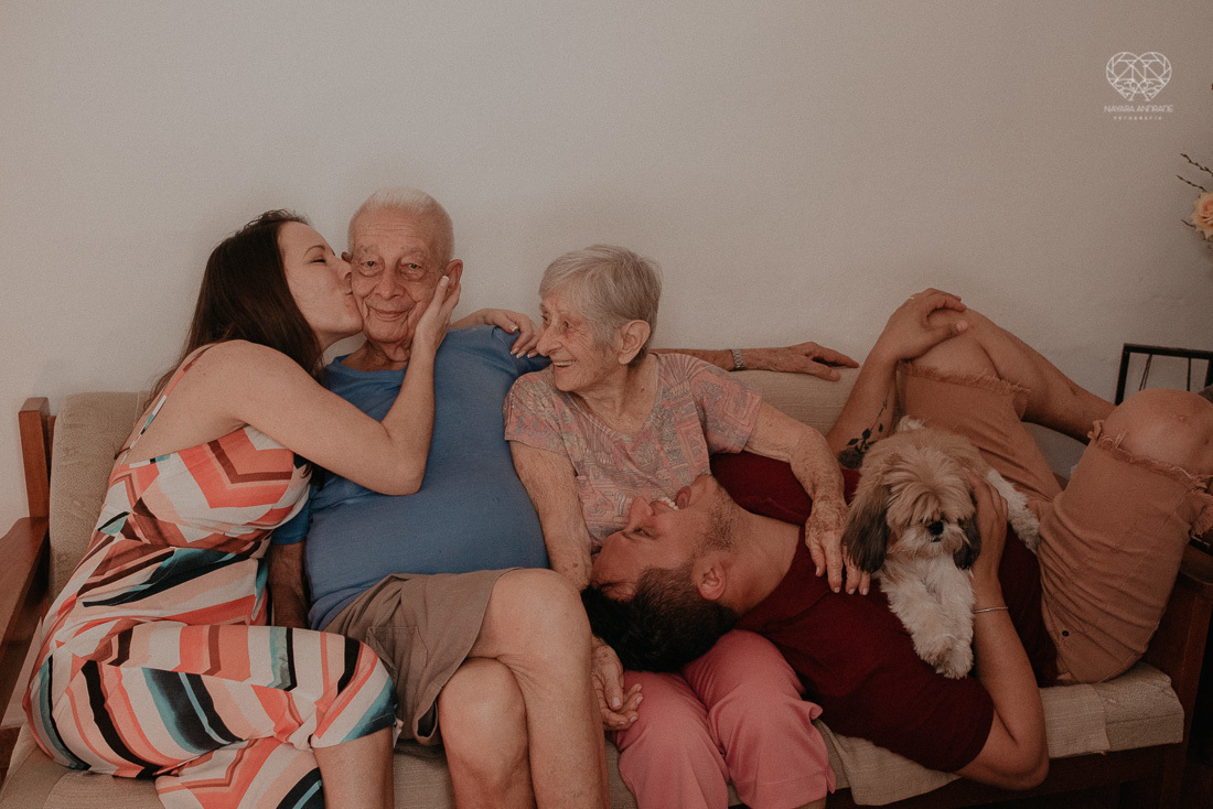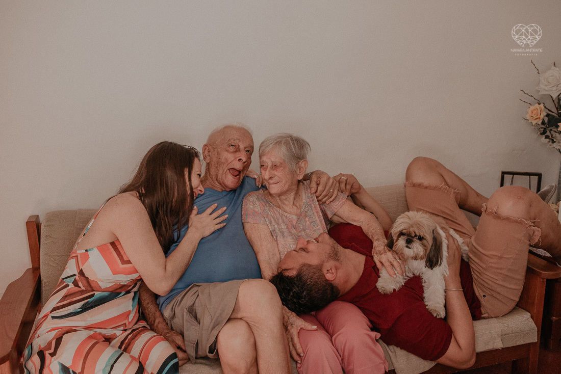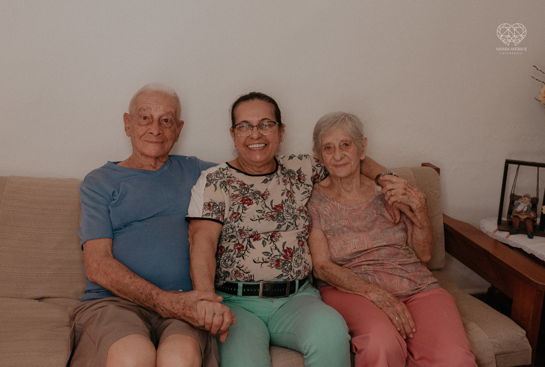 Ensaio de familia contando a historia de um casal com de 67 anos de casados. Senhor e senhora ja de cabelos brancos e rugas de felicidade e fotos com os netos e filha