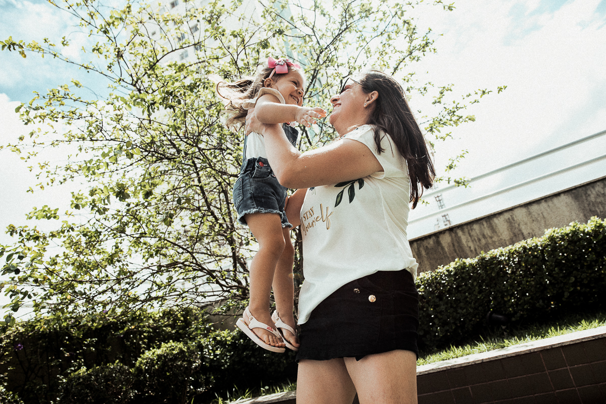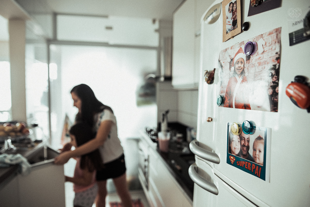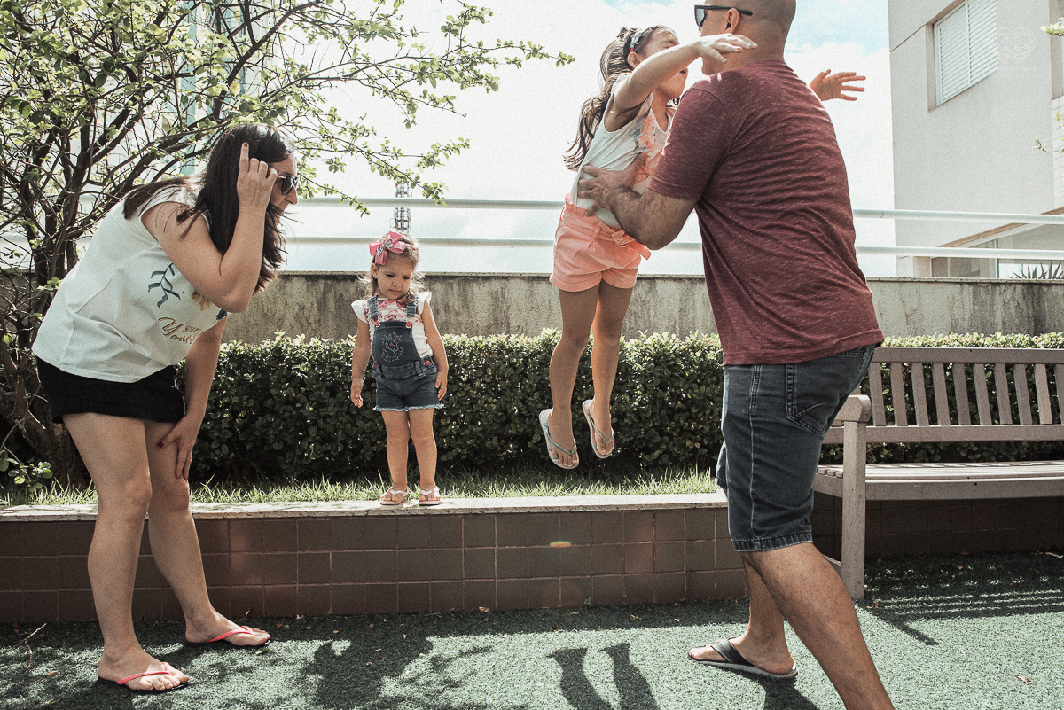 Fotografia de familia fotos feitas em casa ao natural da familia mae pai e duas filhas com pijama acordando brincando no predio. fotos feitas pela fotografa premiada nayara andrade de santos litoral de sao paulo