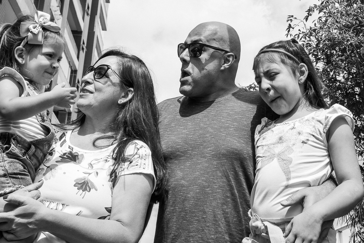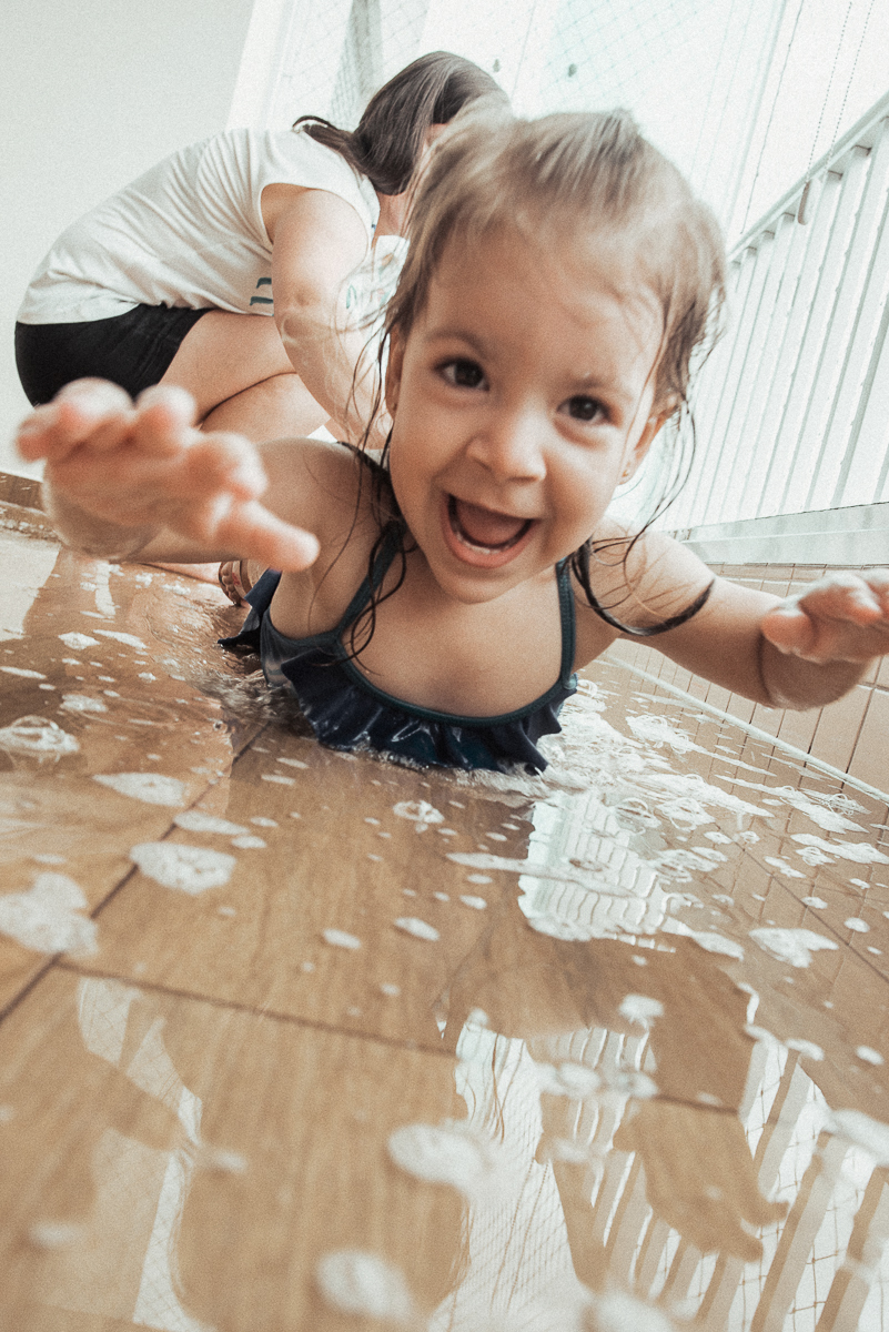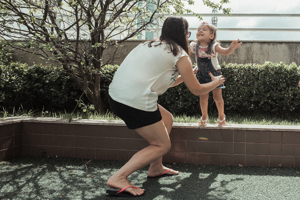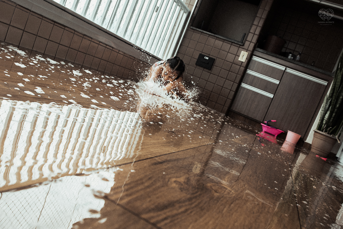 Fotografia de familia fotos feitas em casa ao natural da familia mae pai e duas filhas com pijama acordando brincando no predio. fotos feitas pela fotografa premiada nayara andrade de santos litoral de sao paulo