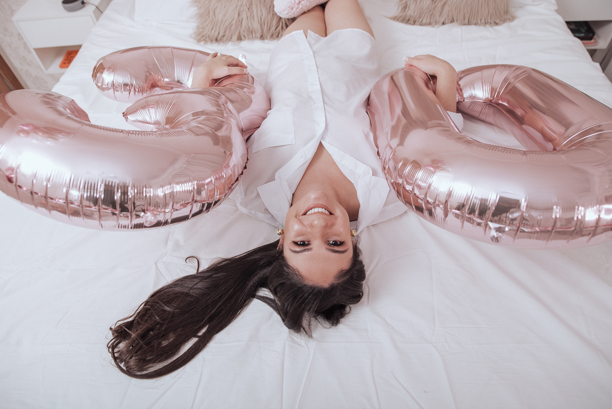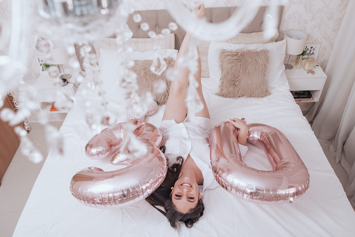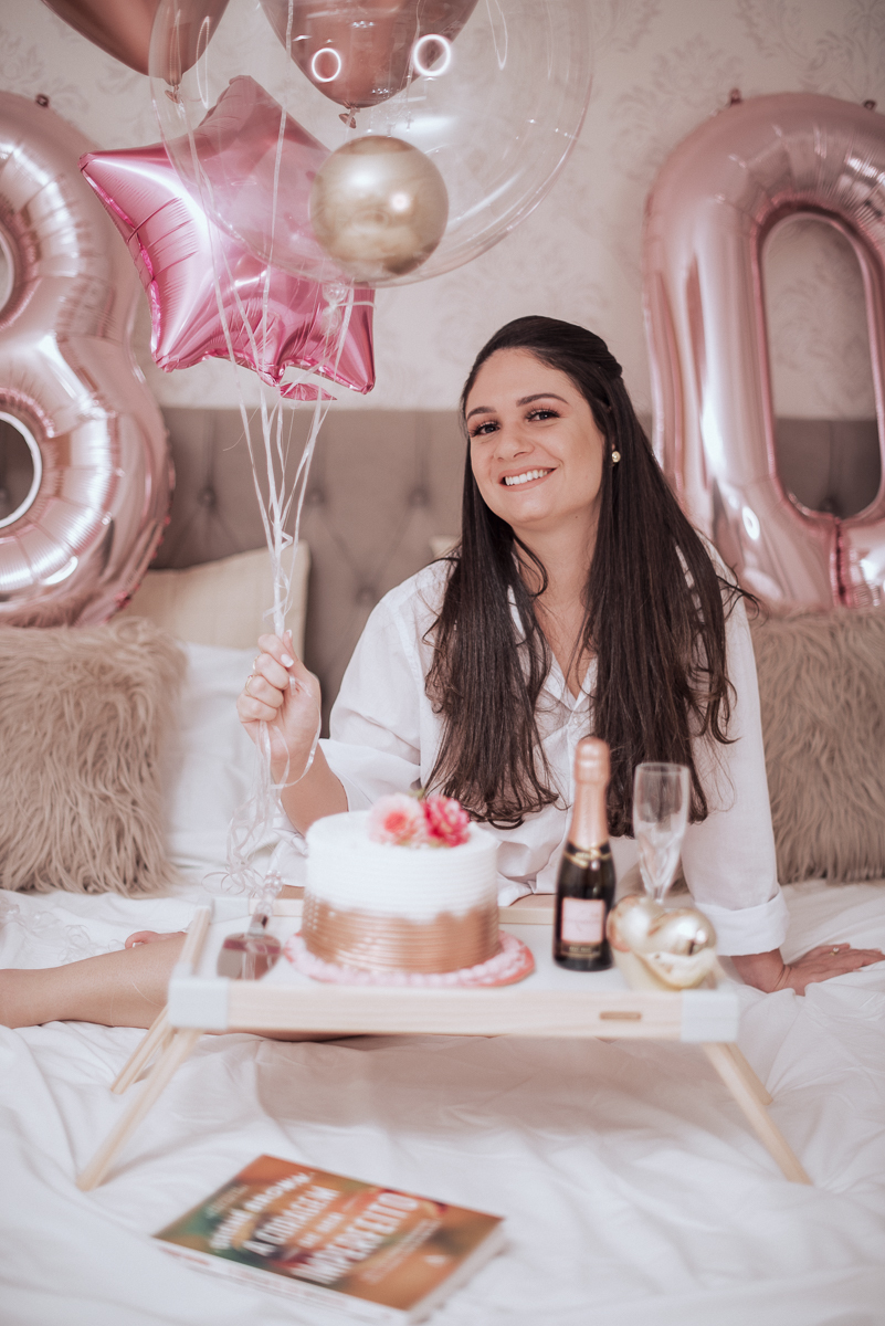 Fotos de mulher comemorando o aniversario no quarto. Ensaio feminino com balão bolo de aniversario tons de rosa e rosado ensaio feito em casa na pandemia pela fotografa premiada nayara andrade em santos guaruja