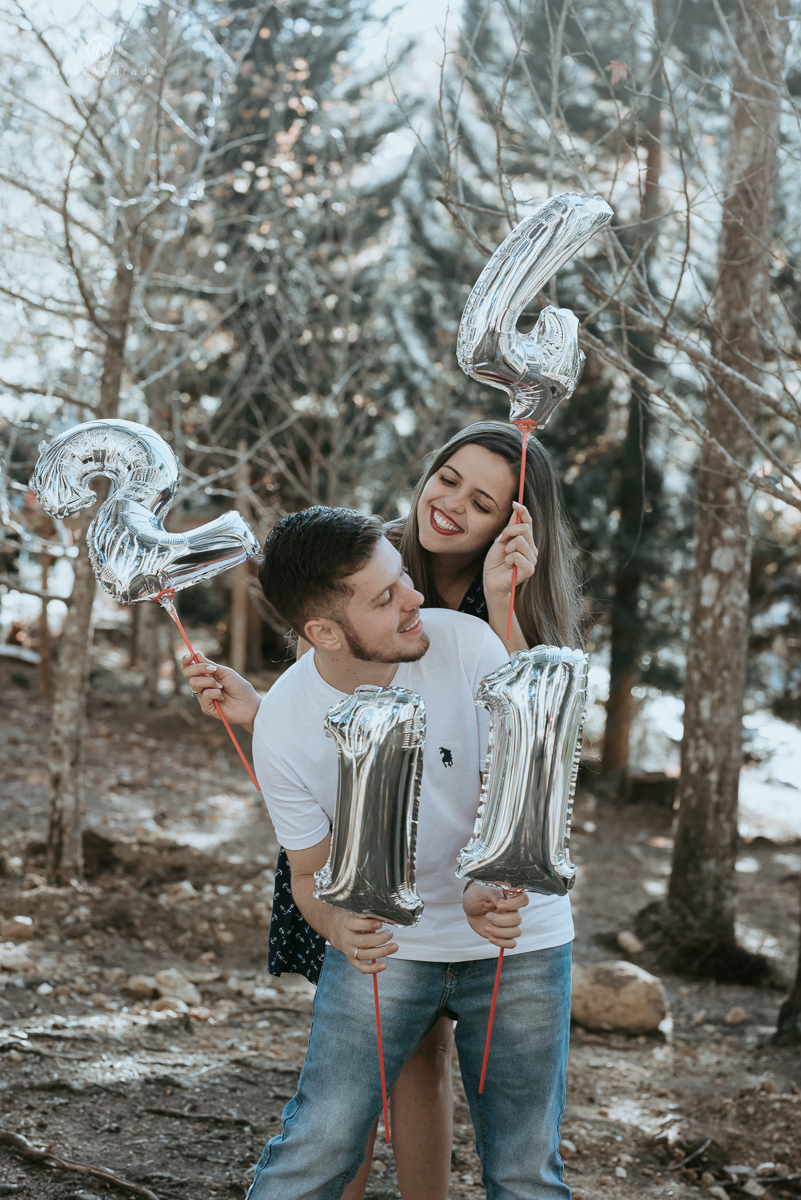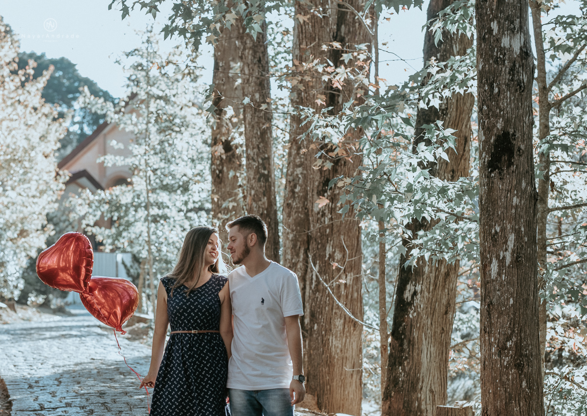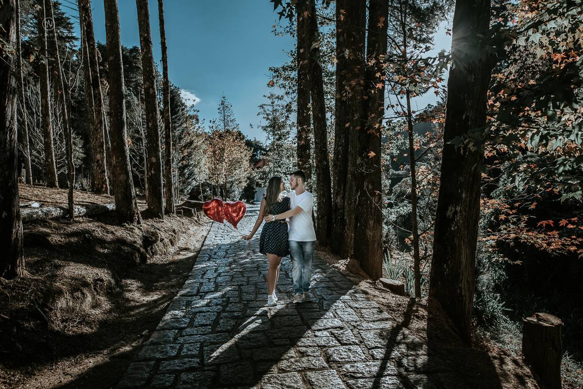 Ensaio casal fim de tarde em campos do Jordão nas folhas, arvores e muito amor envolvido. Balão de coração e data