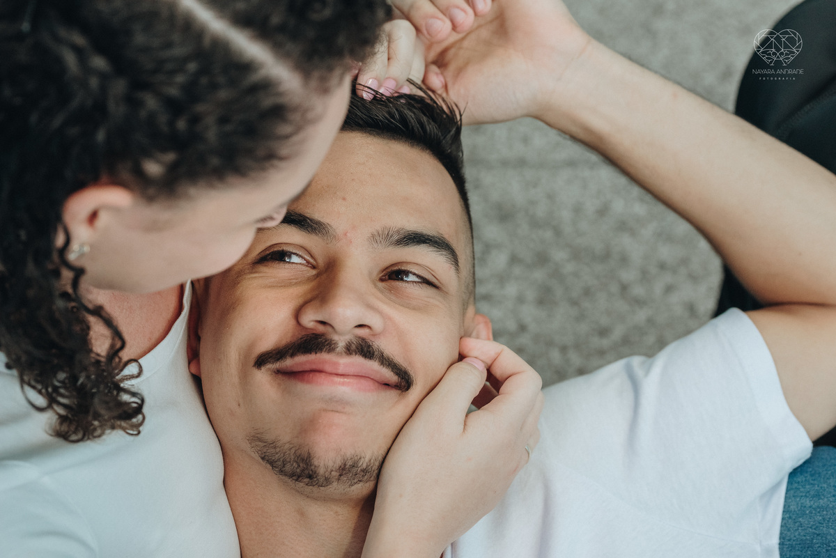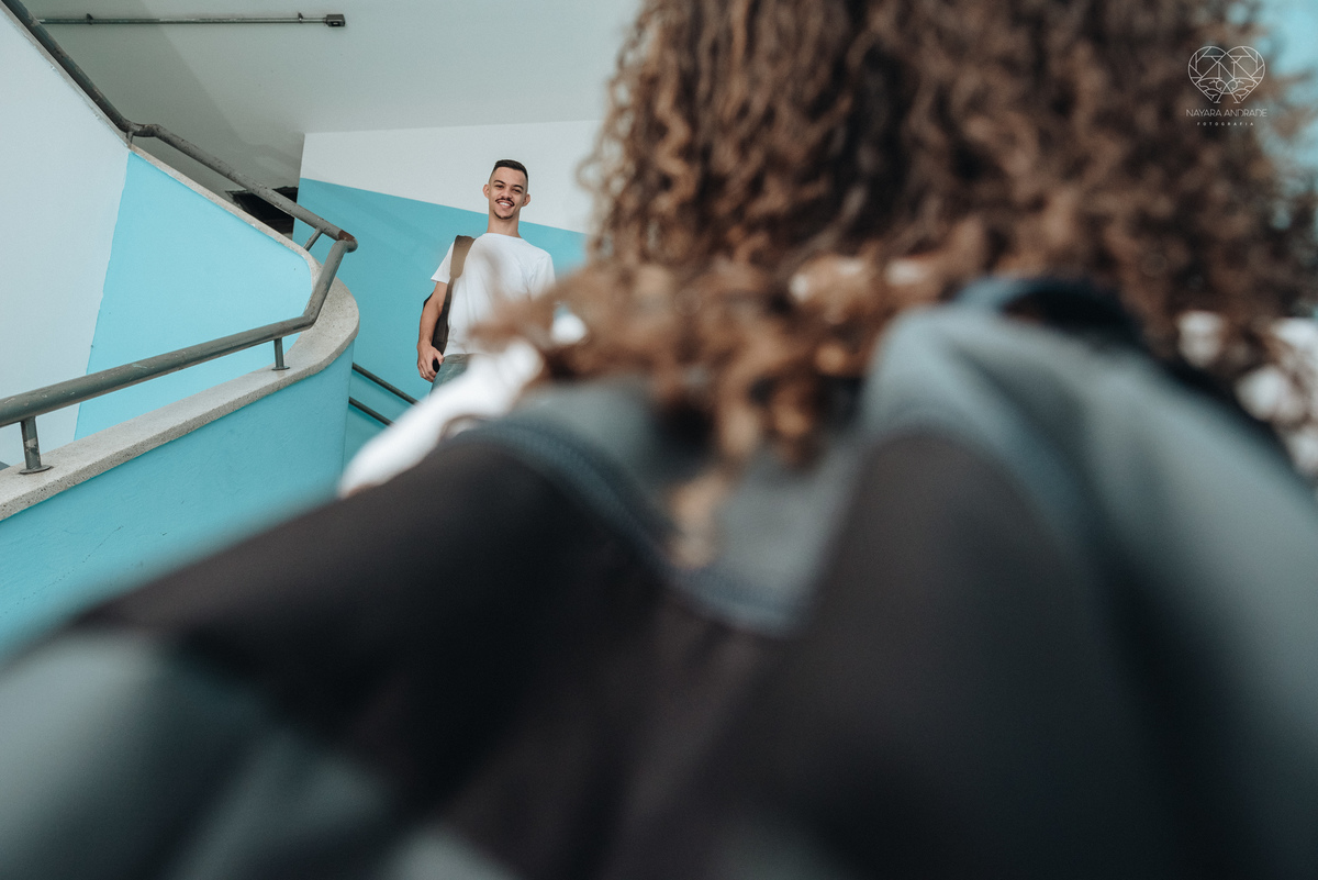 Ensaio pre wedding ensaio casal feito na escola com uniforme escolar blusa branca e calça jeans