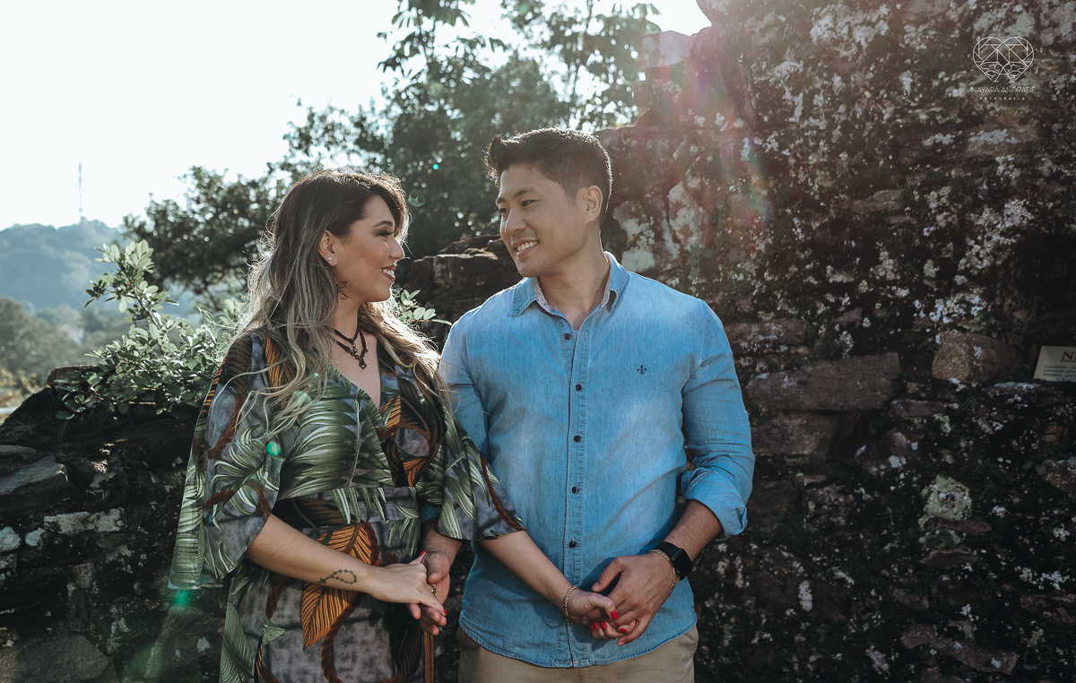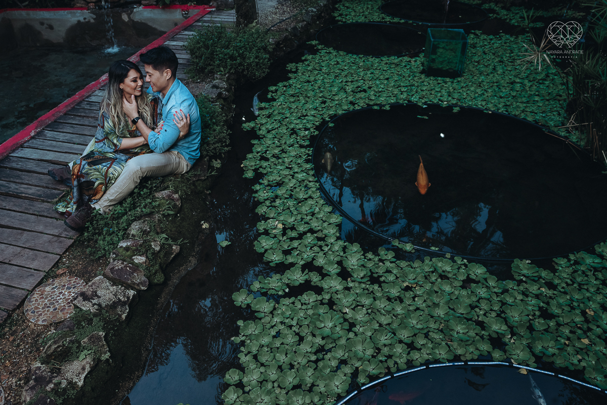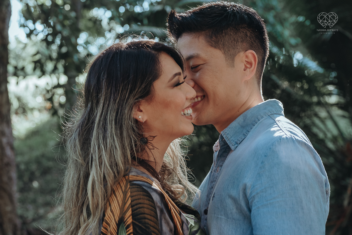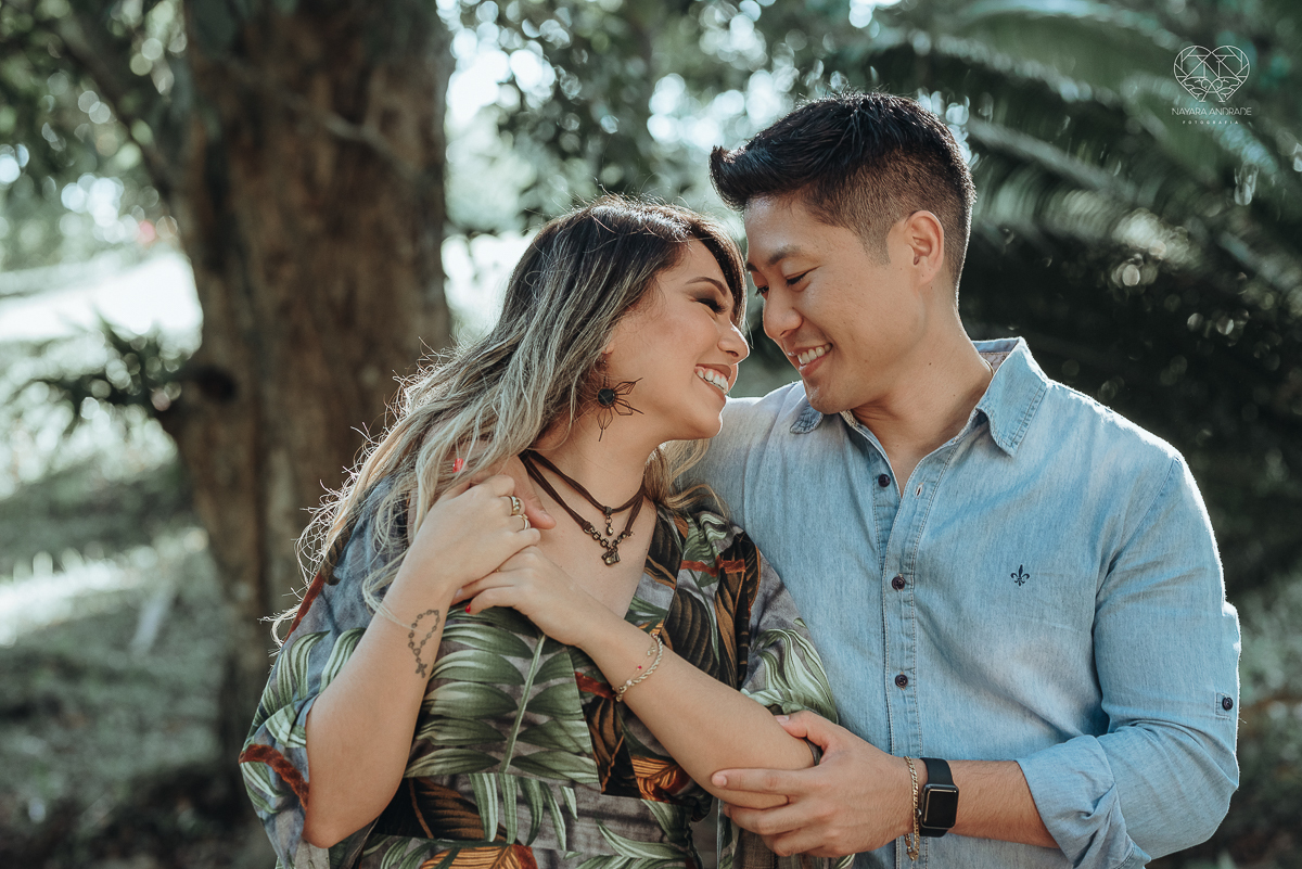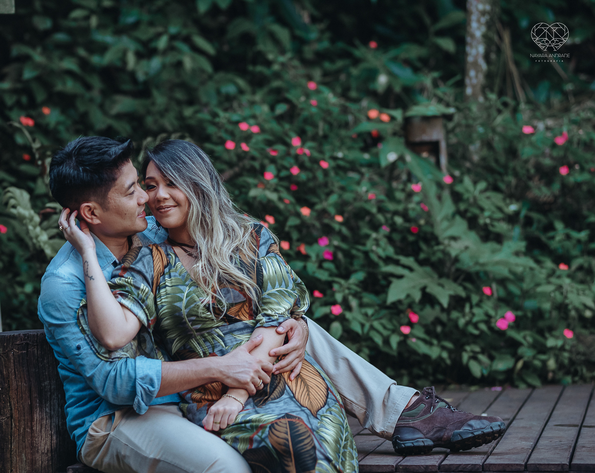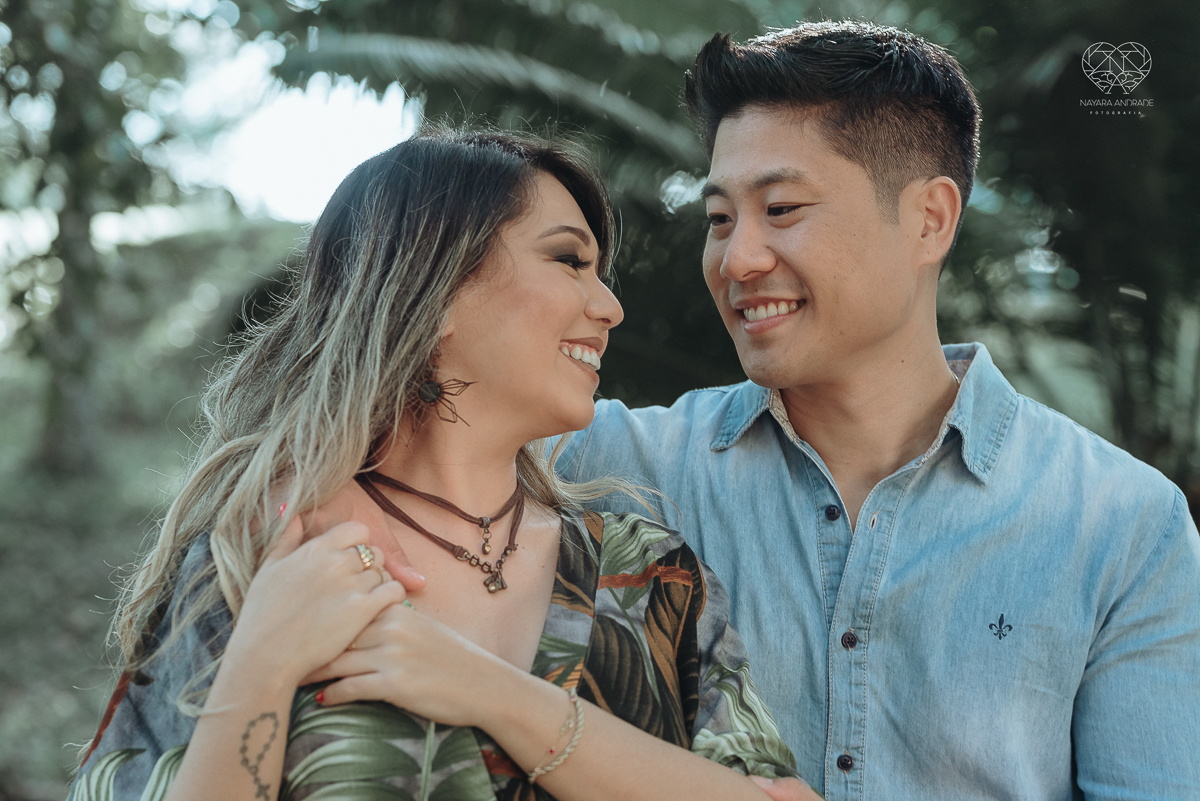 Ensaio pre wedding de casal japones niponico feito em itariri em sao paulo pela fotografa premiada nayara andrade. Noivo de camisa jeans e noiva de roupa florida