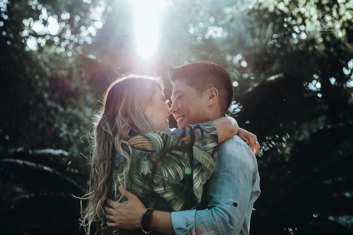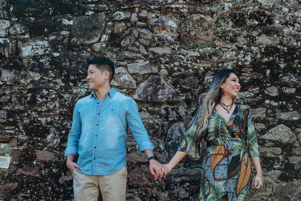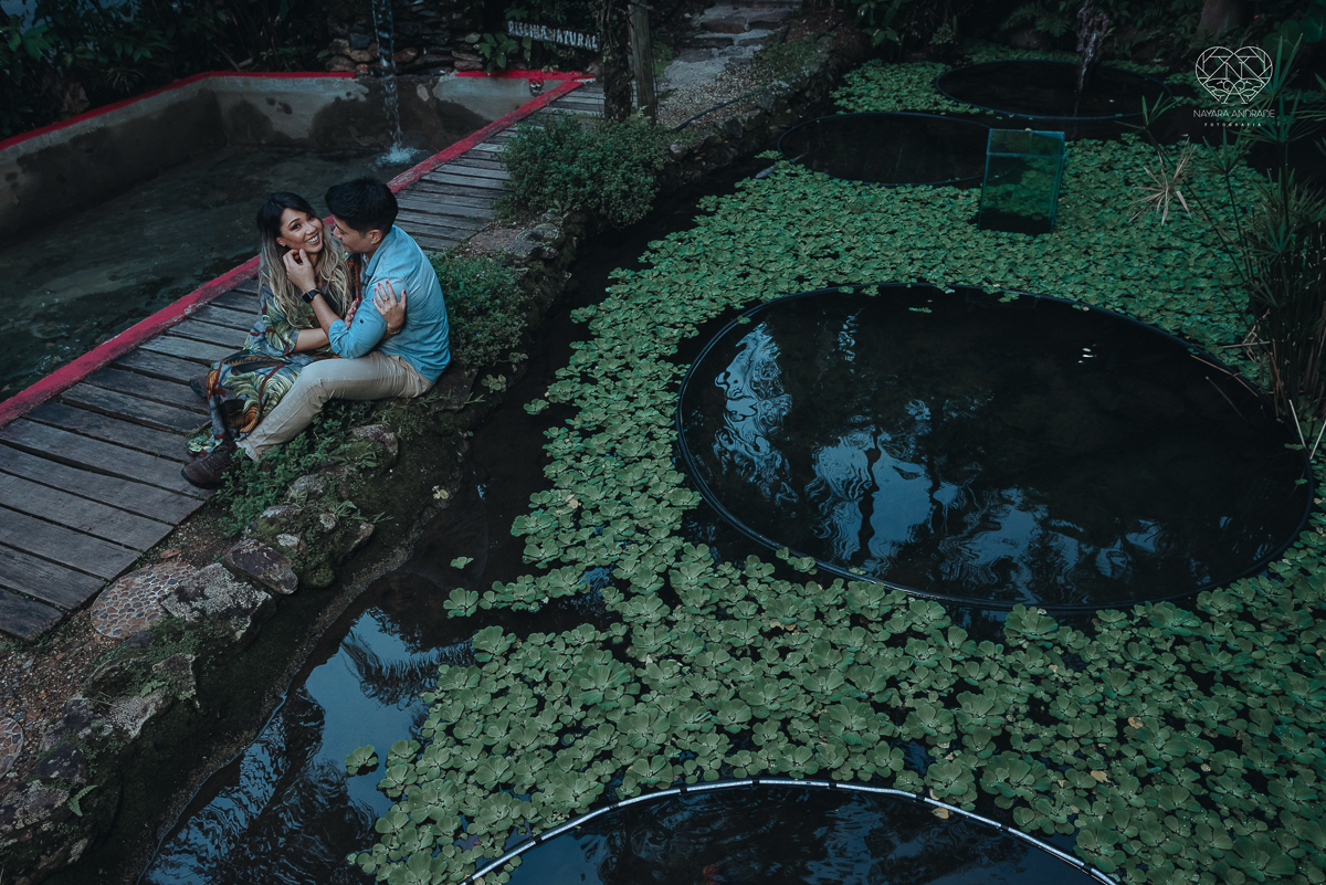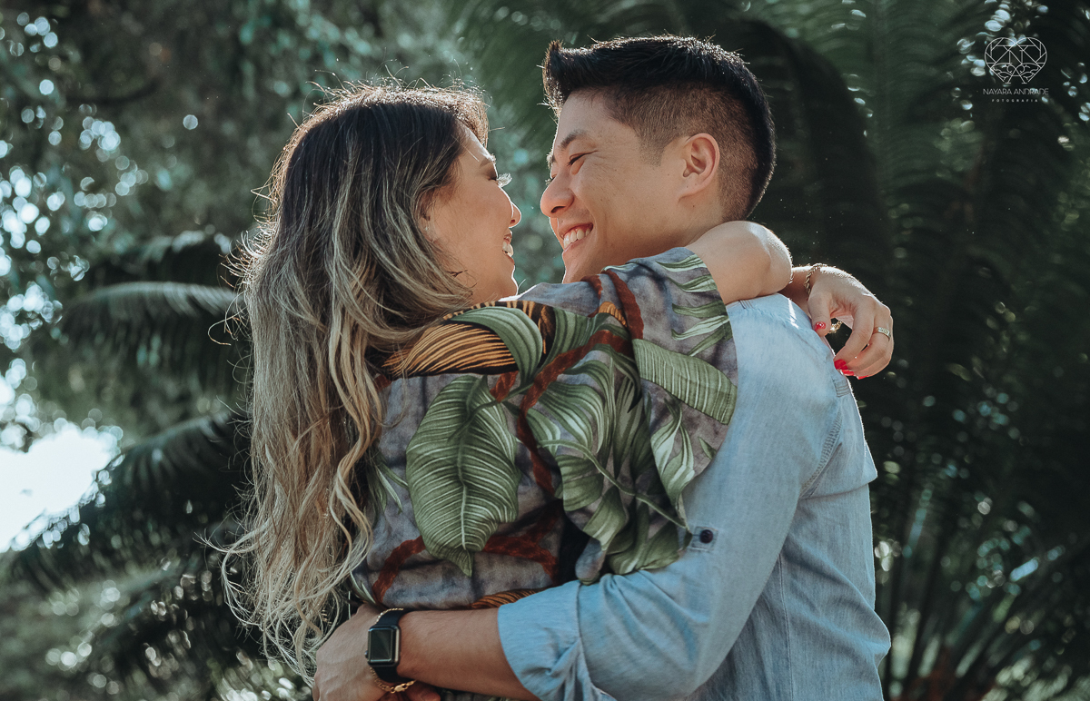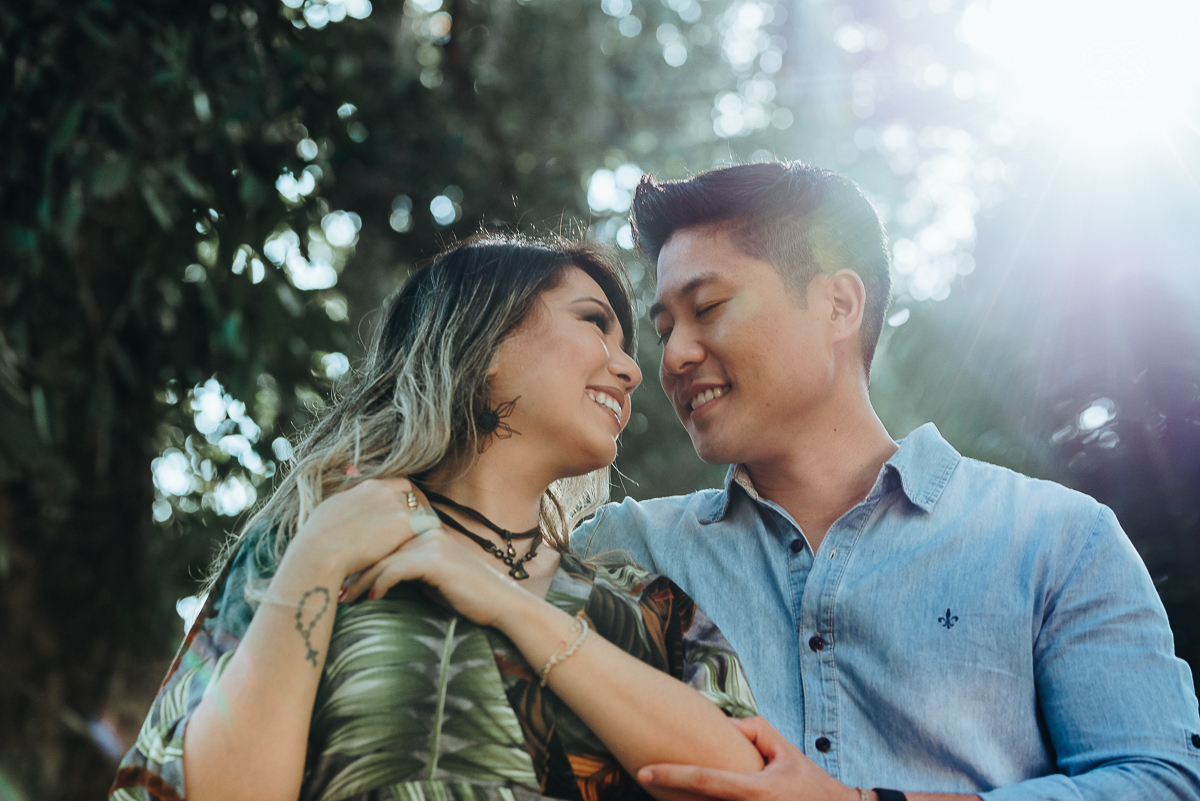 Ensaio pre wedding de casal japones niponico feito em itariri em sao paulo pela fotografa premiada nayara andrade. Noivo de camisa jeans e noiva de roupa florida