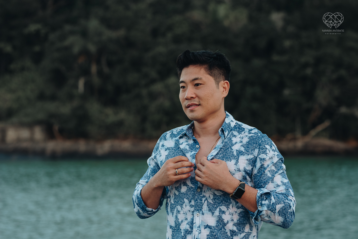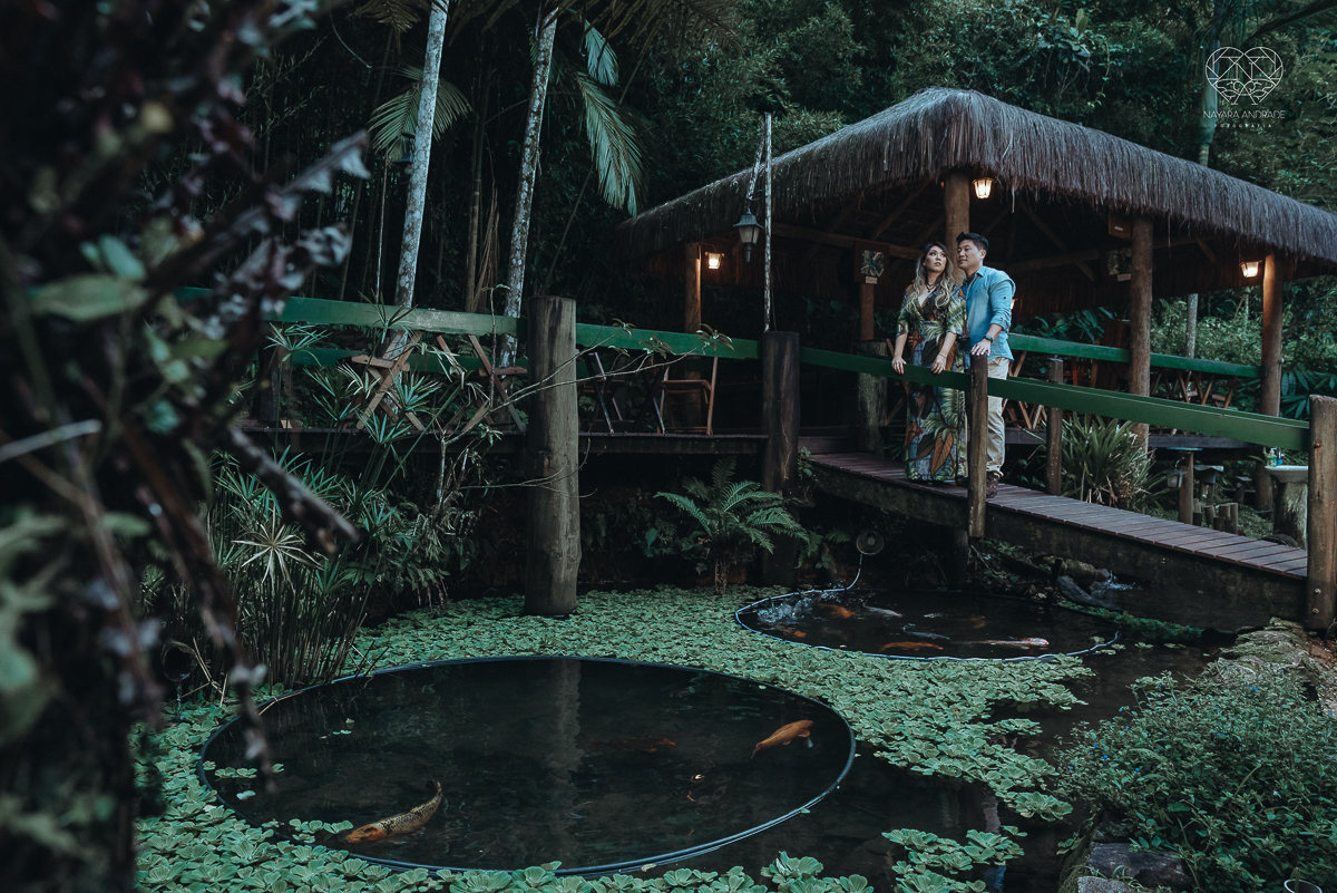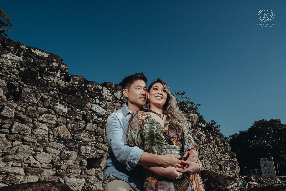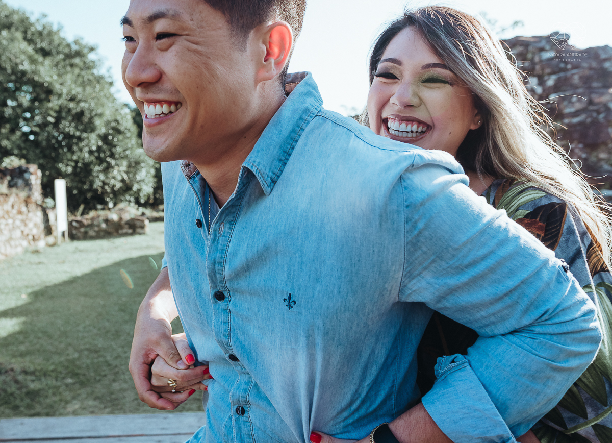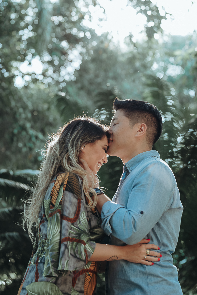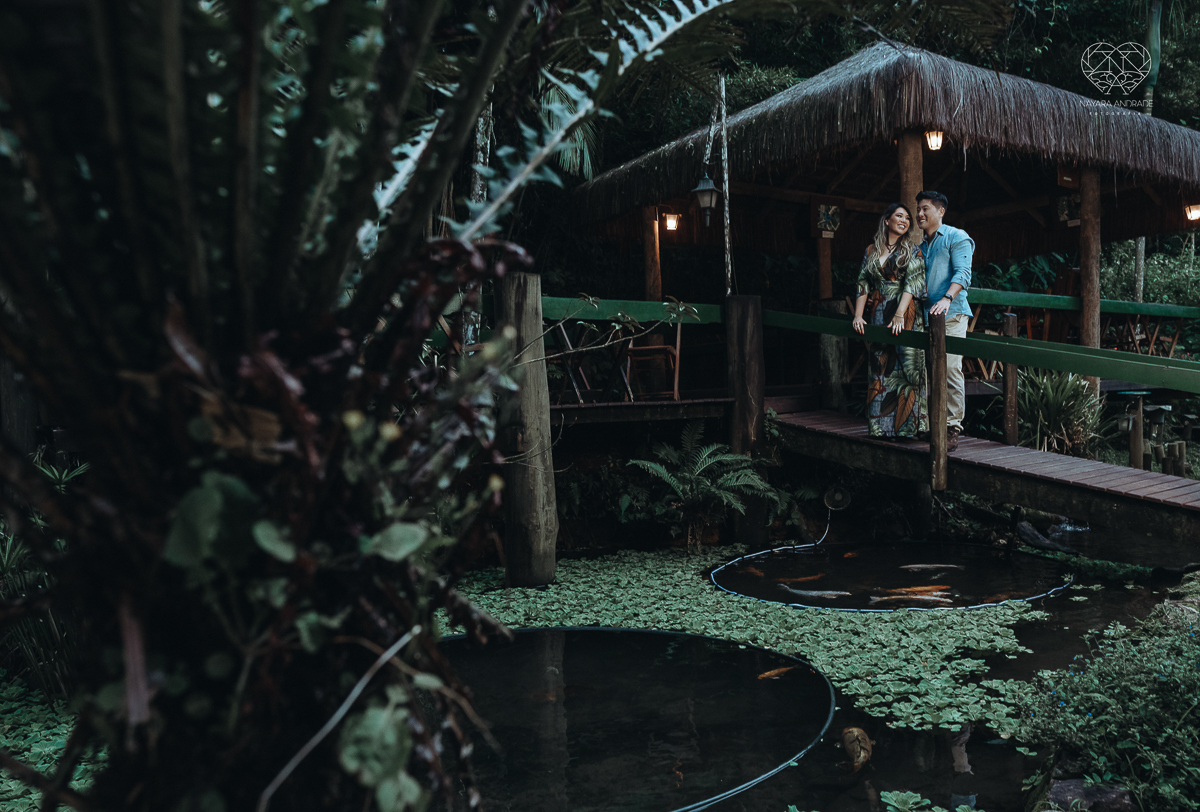 Ensaio pre wedding de casal japones niponico feito em itariri em sao paulo pela fotografa premiada nayara andrade. Noivo de camisa jeans e noiva de roupa florida