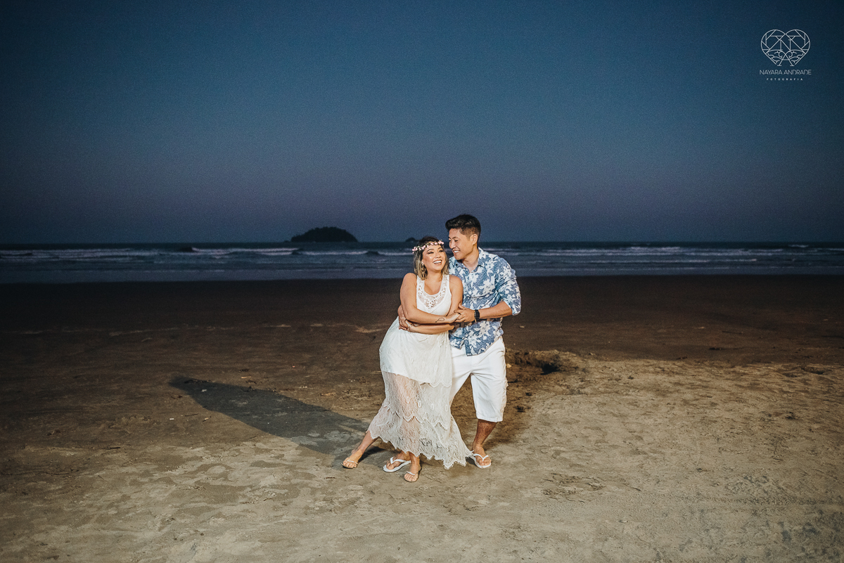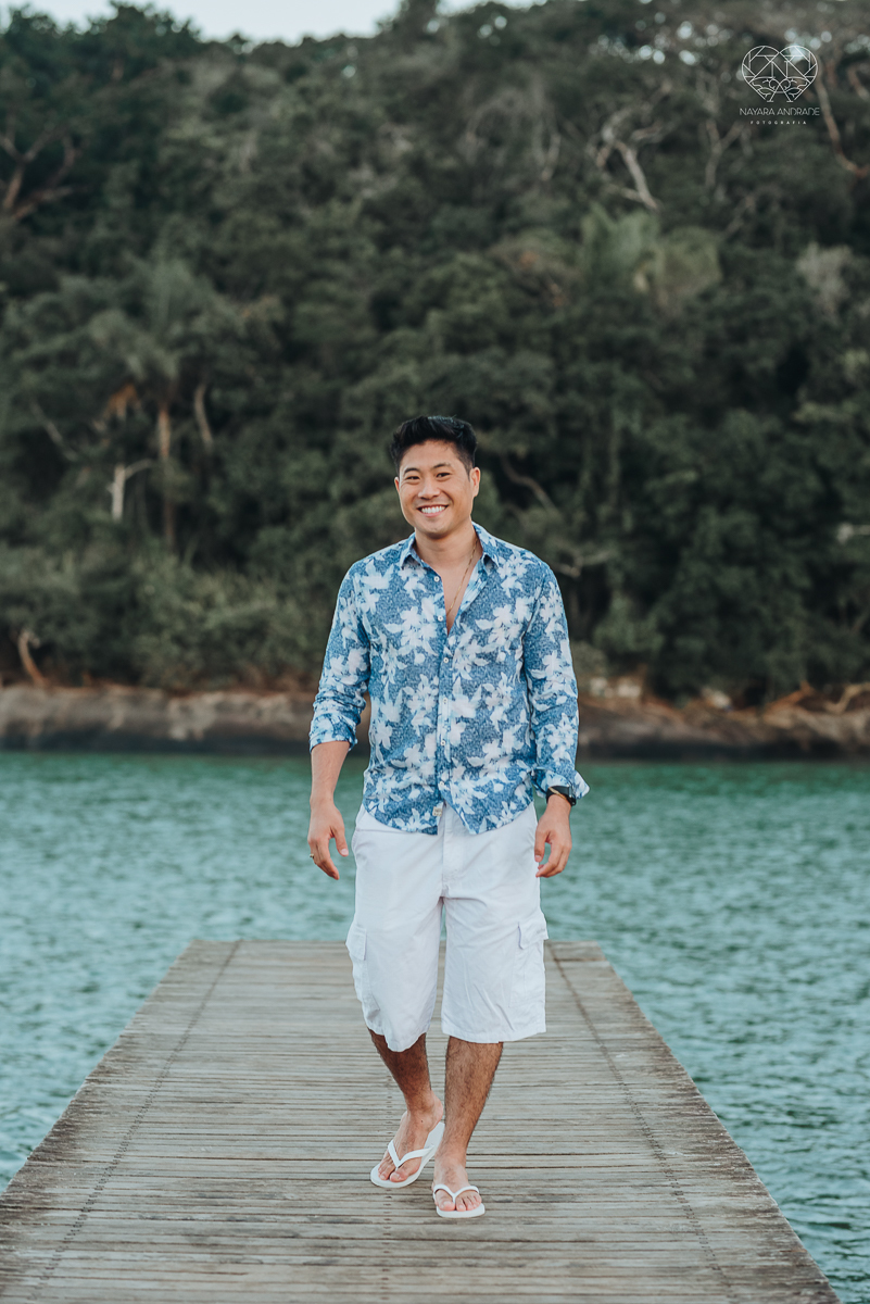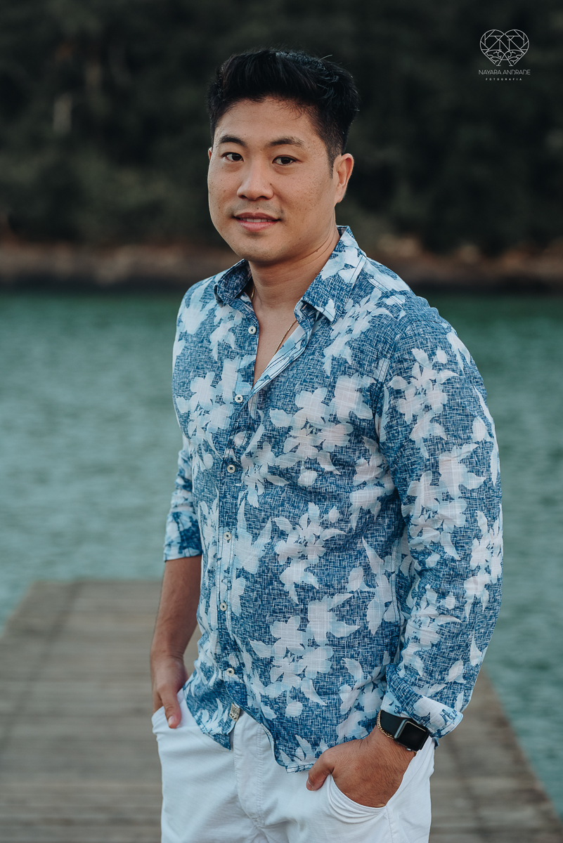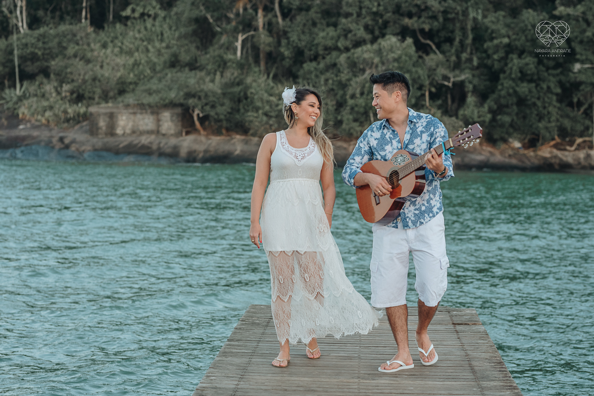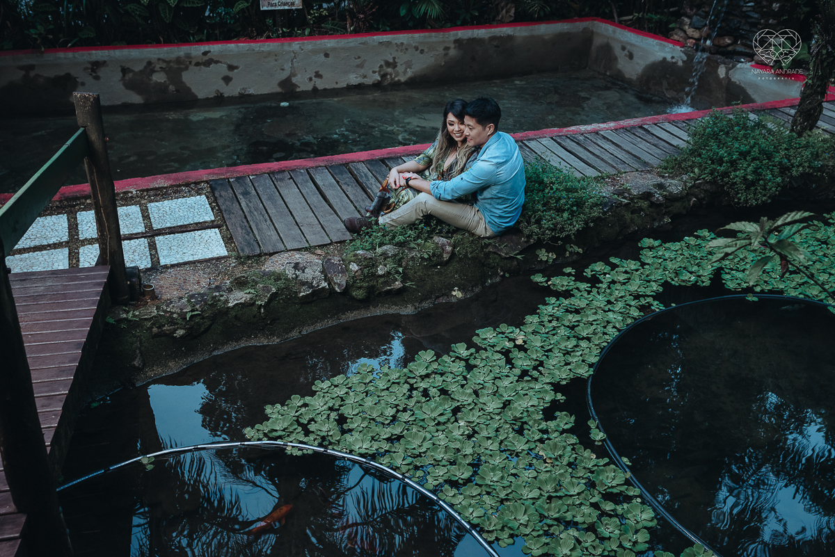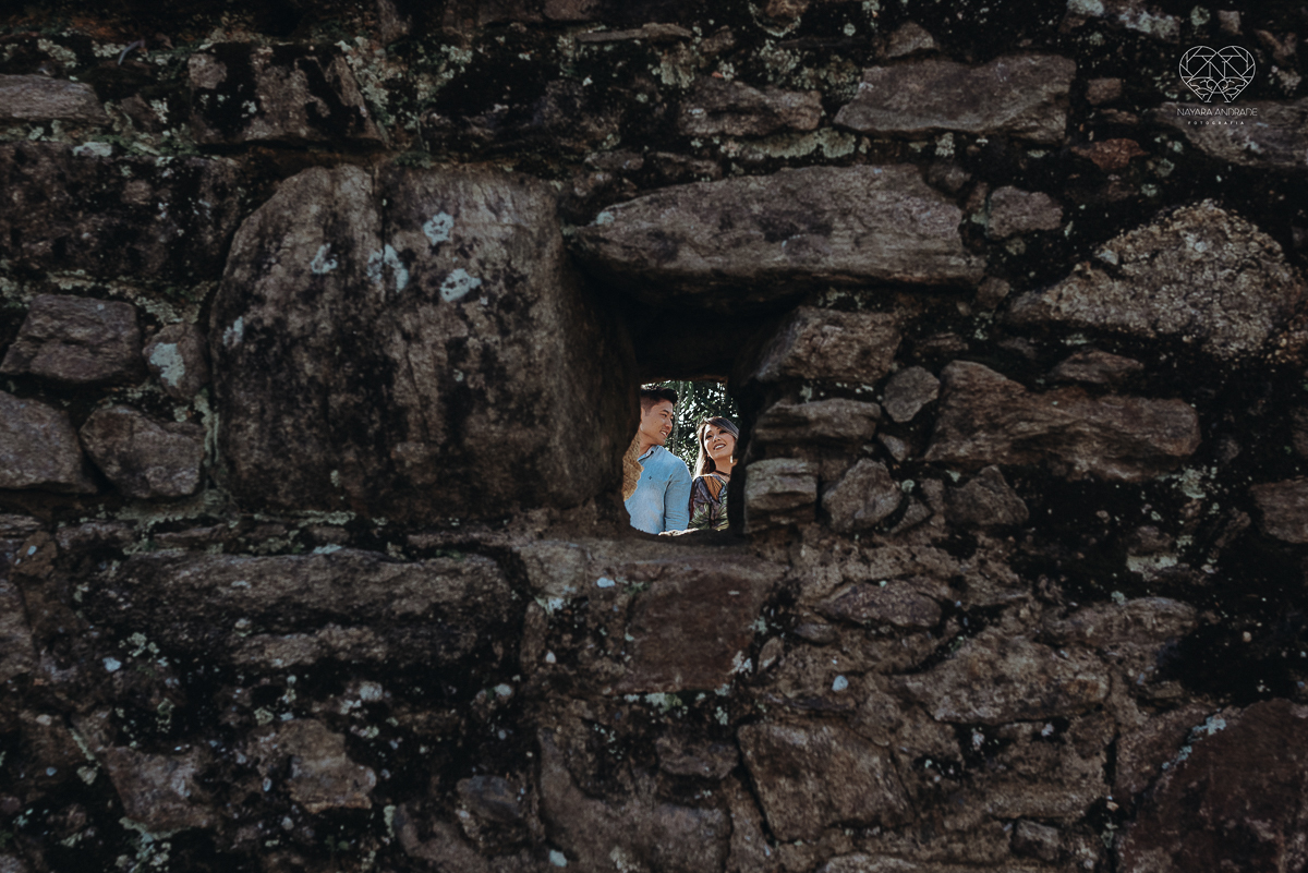 Ensaio pre wedding de casal japones niponico feito em itariri em sao paulo pela fotografa premiada nayara andrade. Noivo de camisa jeans e noiva de roupa florida