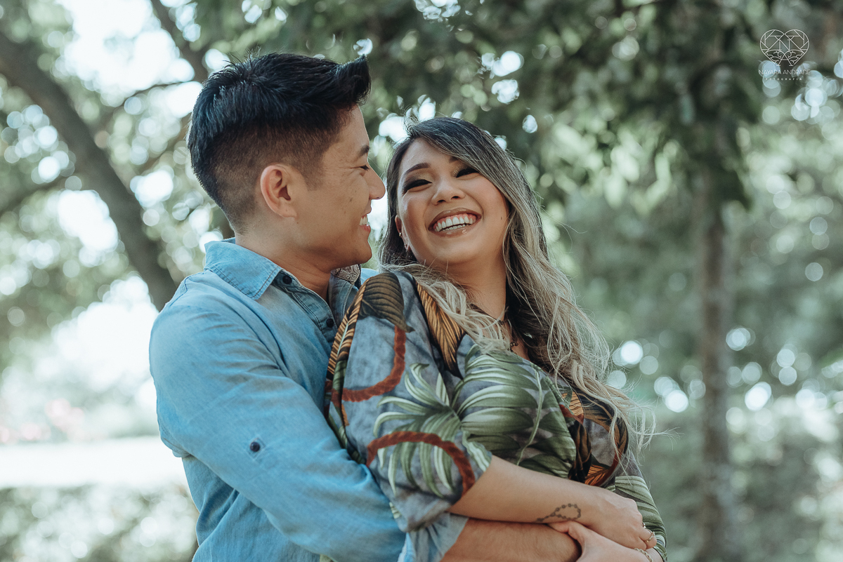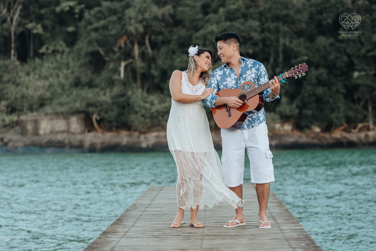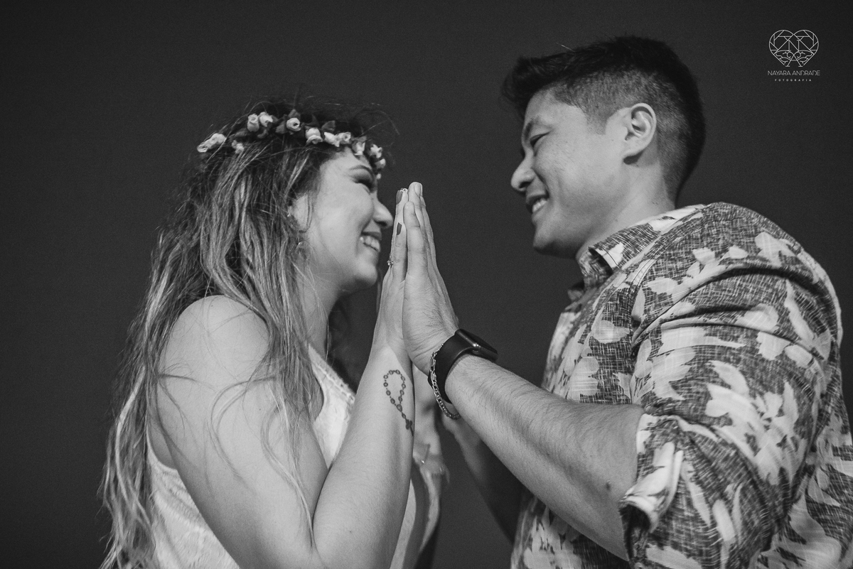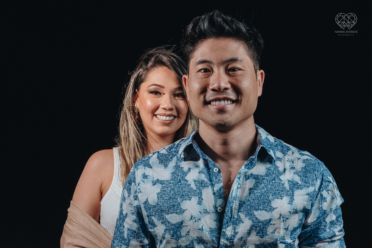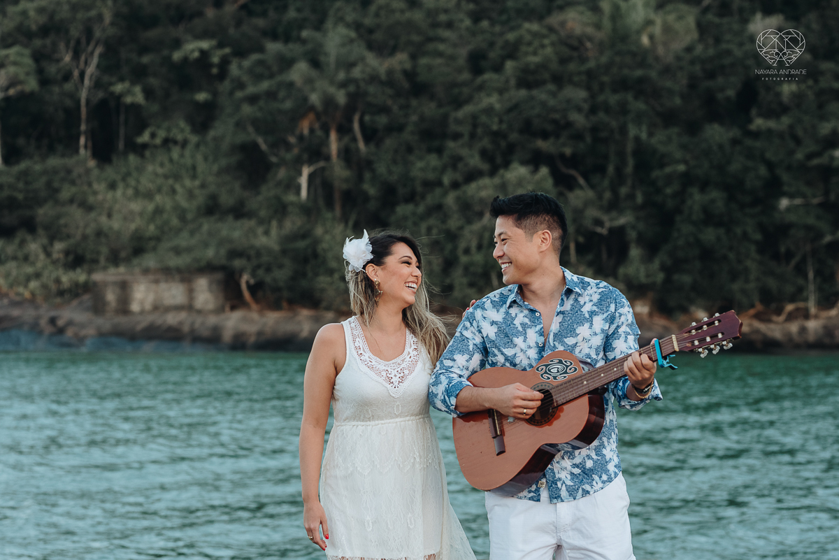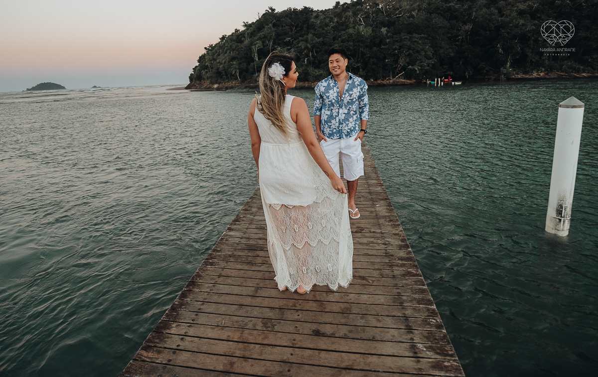Ensaio pre wedding de casal japones niponico feito em itariri em sao paulo pela fotografa premiada nayara andrade. Noivo de camisa jeans e noiva de roupa florida