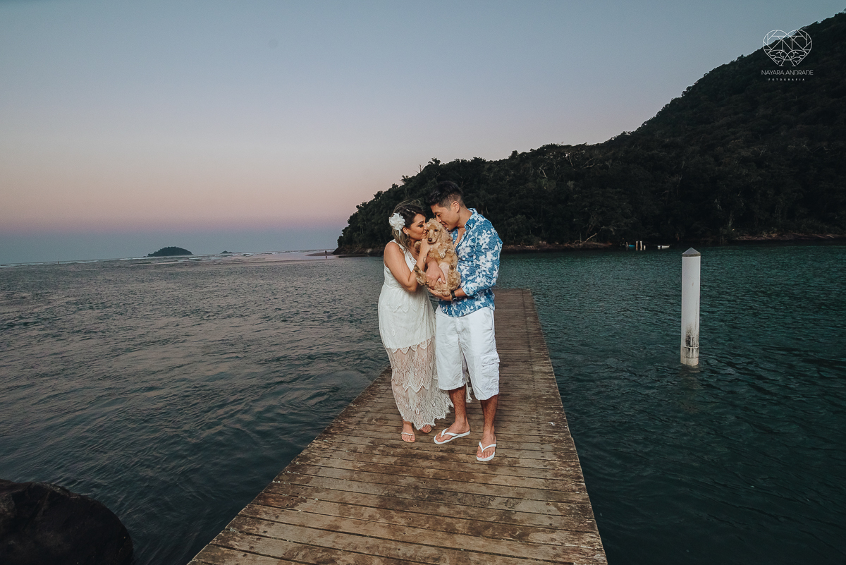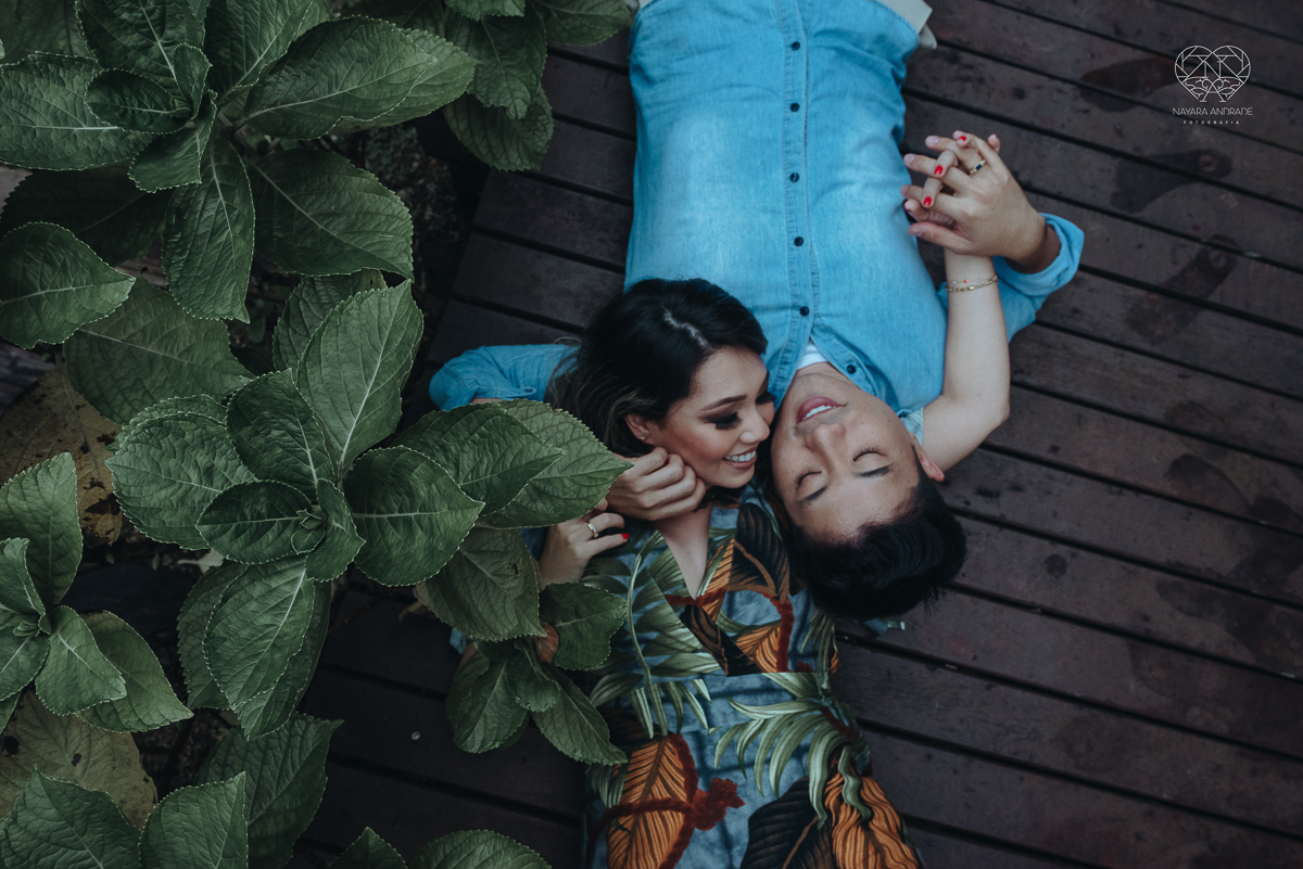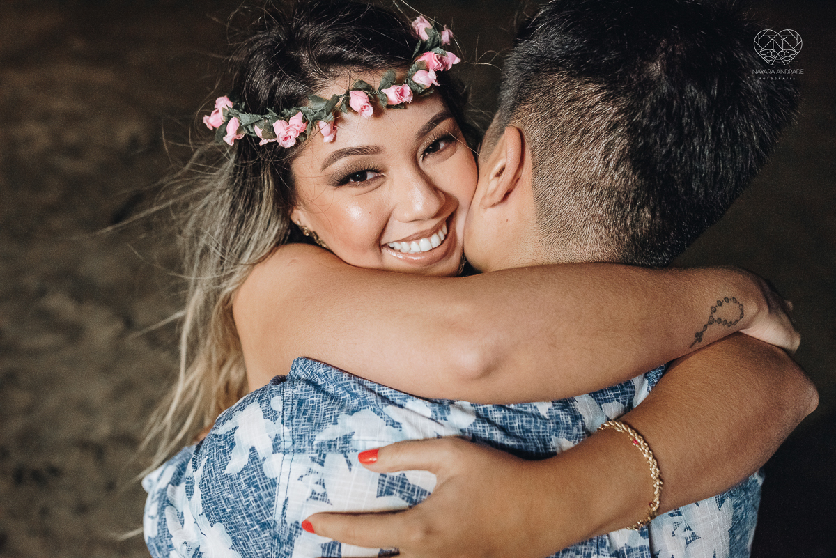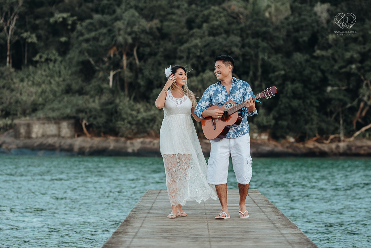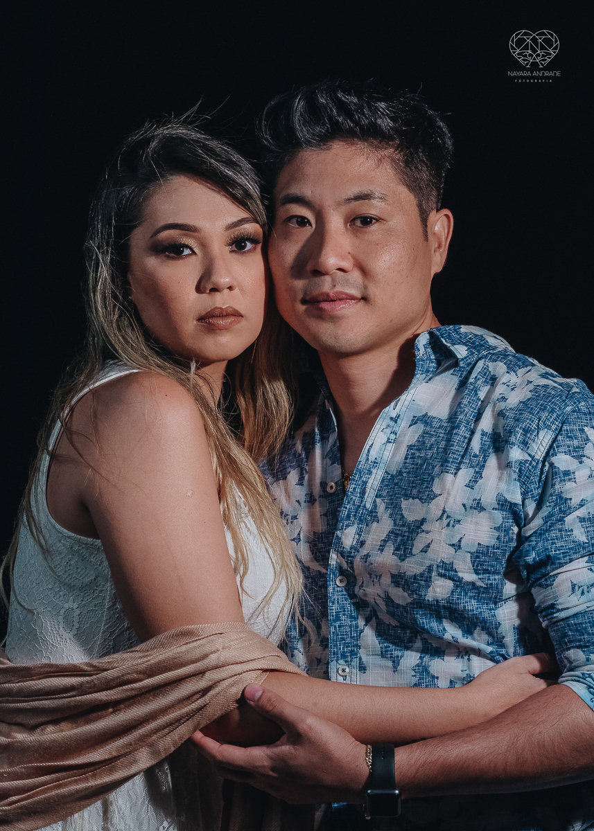 Ensaio pre wedding de casal japones niponico feito em itariri em sao paulo pela fotografa premiada nayara andrade. Noivo de camisa jeans e noiva de roupa florida