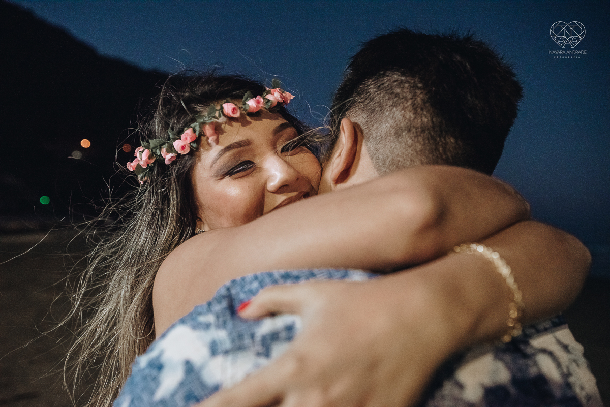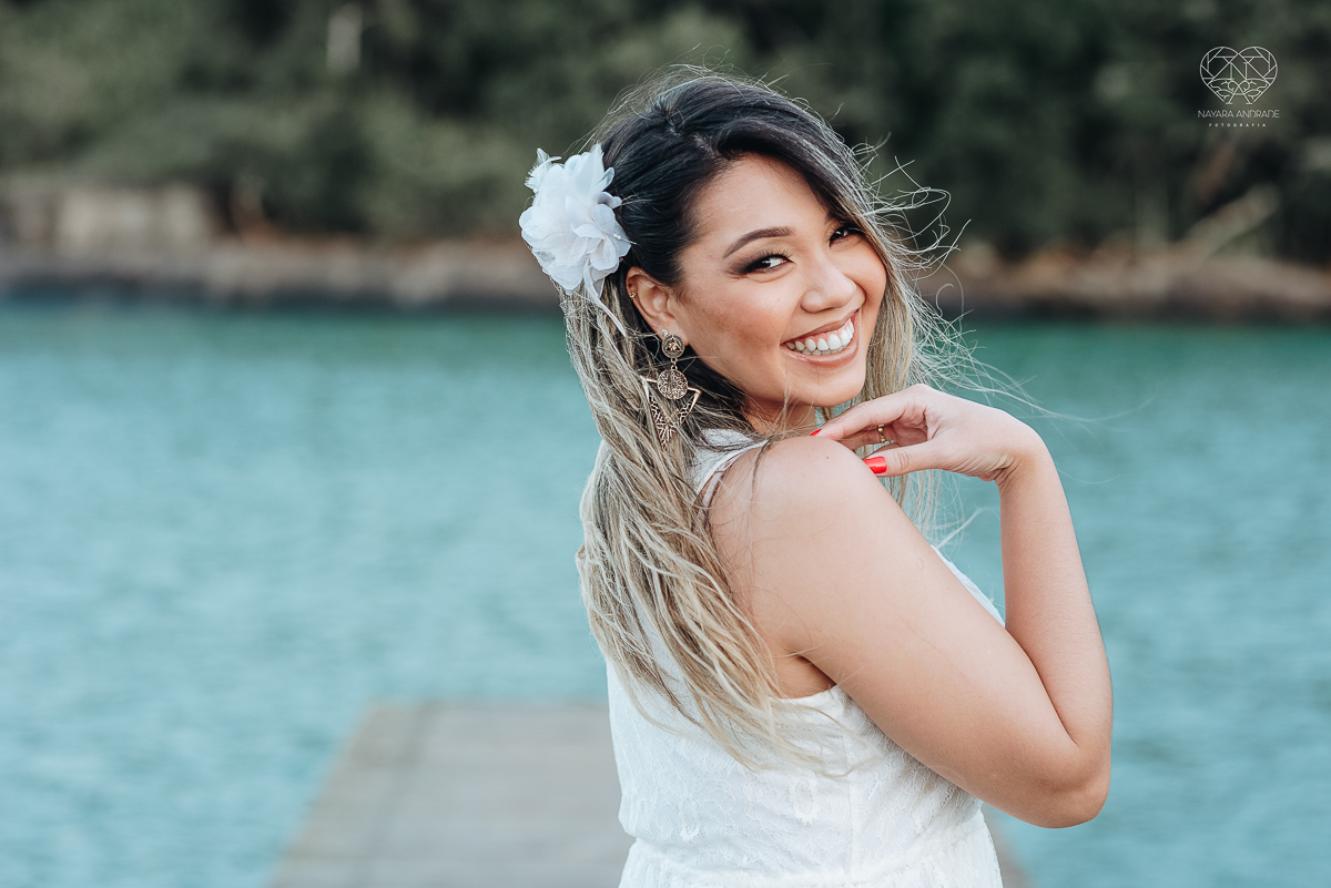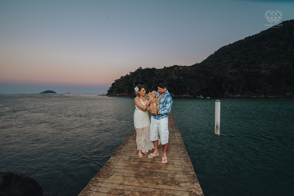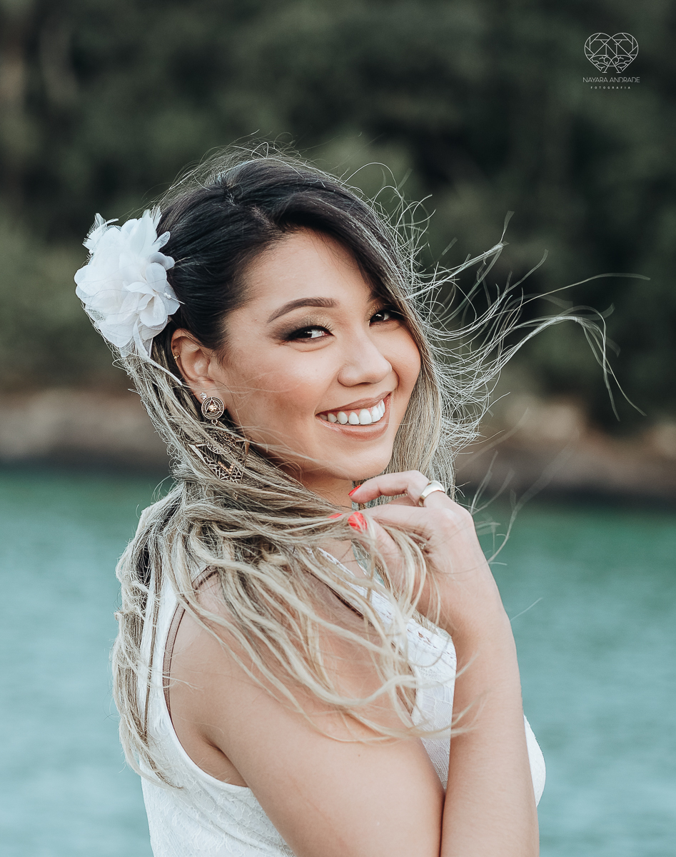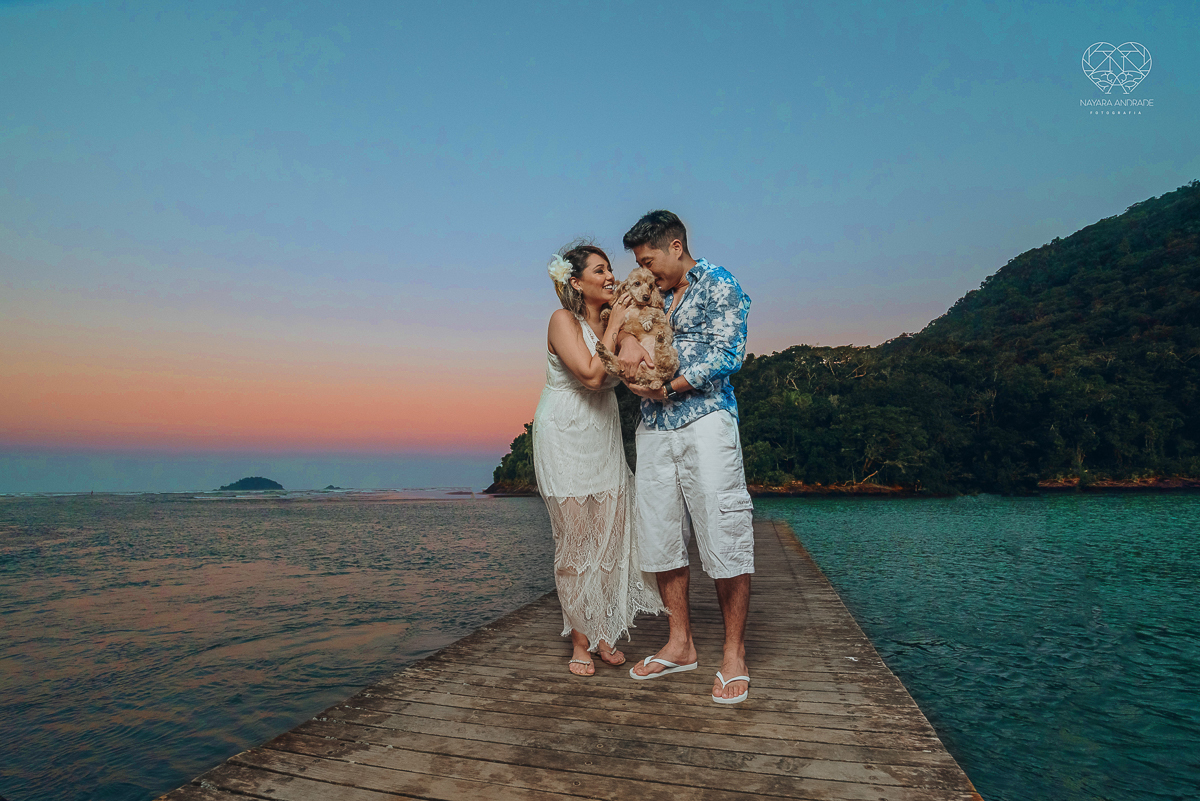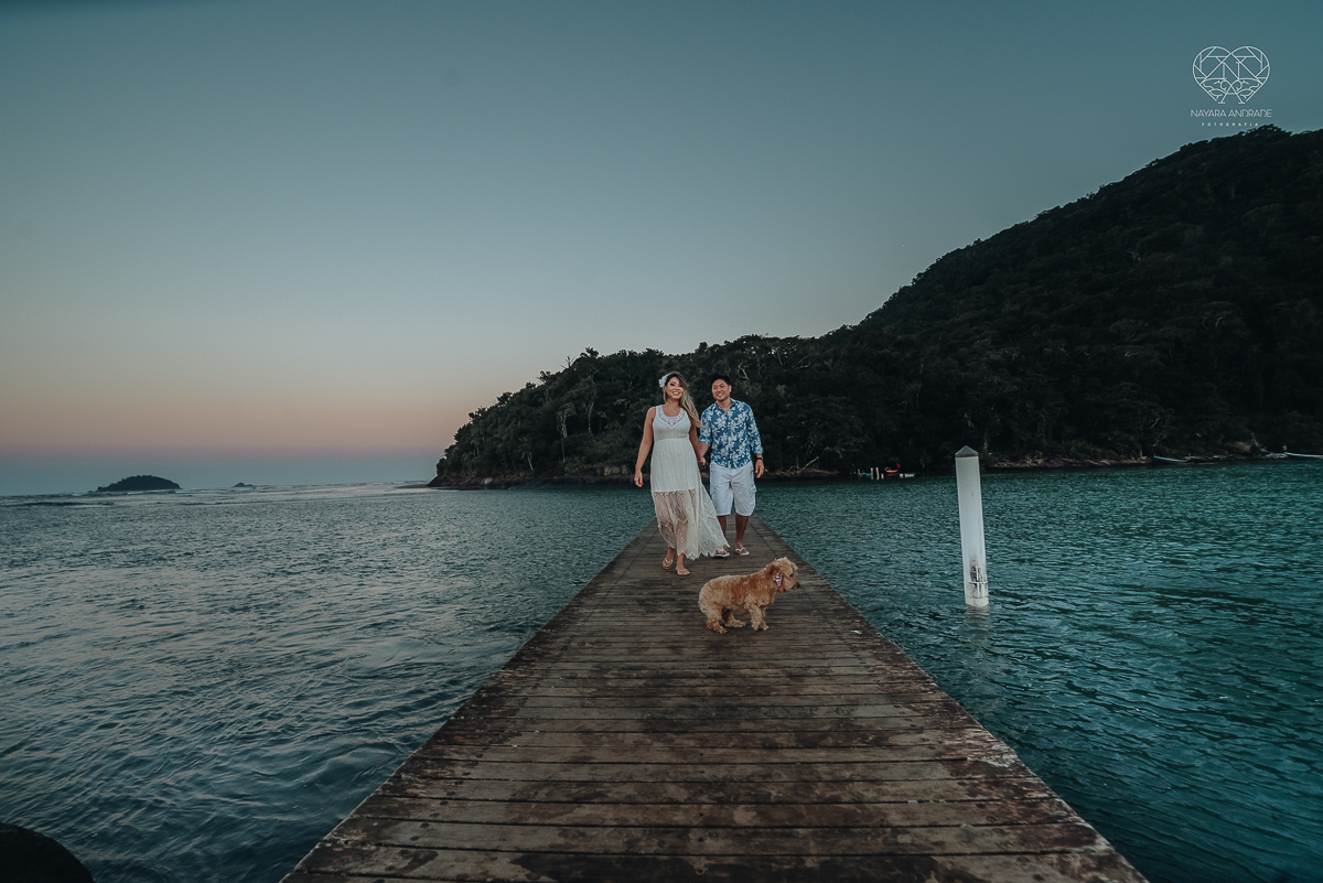 Ensaio pre wedding de casal japones niponico feito em itariri em sao paulo pela fotografa premiada nayara andrade. Noivo de camisa jeans e noiva de roupa florida